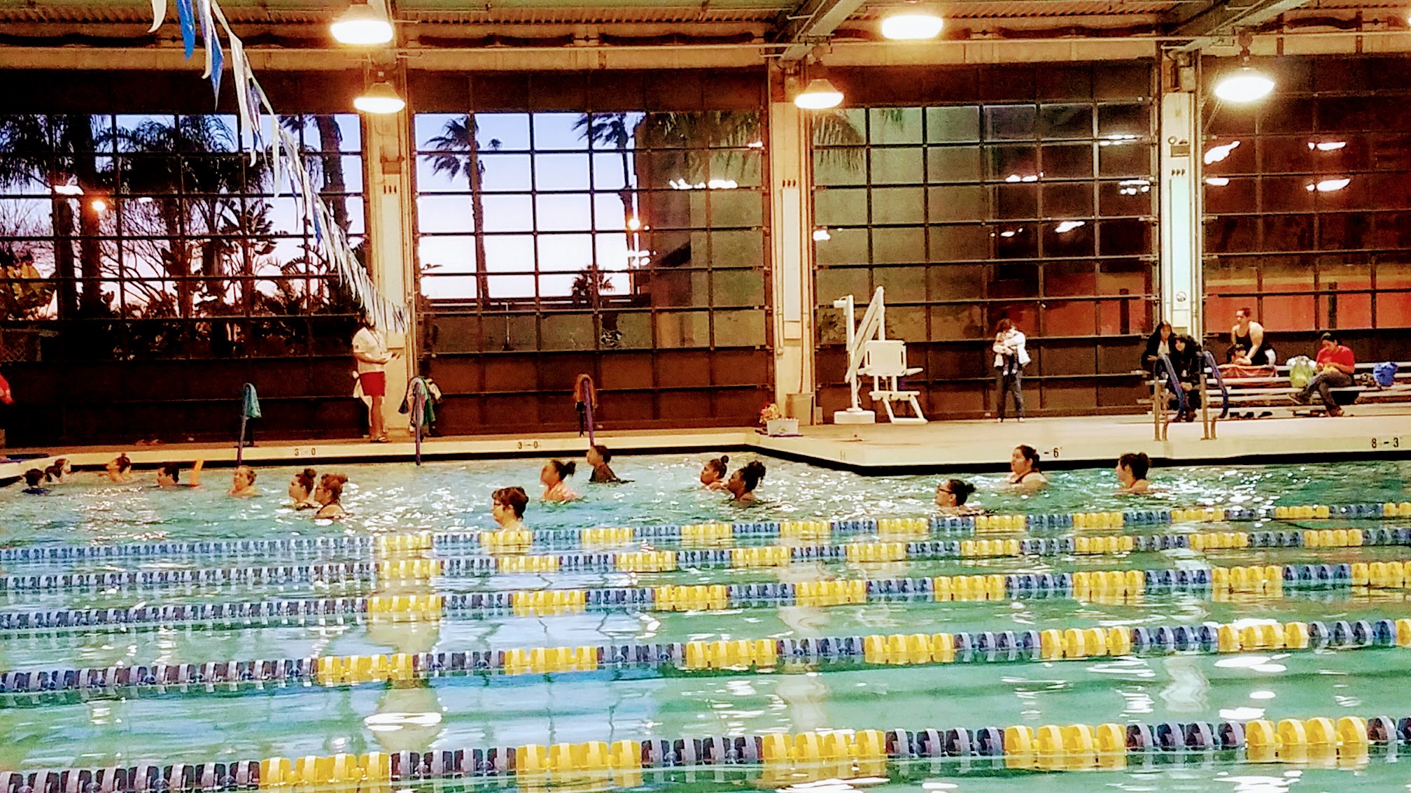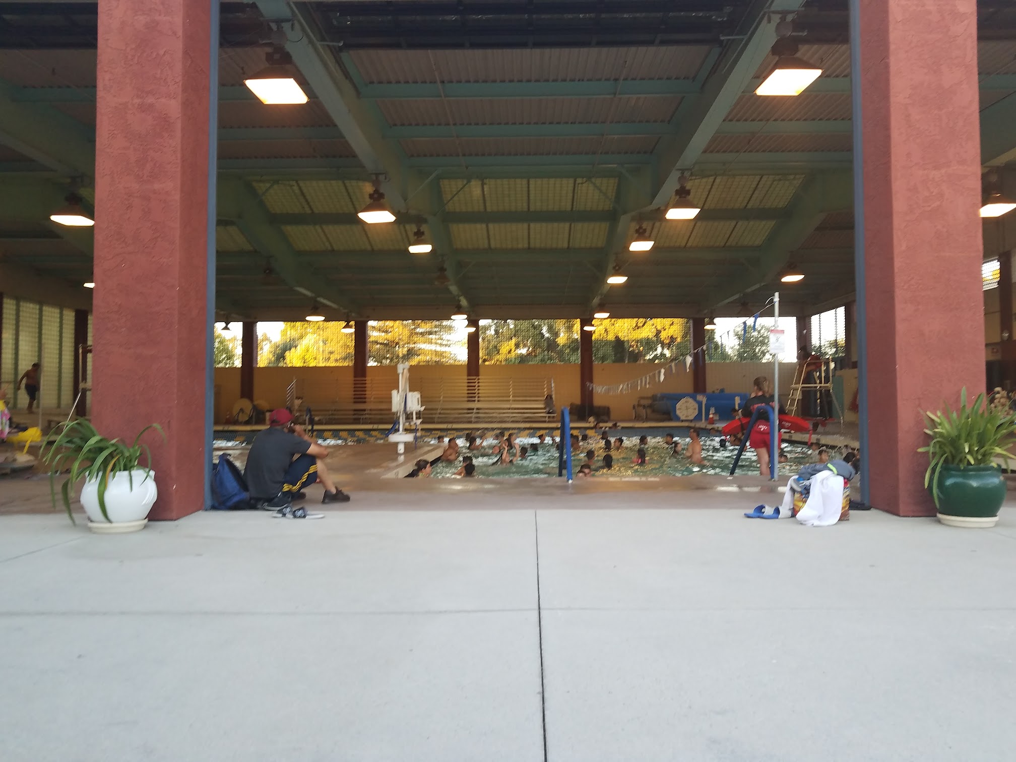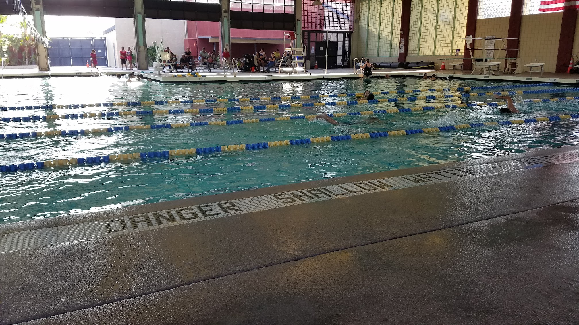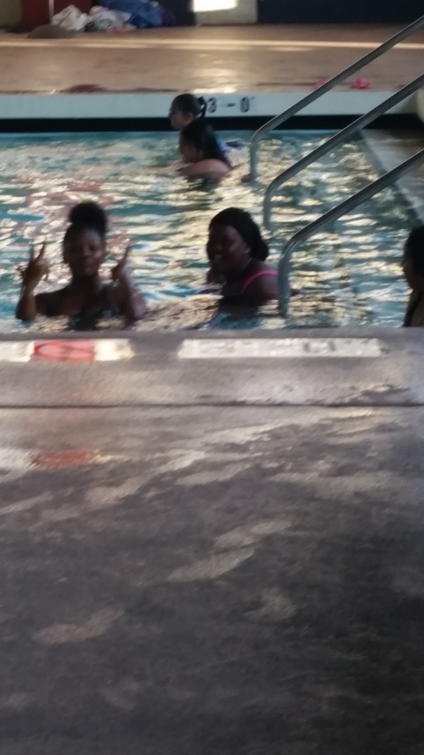 Loved that the staff is friendly and convenient. You don't have to pay to go in if you're not going in the pool. Its fun to watch your kids while you sit and wait for them on the bleachers. This is a great place even if it's only for 1 hr & 45 mins at a time. This is an inside pool. Kids loved the diving board.