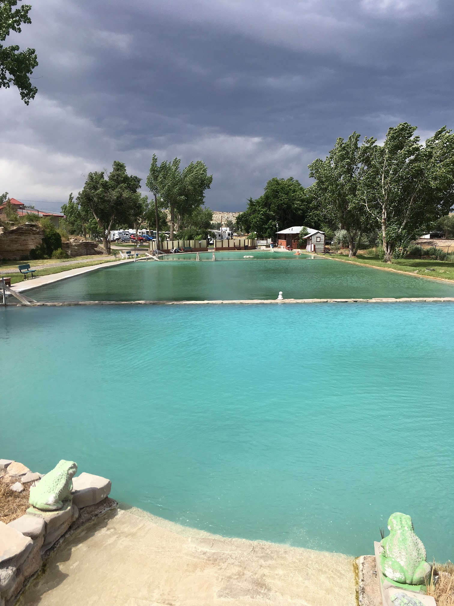 I was just passing through looking for a quick overnight stop with full hook ups. The lady who checked us in was friendly. This place blew my mind!!! The 2 hot springs pools are 5 ft deep, really hot, and huge!!! The view is fantastic. There are push button showers, and pool noodles by the pool. It was a wonderful, relaxing surprise after a long day of driving.