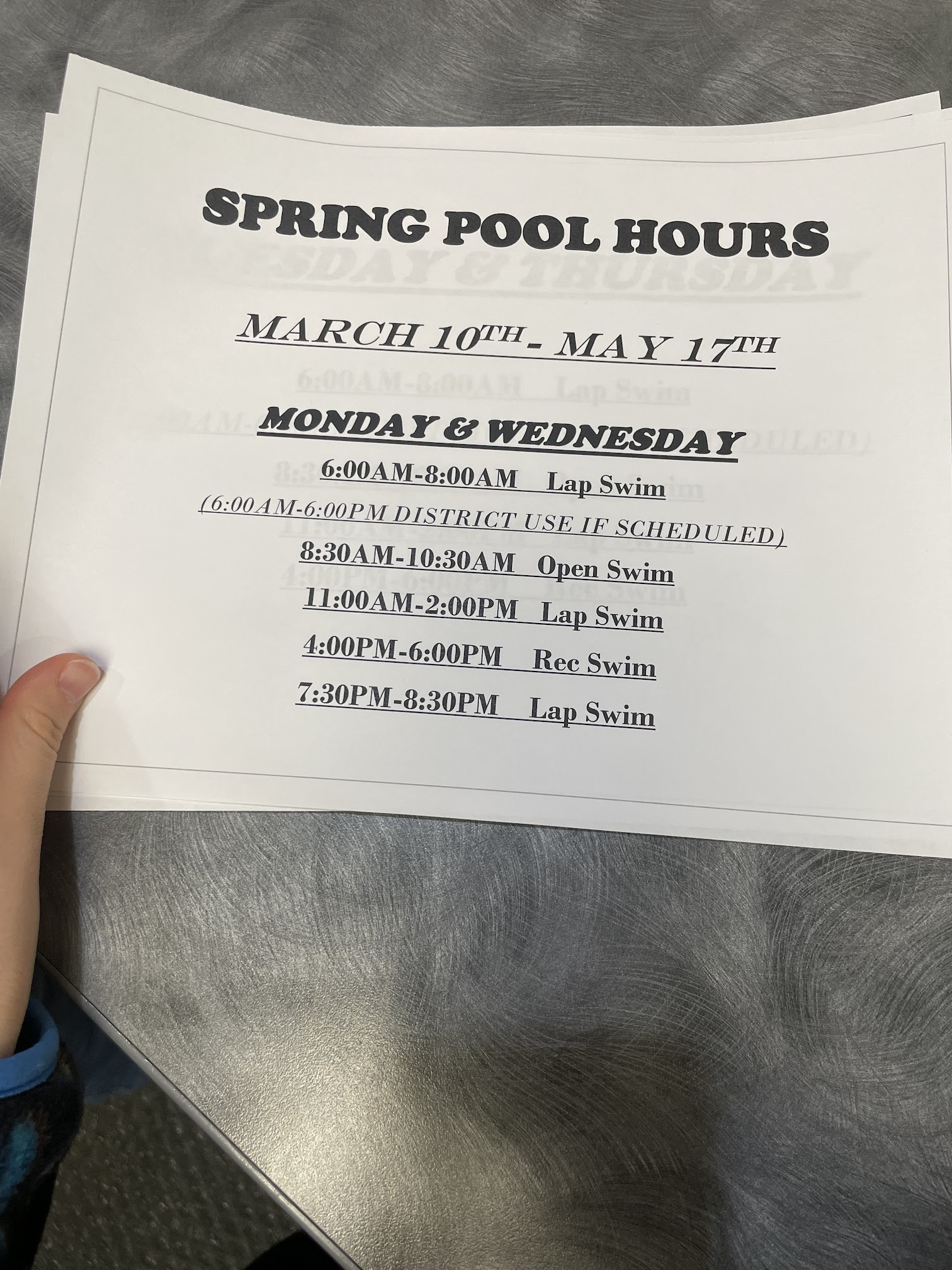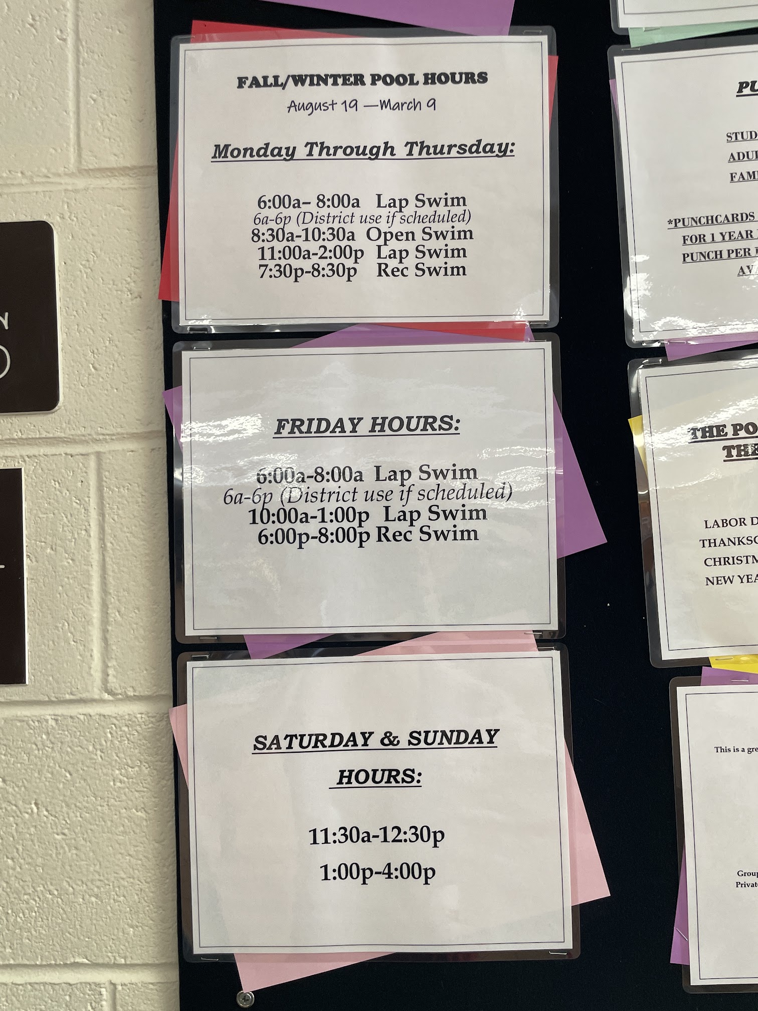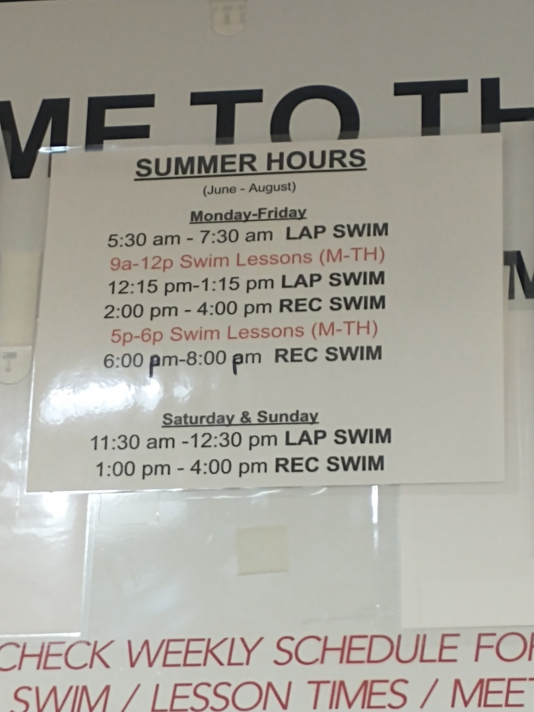 The hours of operation are not convenient at all they need to be open to the public from 6am to 10 pm. 1 -2 hour open swim times are ridiculous !!! It is always so crowded because of the limited swim times!