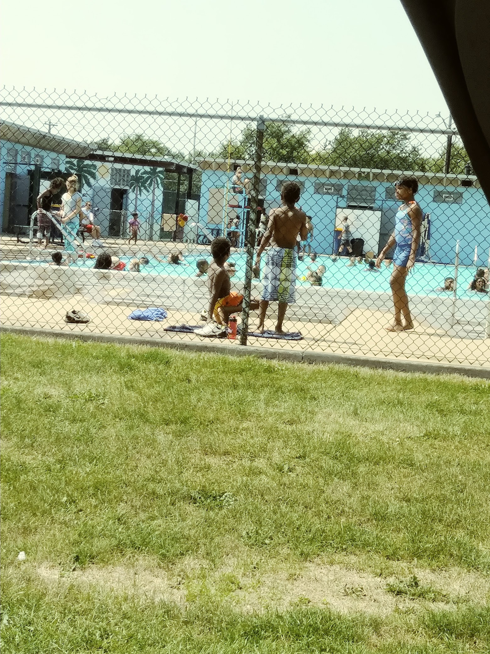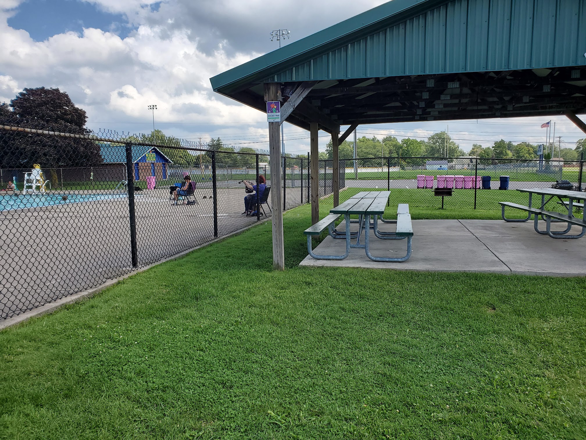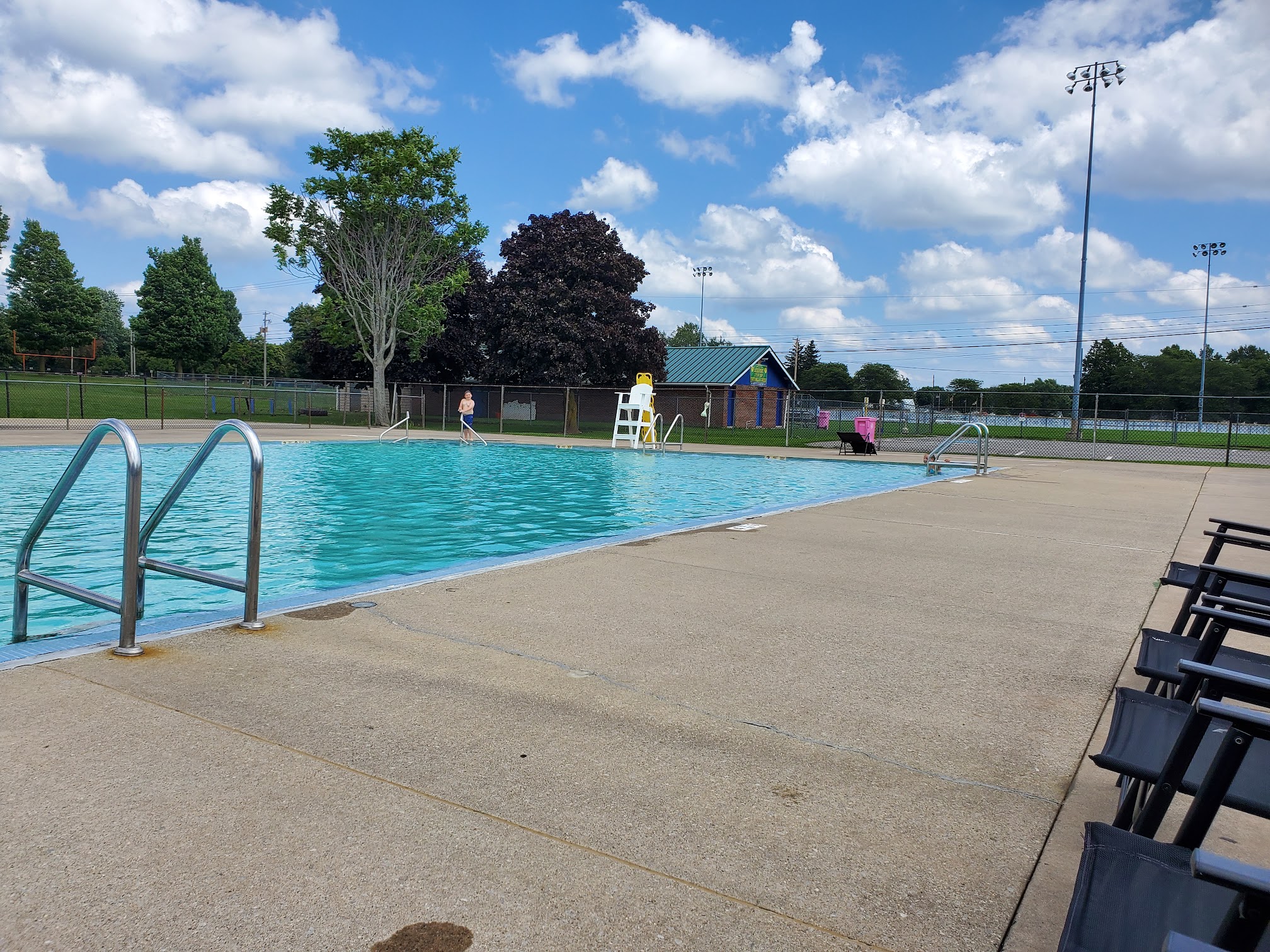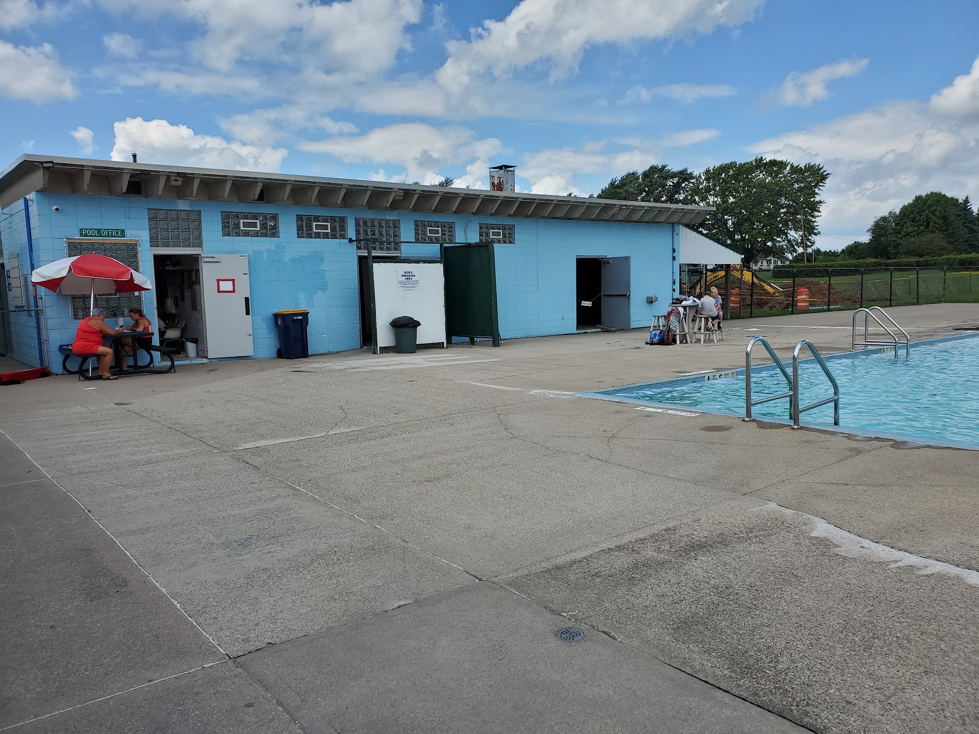 ♿️ accessible throughout. Very nice pool & staff! Only $1 each to swim. The L-shaped inground pool has varying depths from 3 feet to 13 feet. Kids must pass a quick test to swim in the deep end. Walk in steps at shallow end & ladders for the rest. Not too heavily chlorinated at all. Large concrete deck surrounds the pool, with some chairs to sit & a small grassy area with pavilion & picnic tables to sit & eat. Lifeguards refresh frequently. The only downside, is that the large changing rooms & toilets are quite old & dilapidated and REALLY need some TLC.