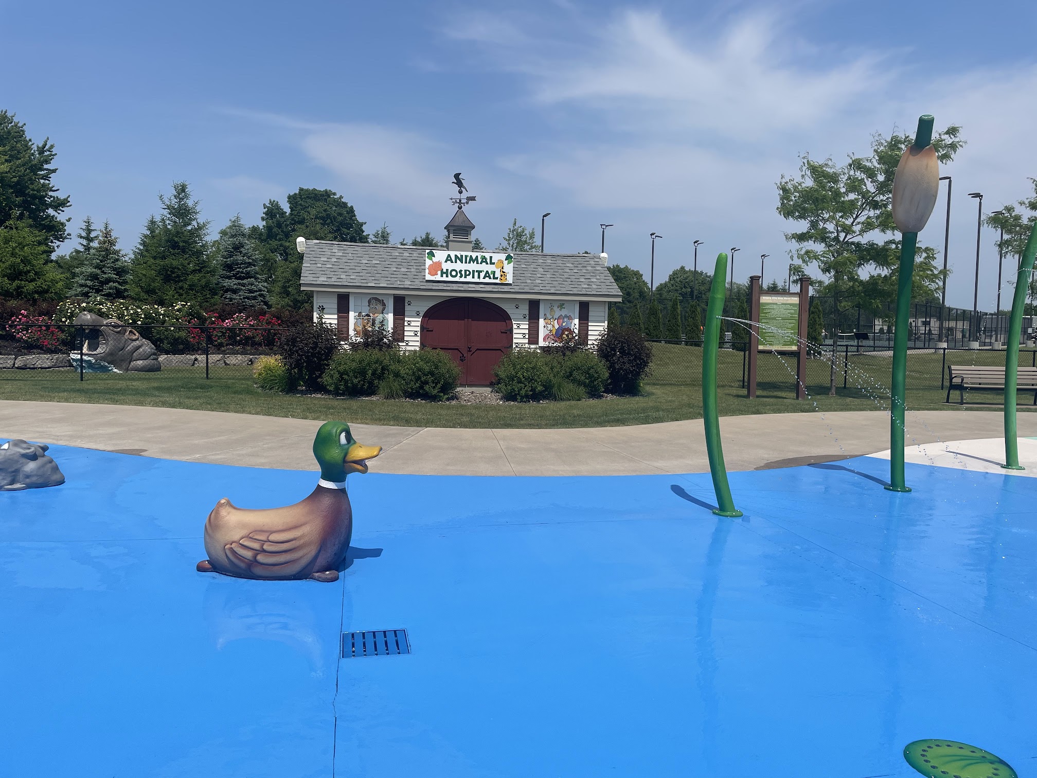 ♿️ accessible Located in a Beautiful park, with many amenities within its limits, including neighboring also separately fenced-in playground & climbing area. Splash pad is fenced in & has monitored ticket entry booth for getting your day use wrist bands. Free for Greece residents, $5 each for non-residents. On an average summer day, this pad is not as enjoyable as other towns' always free Splash pads. The # of people attending in Greece & too limited shade spots, on top of the # of kids on the pad together, too crowded. Many of the floor's water features, aren't all flowing water! We waited for water to flow, more than played in some. Especially the case for the more toddler-friendly water features. Lots of toddlers searching the ones that have water flowing on them at same time, isn't fun. Disappointing for such a beautifully maintained & layed out park. Locked & gated entry outside of open hours. Bathrooms are a bit of a walk away & out of sight from both play areas, so u have to take everything with you, when u go to use it or chance losing it. Best during less busy times or in short visits on hot days.