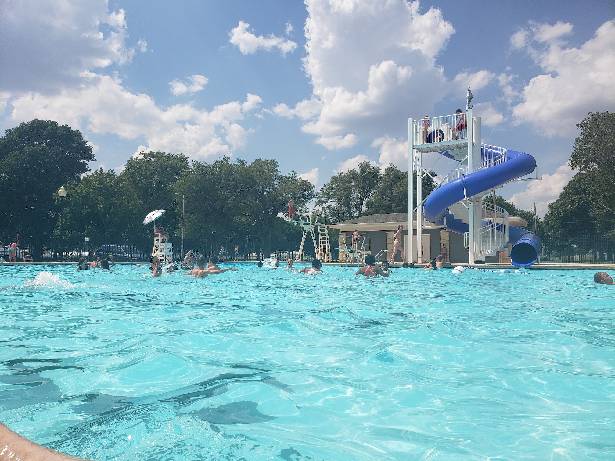Loved this pool. My family had a fun time and the prices were fair and cheap. If you have a kid under 3 they are free with a paying adult. I love how you can walk into the pool and there is not steps you can just walk in which makes it convenient when you have toddlers or elderly who wants to enjoy the pool on a nice hot day. they also have a big slide and 2 diving boards. They have a small kiddy pool which is gated and simple and 3 mushroom looking things you can walk under and get wet. Super neat fun family pool!