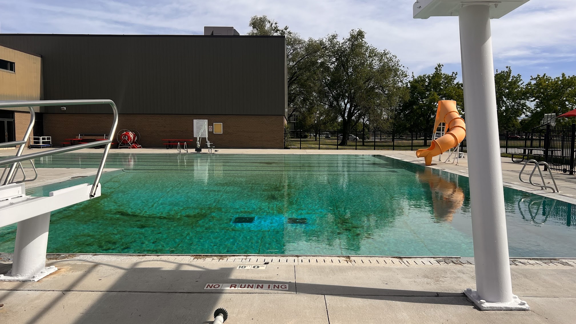 The Pool is nice and clean, would certainly come again. They have a couple lifeguards watching over the area. Everyone seems nice and they were kind in answering any questions I had. The depths are 3-12 ft. Changing rooms and showers right by the gate. They certainly need need to update the photos. The pool is clear and blue, not at all like the murky green photos displayed.
