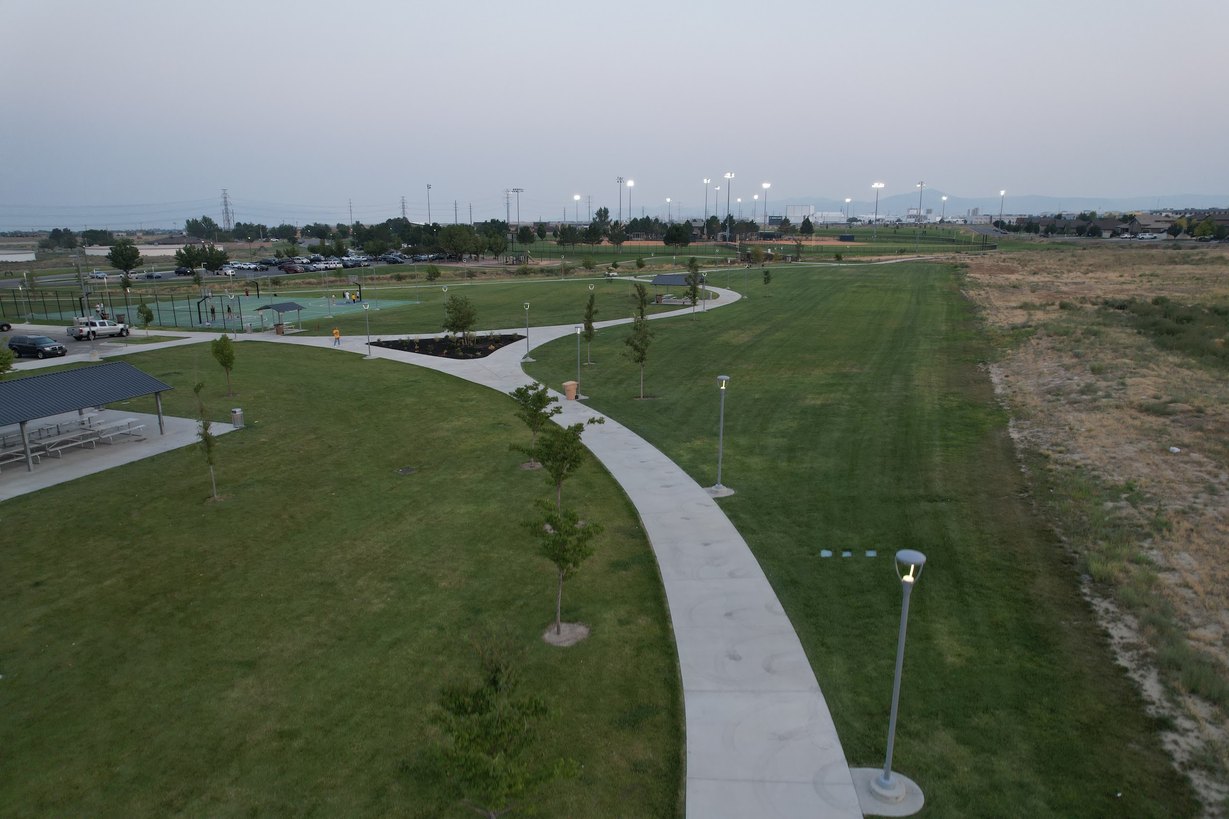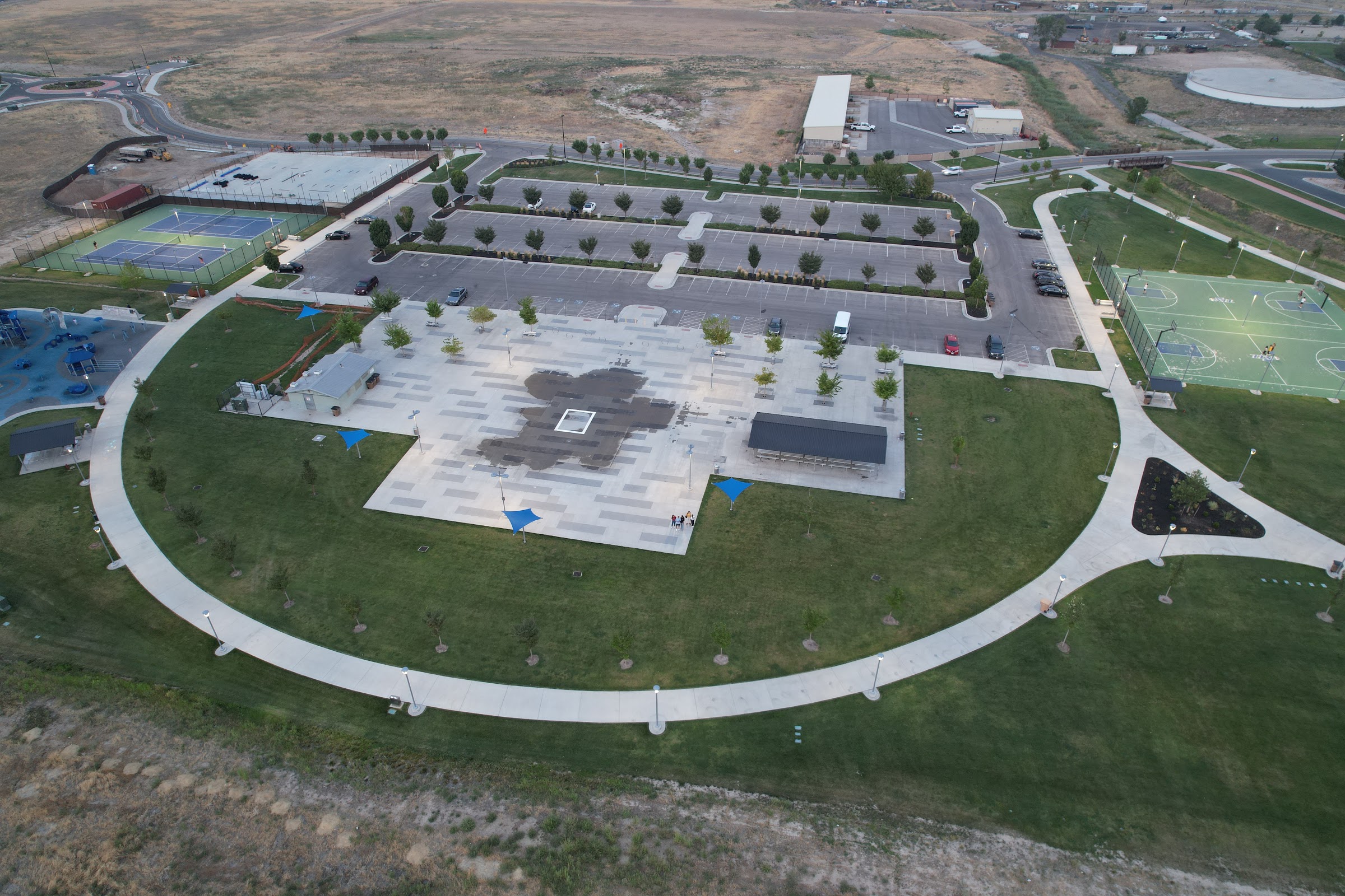 What are people saying (AI review summary)? This park is highly praised as a fun destination for families, especially during summer. It features a splash pad and a large playground, offering kids a great way to cool off and play. Parents appreciate the open layout for easy supervision, the nearby clean restrooms, and ample green space. Beyond the splash pad and playground, the park is described as a 'hidden gem' with additional amenities including basketball, pickleball, and tennis courts, as well as first-come, first-served pavilions. Food trucks are also present on Tuesday evenings during summer months. The primary complaint is that the splash pad water automatically shuts off when the wind blows, which can be a frequent occurrence in the area.