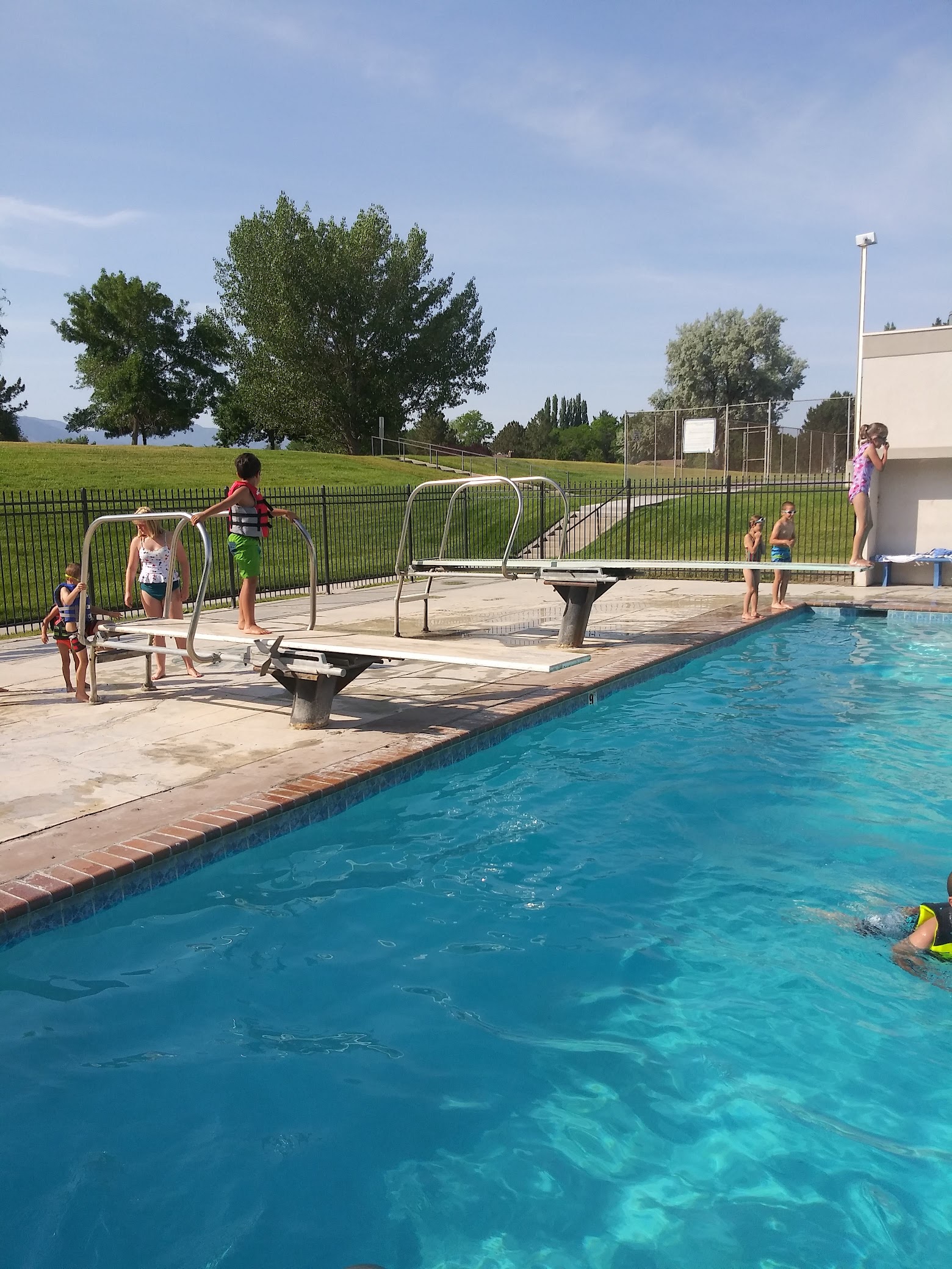 Public pool with a wading area, diving boards, and snacks, plus bathrooms.