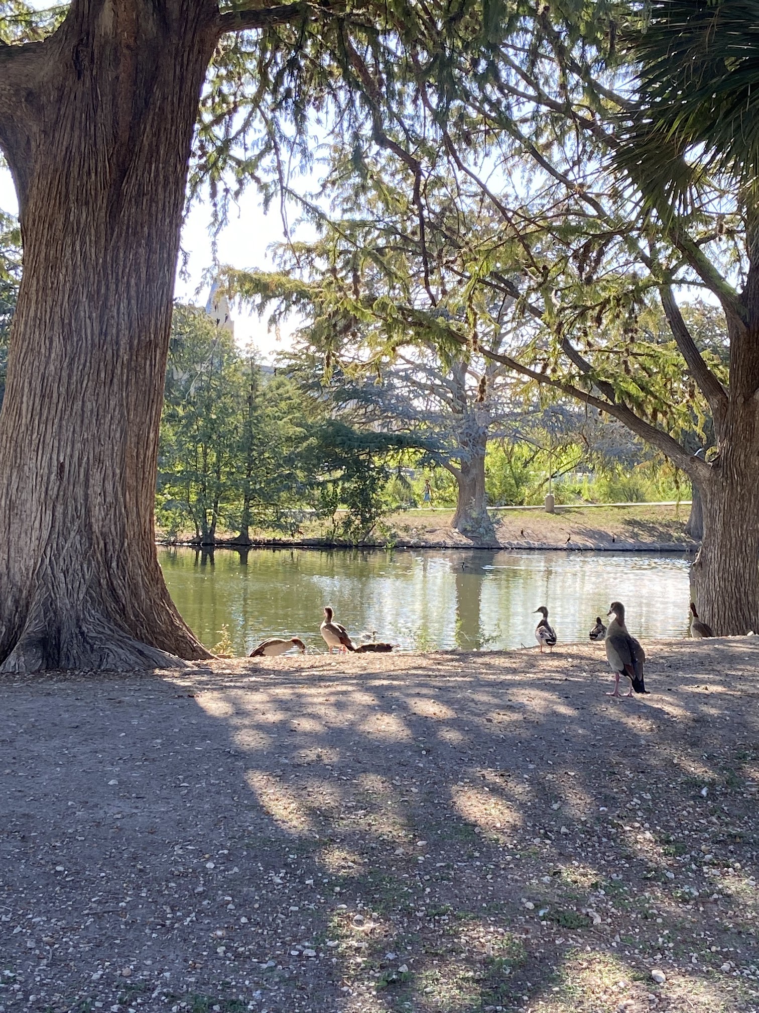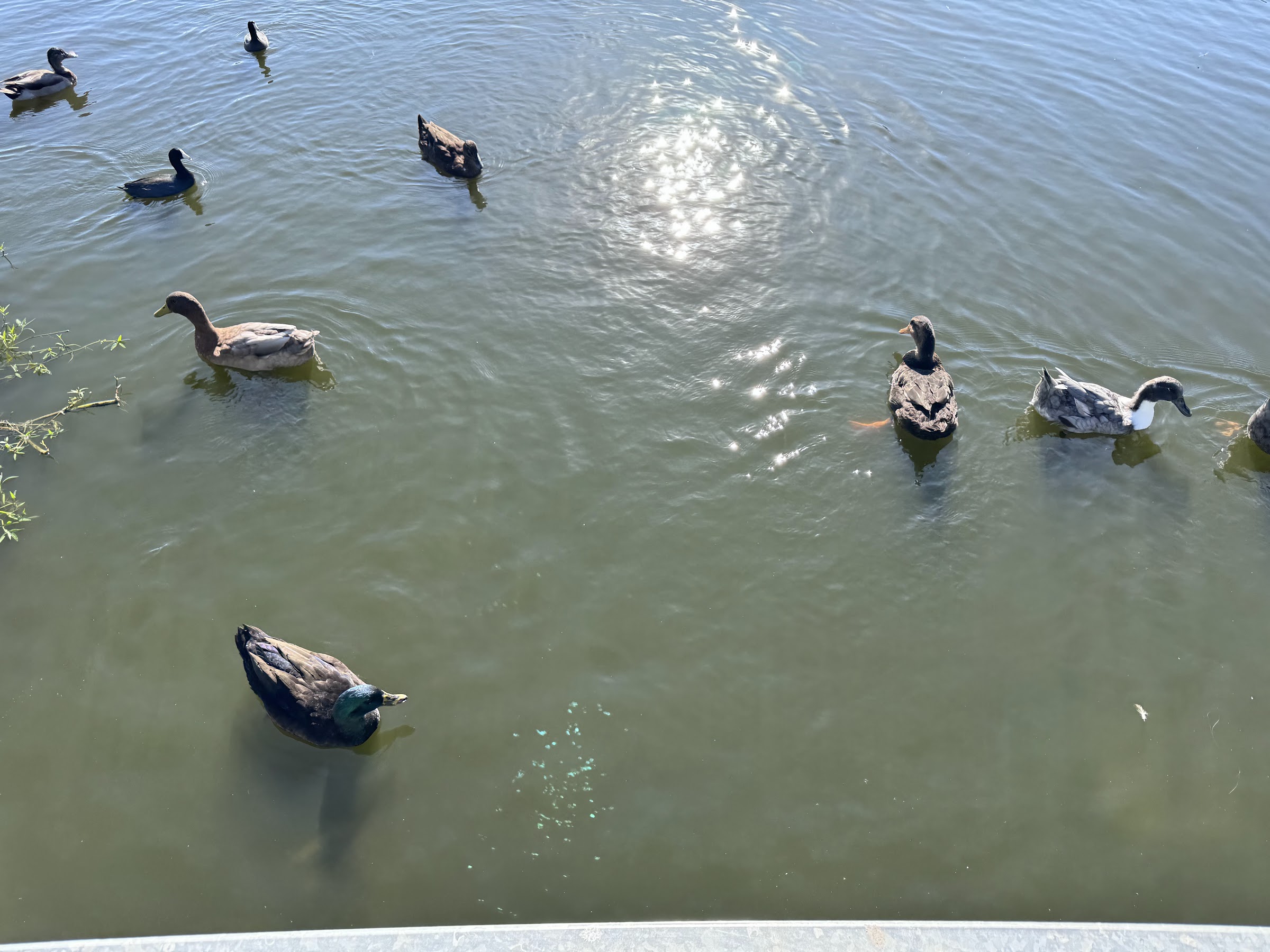 Park with a free pool, playground, splash pad and other attractions, including ducks.