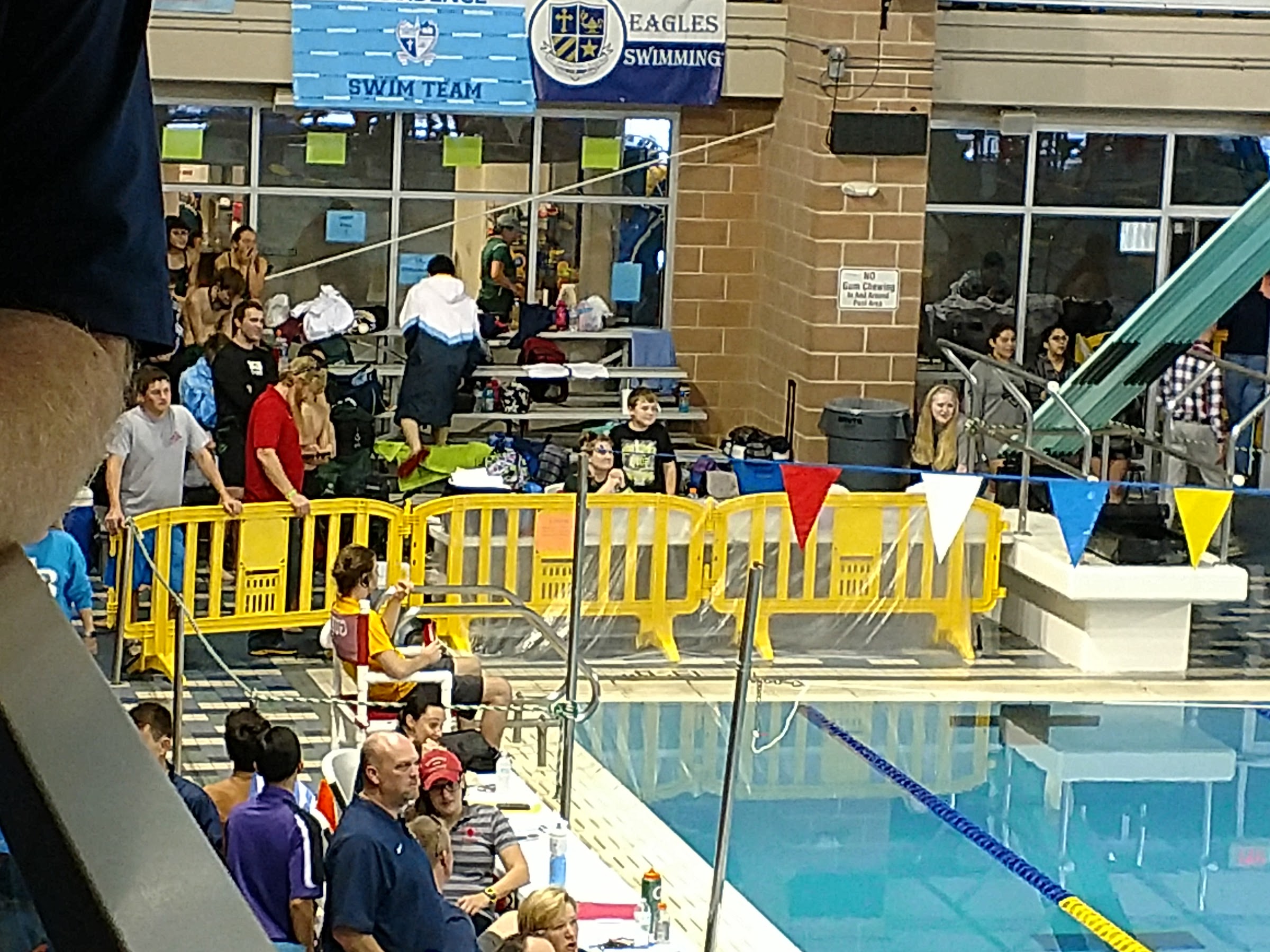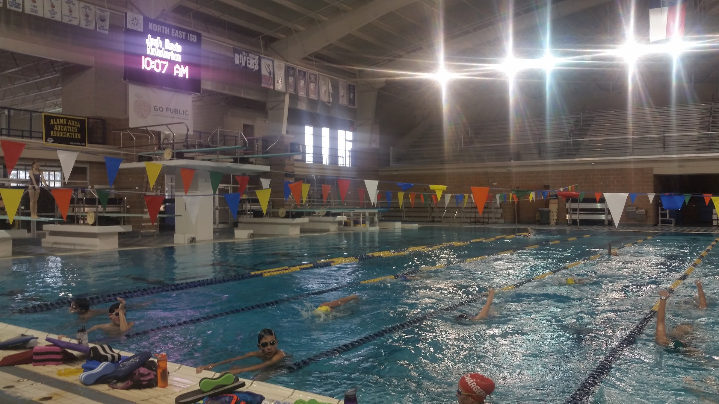 Nice school district pool. Actually, two pools. One with 2 short course pool and cool down, and another with a short course with driving decks. Two buildings are connected. The meet management policy was tricky - no outside foods and drinks and clear bag only, for my swim meet.