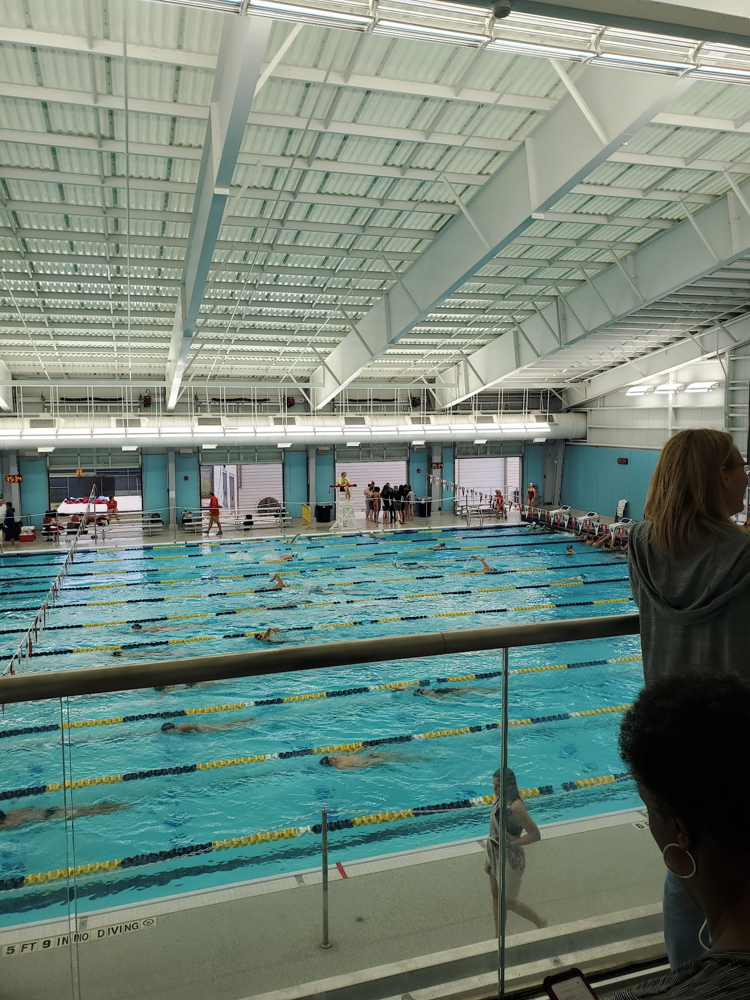 low glare and better seating than many pools. The bleachers have back rests and enough room to pass through. The translucent roof makes the building a hot box. The goal is to vent air from garage doors on the East side to vents above the bleachers. But the vents aren’t at the top so there is a hot pocket of air. That hot air is then circulated by the huge ceiling fans. Swimmers are mostly waiting for events outside in the sun. It would be better to replace the roof with a solid one like the Bill Walker pool (which is far cooler) and install exhaust fans rather than circulating fans.