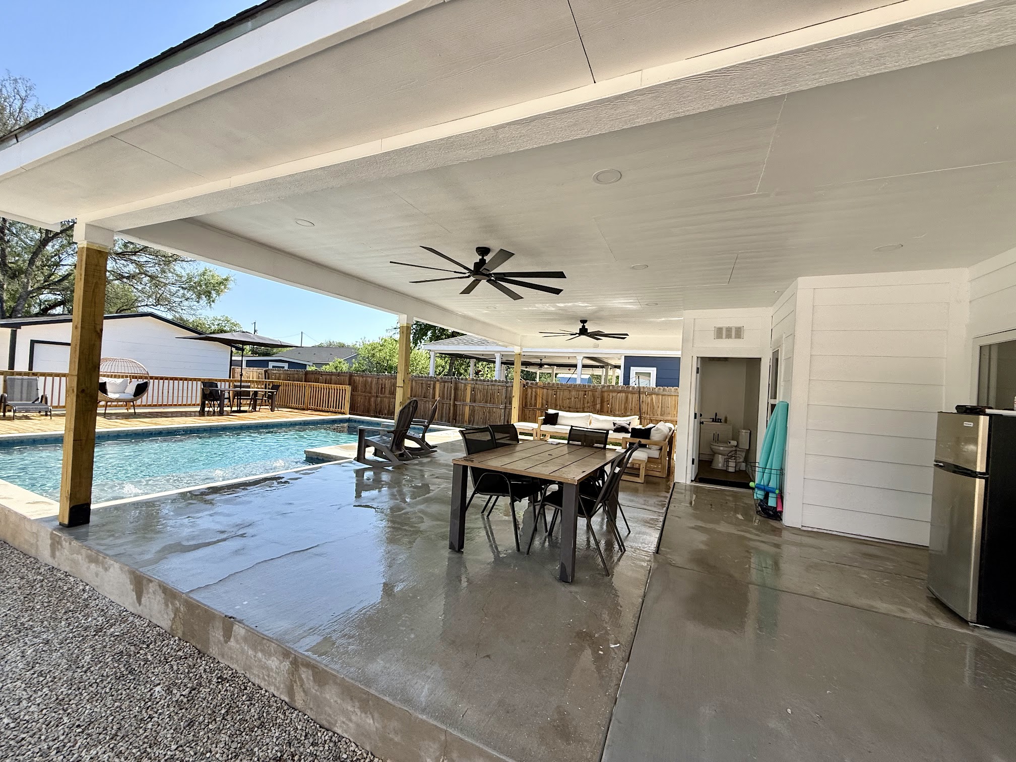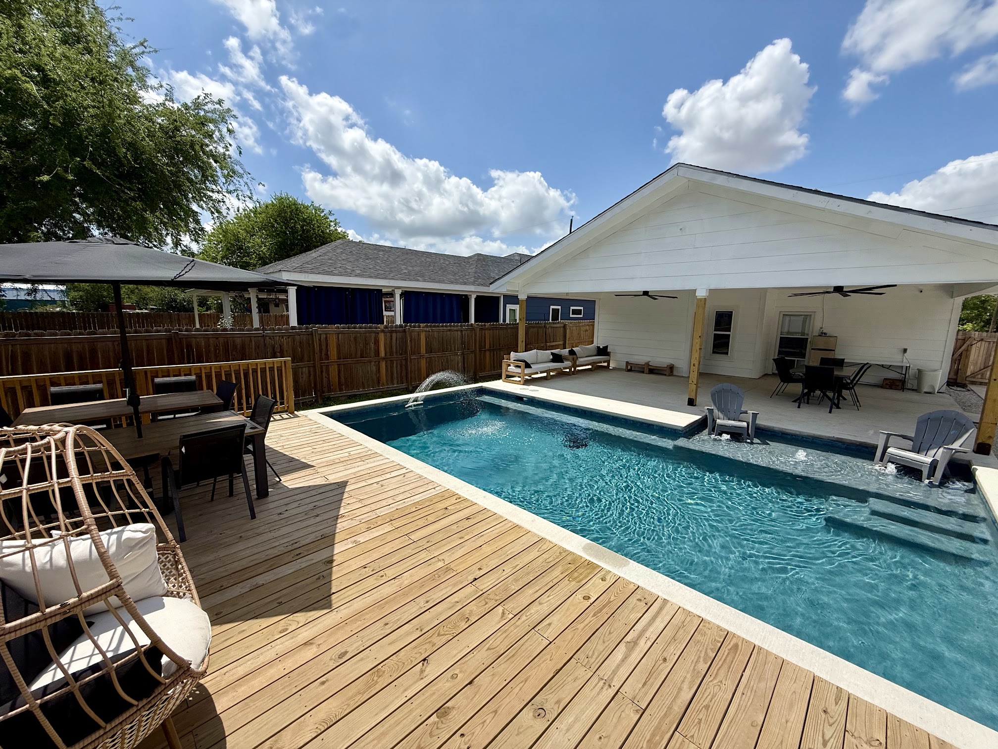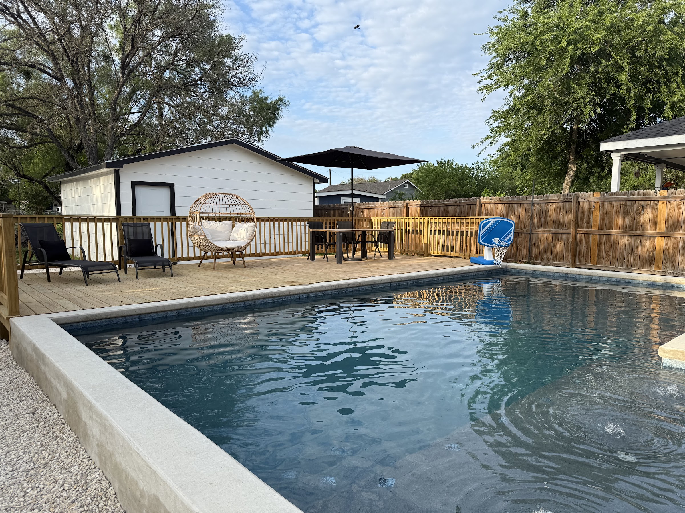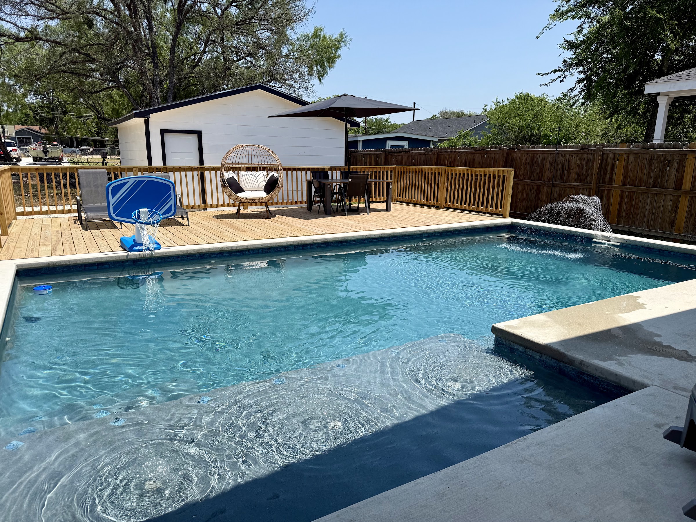 Three G's Backyard Oasis is a private, amenity-rich backyard pool rental located in San Antonio, TX. It features a spacious swimming pool, often including a water slide and diving board, alongside a separate hot tub. The oasis also provides a fire pit, grill, and comfortable patio area, making it an ideal spot for various recreational activities and relaxation.