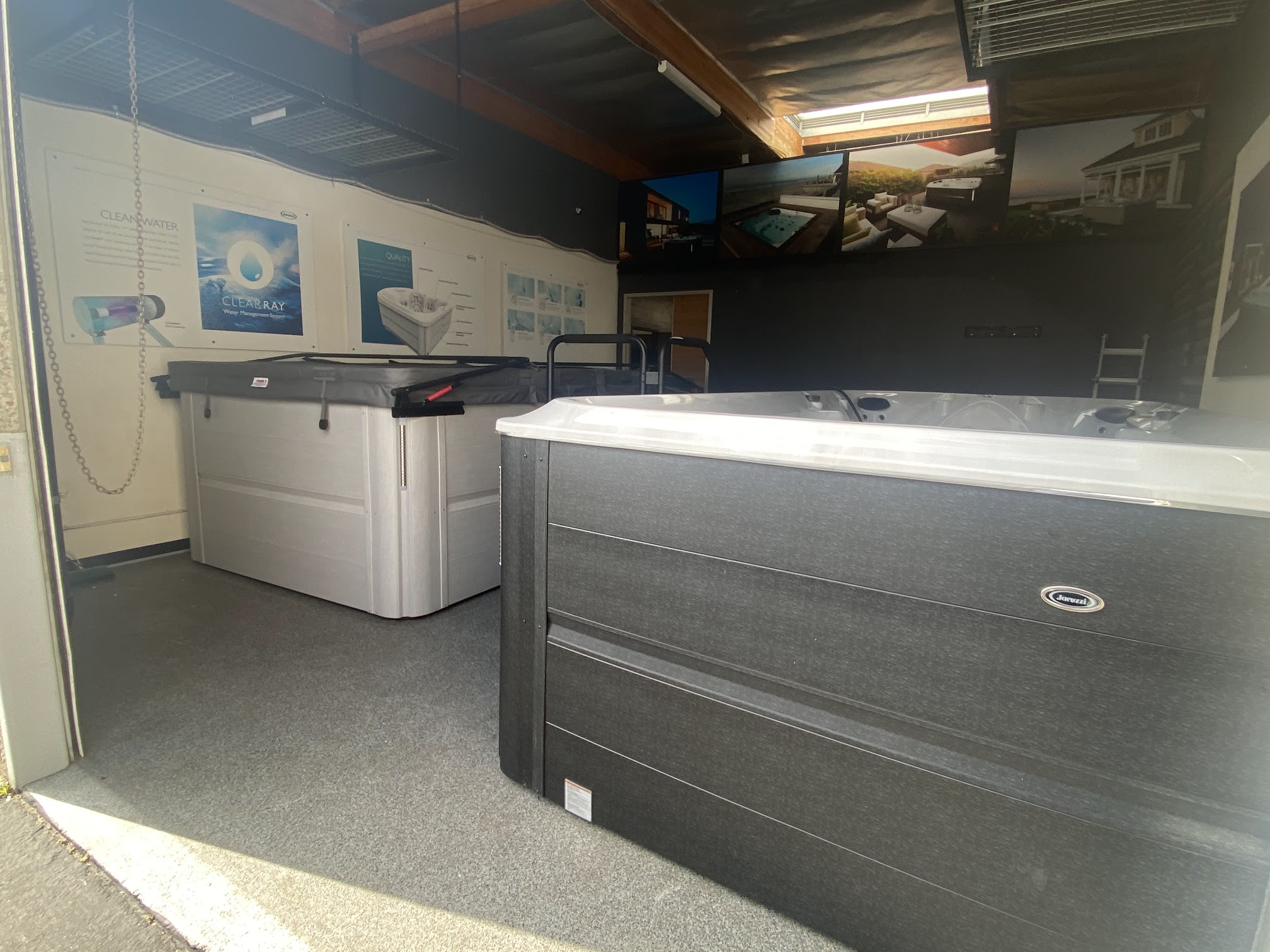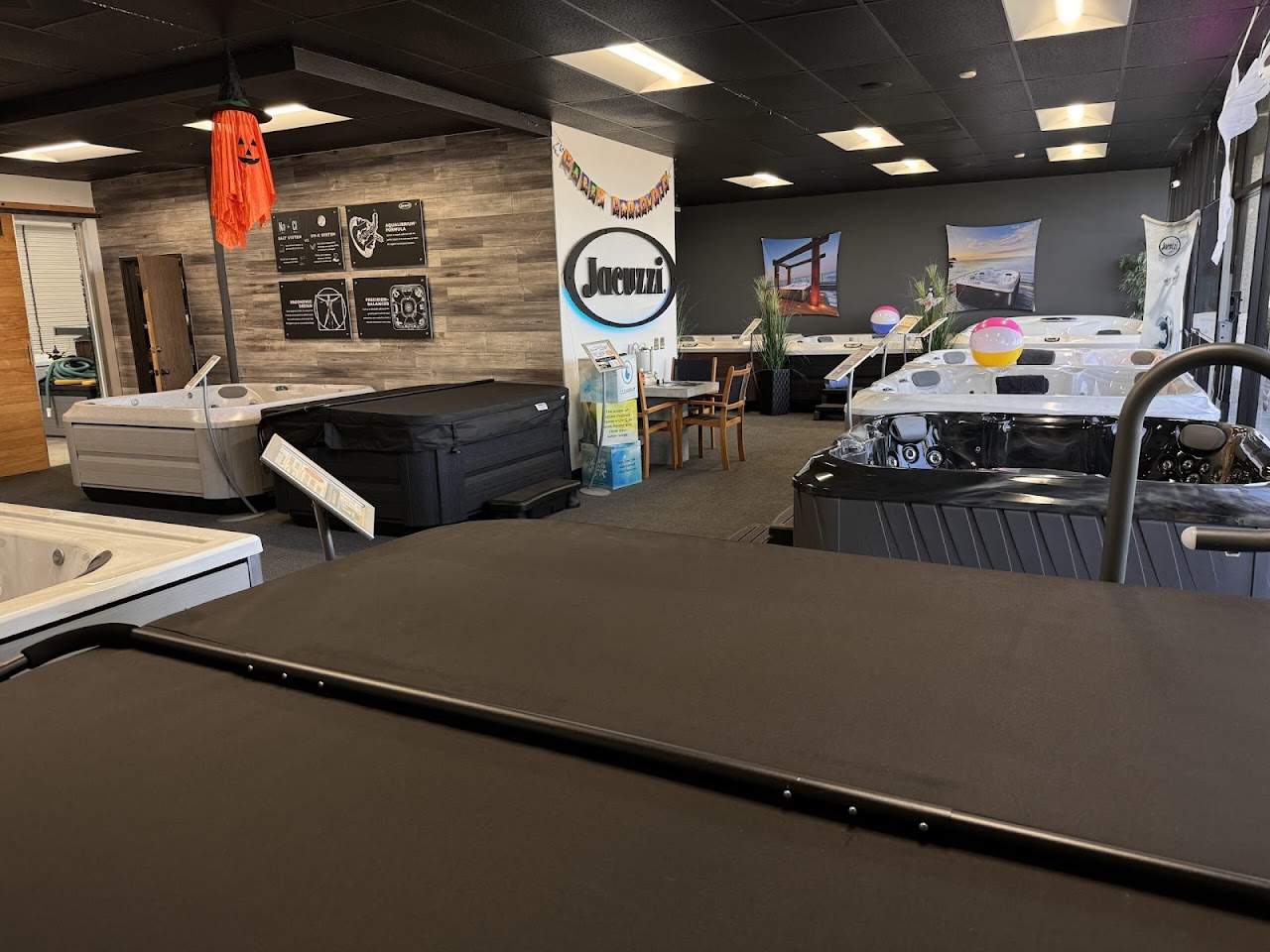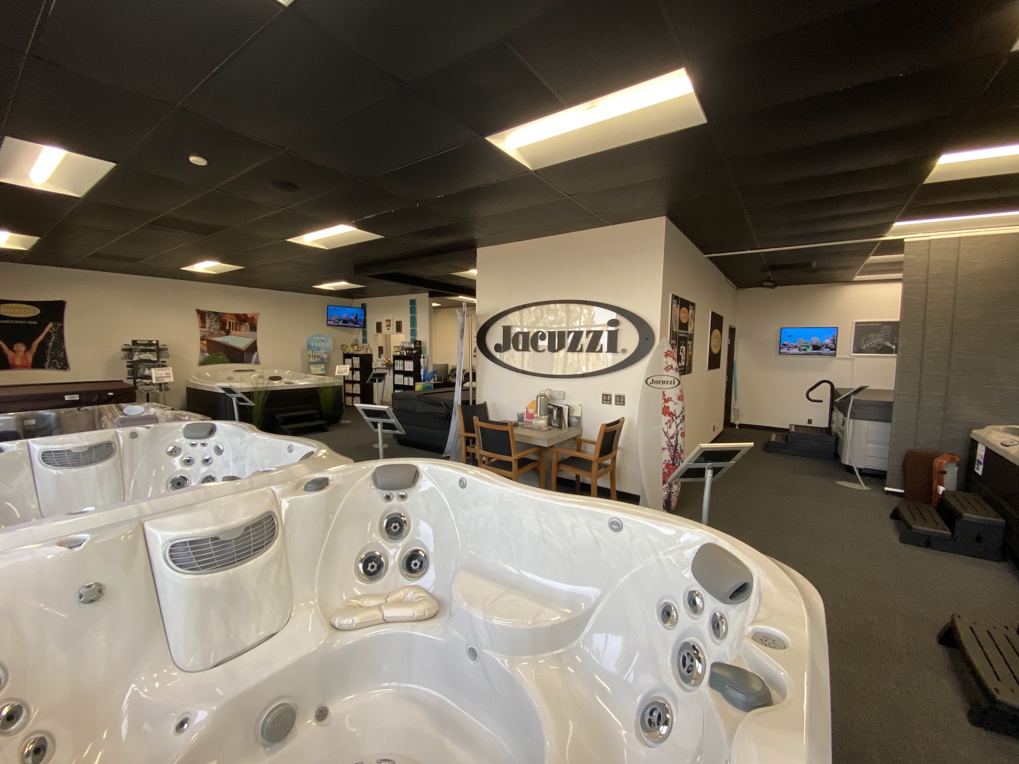 Showroom featuring Jacuzzi brand hot tubs, swim spas, and saunas, plus repair services.