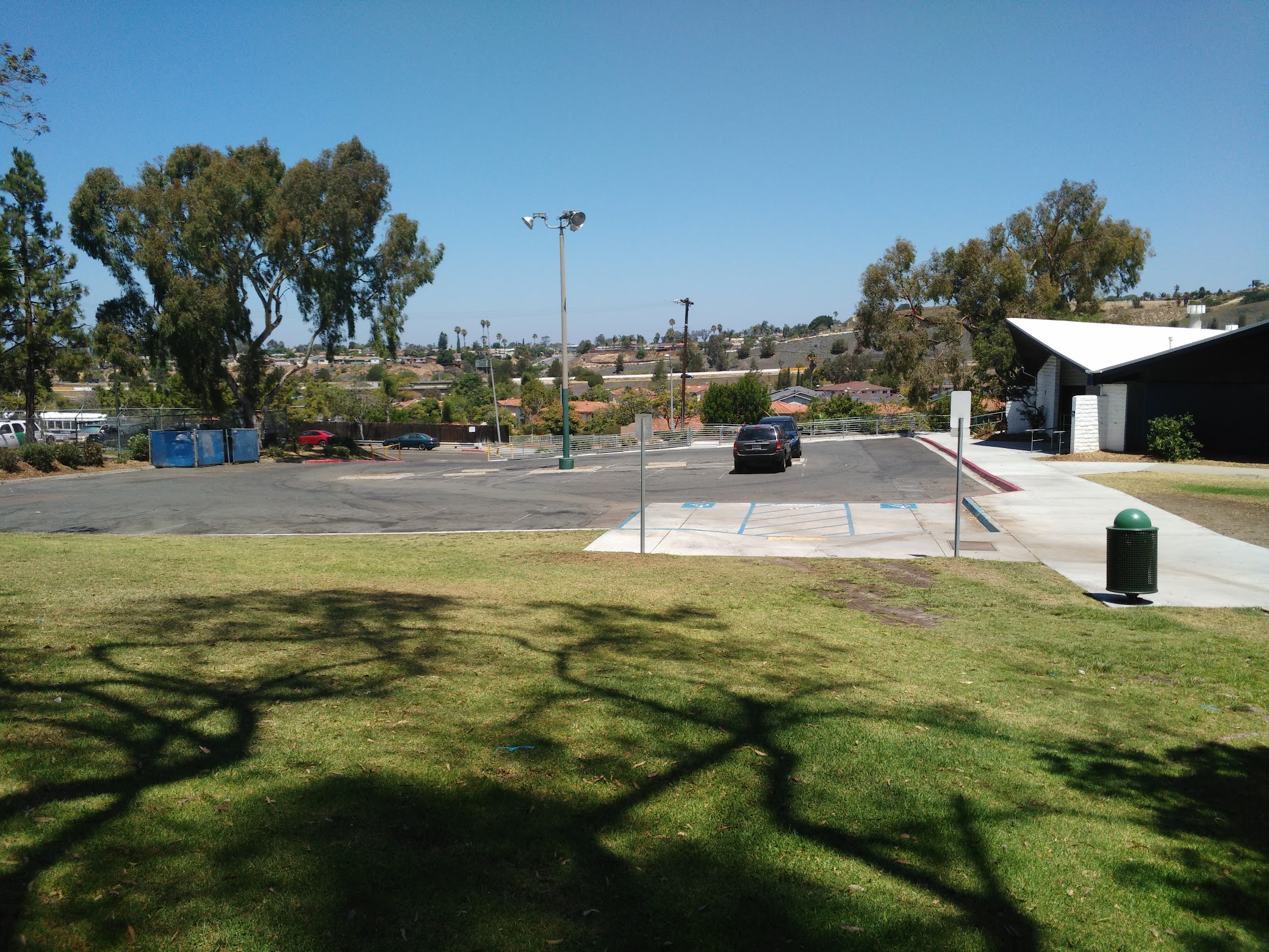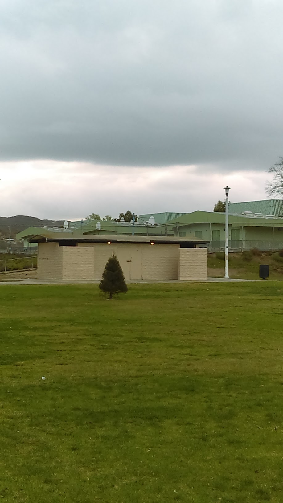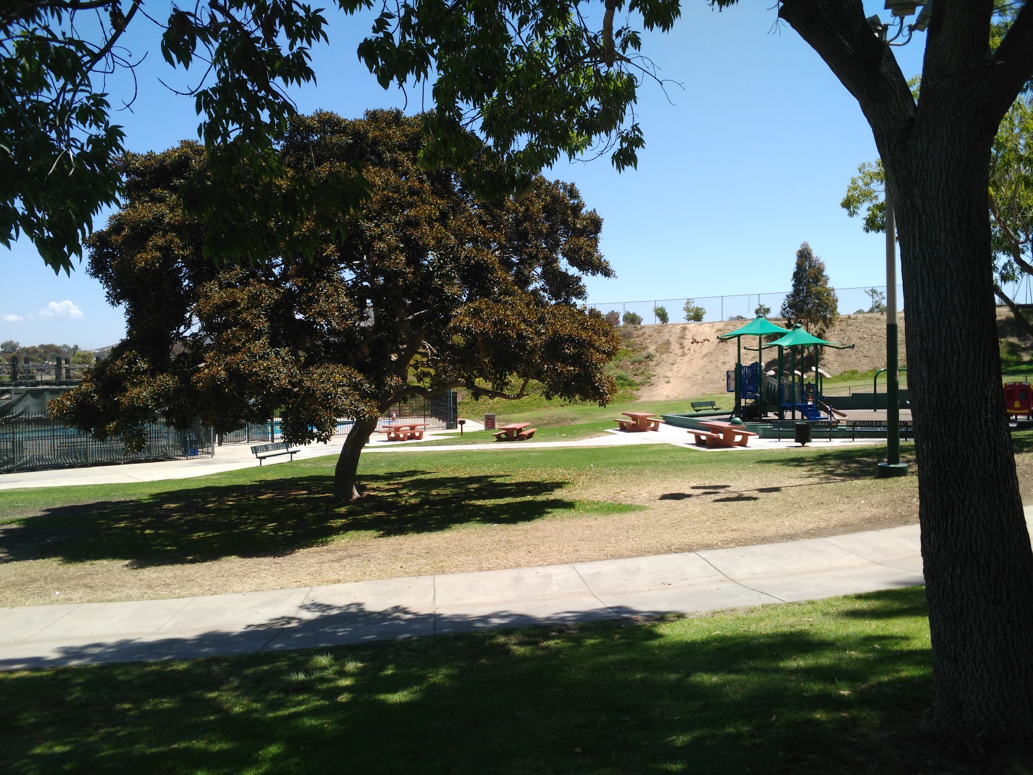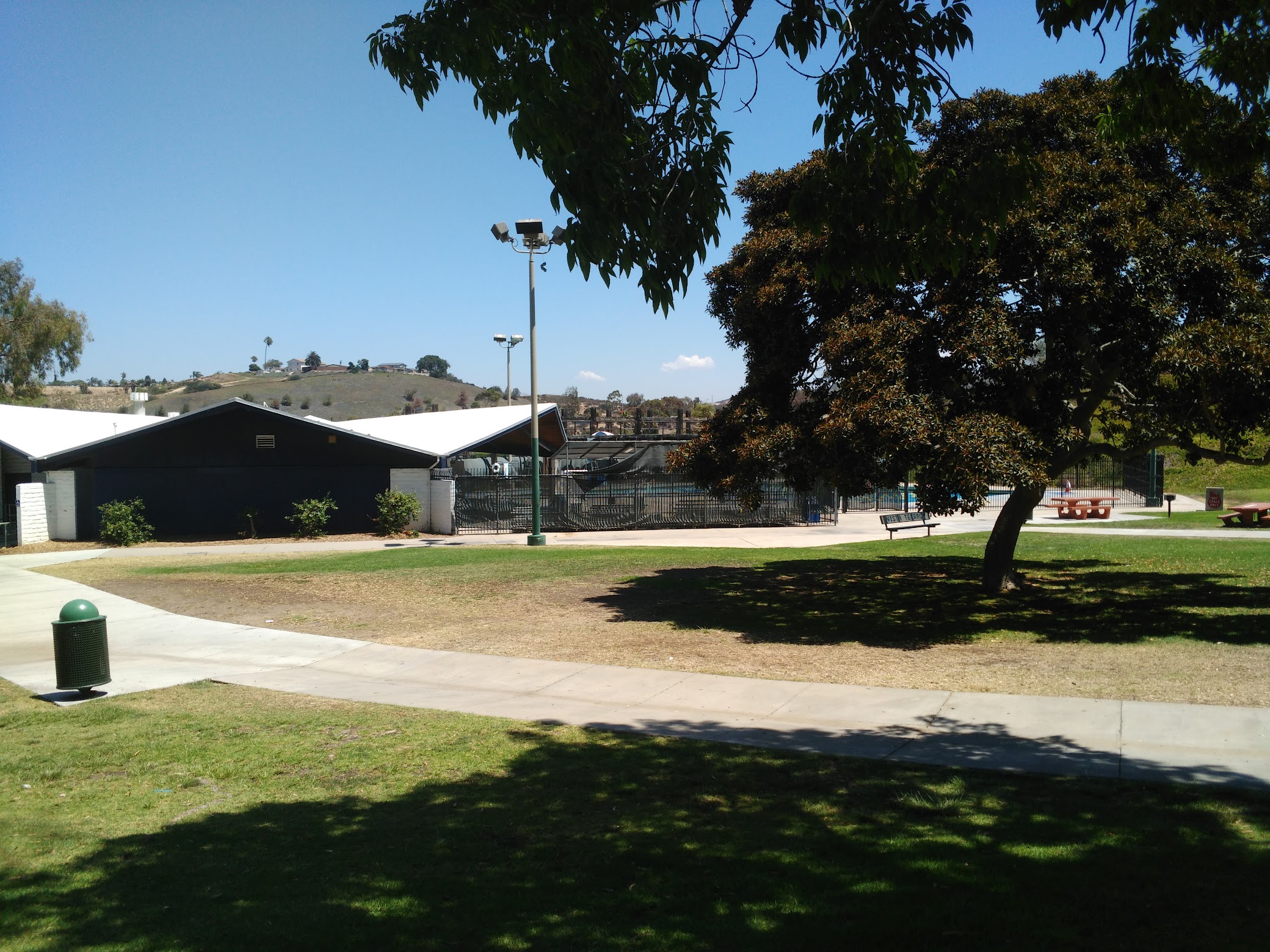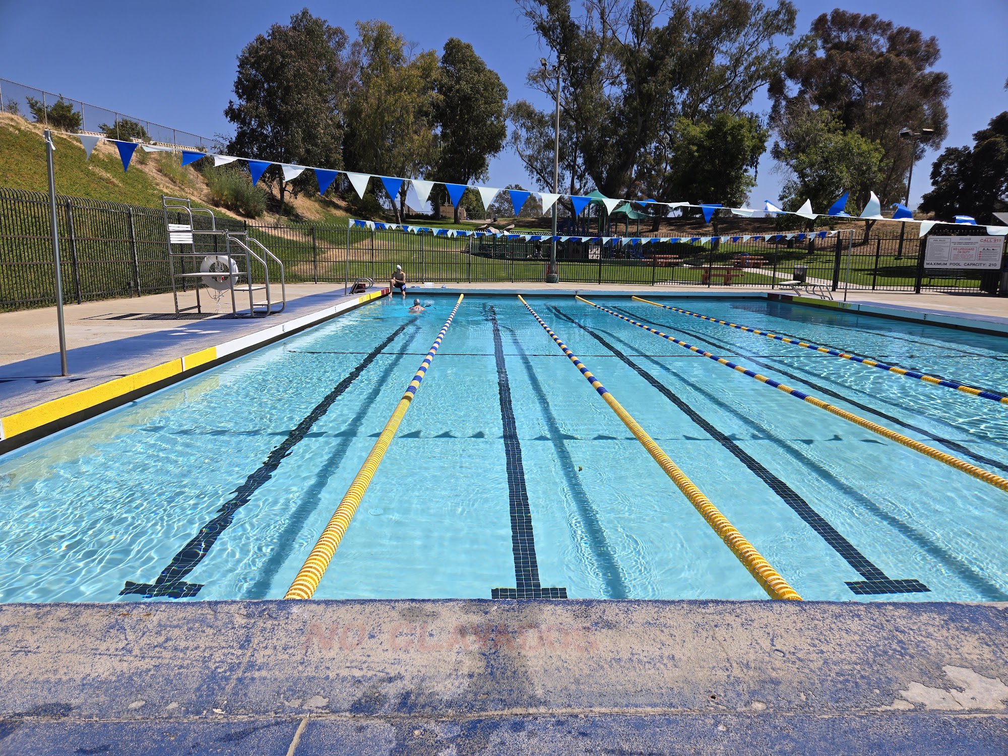 Nice big pool with a 9 ft deep end. Not crowded at all. Old crummy changing rooms but adequate. Playground/picnic area right next to the pool. Shaded sitting area (a few rows of bleachers) but nothing close to the pool.