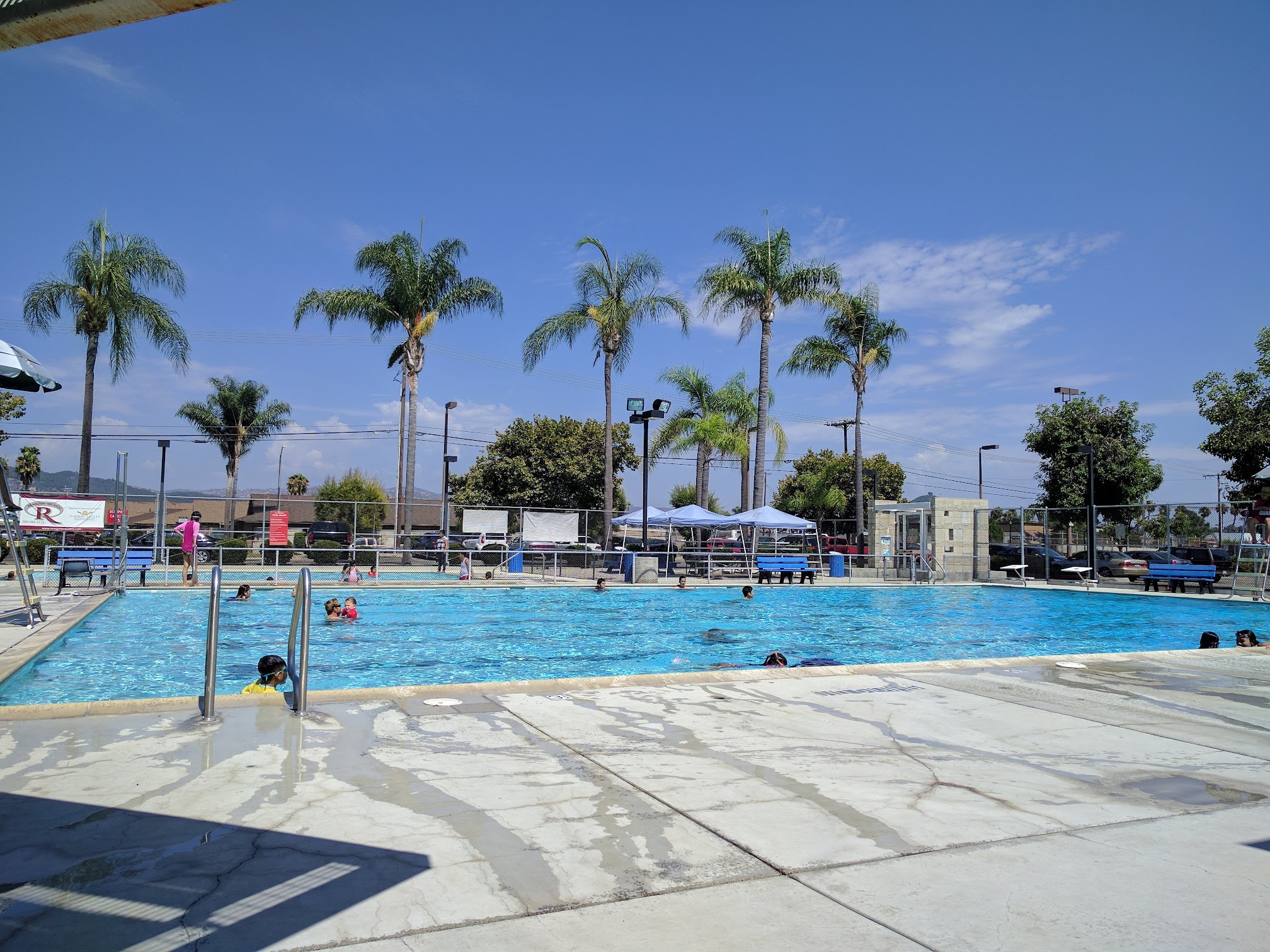 Kids playing baseball, a swim meet at the pool, people playing basketball, and lastly skateboarding. This park has a lot to offer.