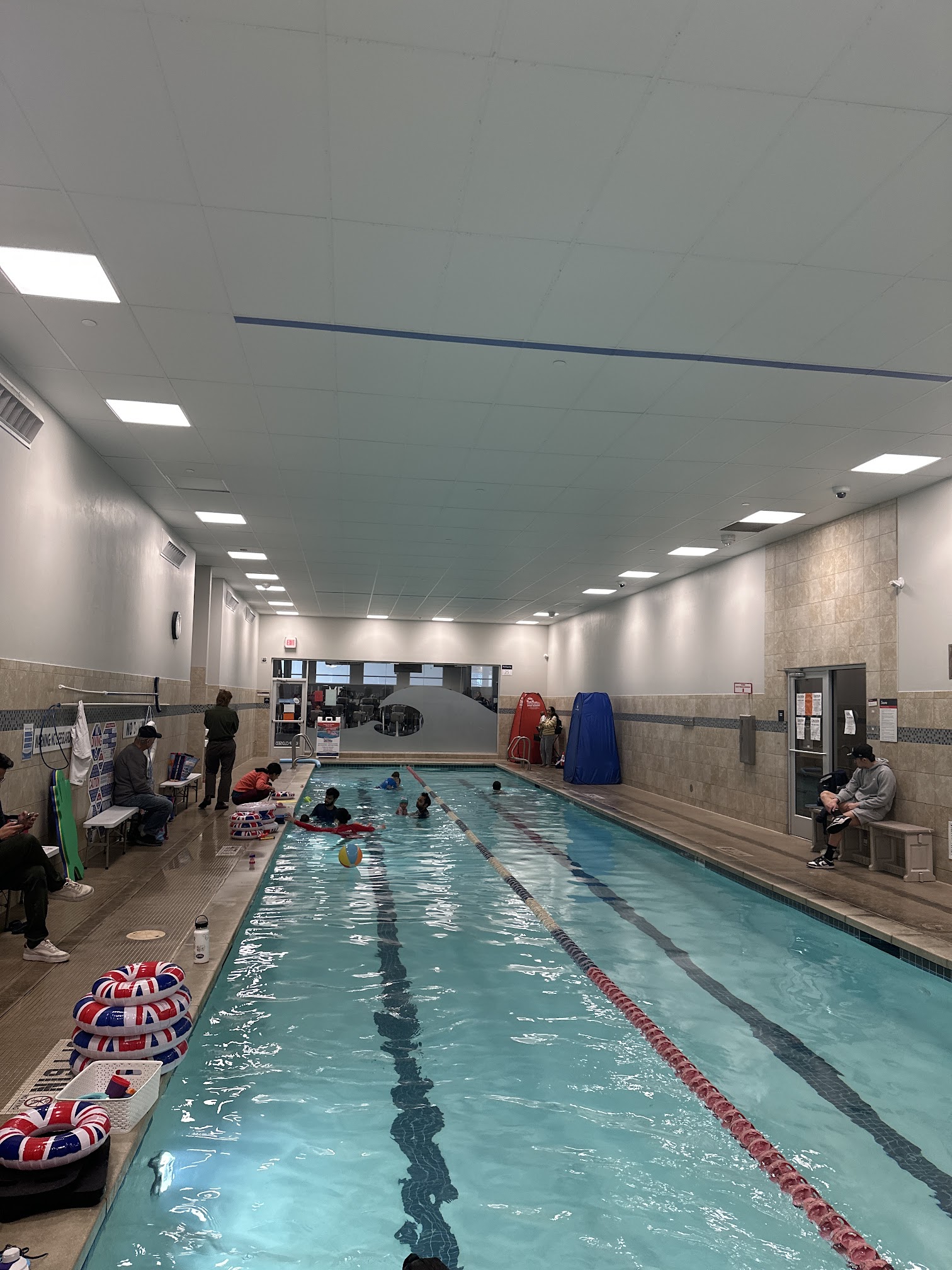 The indoor pool at British Swim School at 24 Hour Fitness - Newpark Mall is consistently heated to a comfortable temperature range of 84-86 degrees Fahrenheit (28.9-30 degrees Celsius).