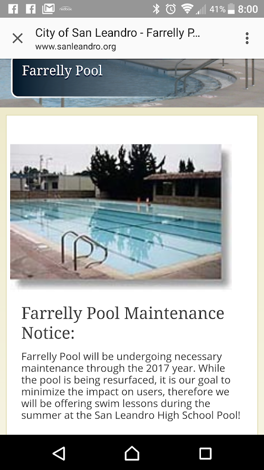 Farrelly Pool is an outdoor public swimming facility located at the San Leandro Family Aquatic Center in San Leandro, California. It offers seasonal recreational swimming opportunities for the community.