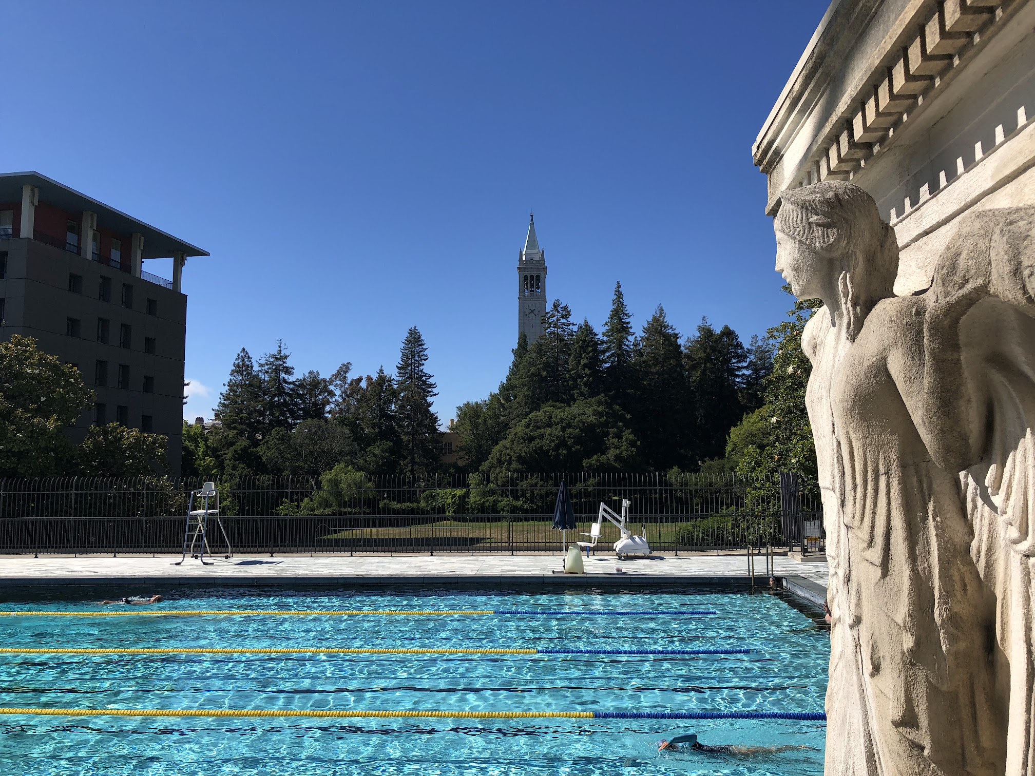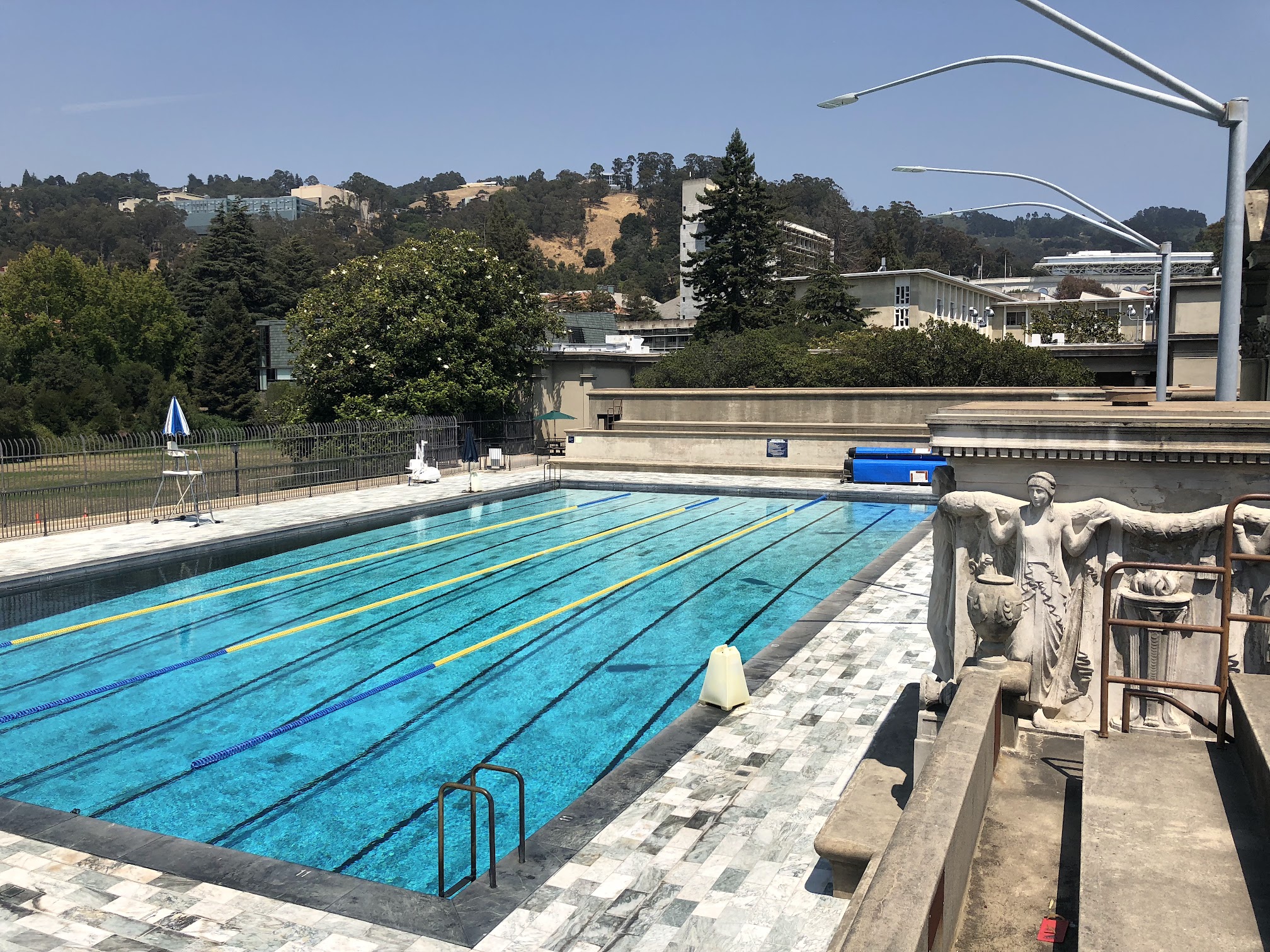 Great 33 yard outdoor pool on top of Hearst. Crystal clear with granite(?) tiles. Perfect lap temperature. Lacking a bit more equipment (pull buoys etc).