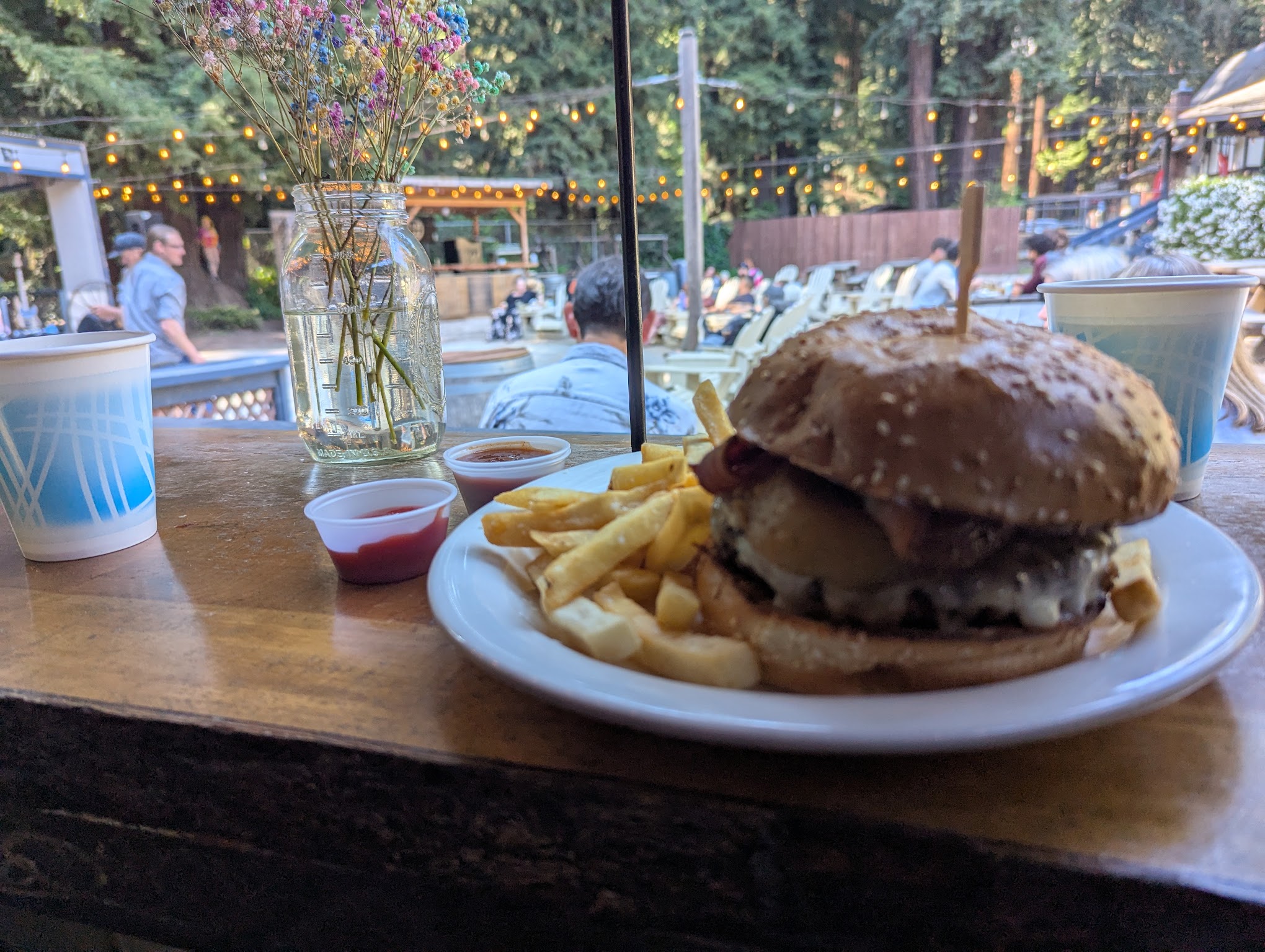 Amazing place to hang out with friends and have a few beers, the vibe is great and is in the middle of the redwoods so amazing views, the outdoors is pretty neat and has a stage for live music. Food is average, they asked me how I wanted my burger, I said medium rare, and they gave me the most overcooked burger, why they asked for my preference? Did not send it back cause I dislike to waste food, but the flavor was decent, all the components were good just super dry for obvious reasons. The fries were not bad but not amazing, nice seasoning but not all the way crispy. Will not come here for the food, this is a place to come with friends or family, drink and have fun. Seems they constantly do community activities so it is definitely a great place for locals.