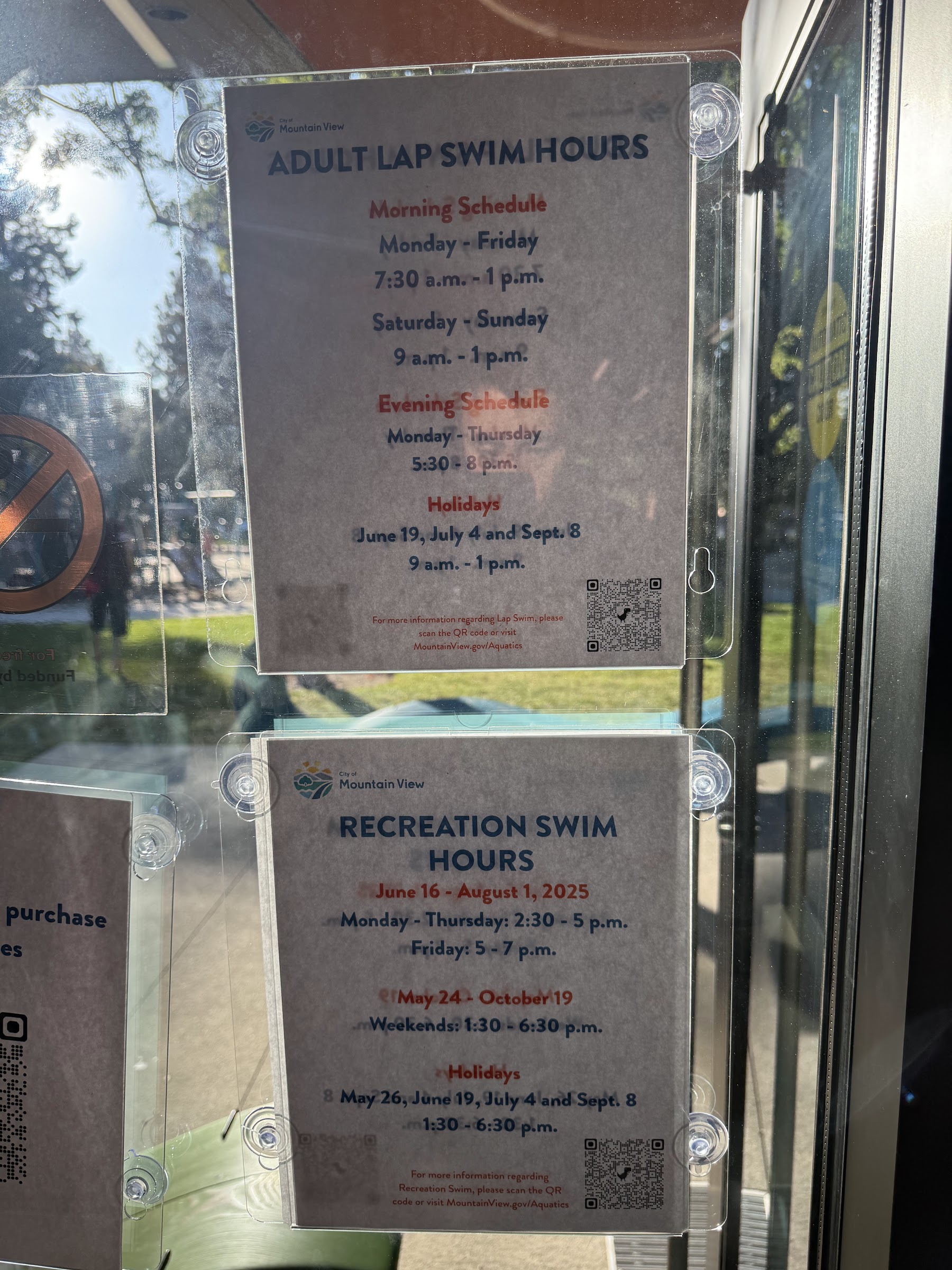 Firstly only $7 for non-resident drop in entry fee. Just slightly more expensive than my coffee that morning. Bay Area bargain! It’s only been open for a month so it’s brand spanking new. Water was the right temperature and didn’t taste weird or anything. They had signs for lap speed! Very rare in 🇺🇸 but very welcome. Swam with a speedy lad. Quarter star off for no timing clock anywhere. Not something that concerns me overly cos I can go off my watch but seems like a silly omission. They also didn’t open until 9am which doesn’t make sense but the hours get earlier in April so I’m assuming it was just for a soft opening. Nice warm individual showers with soap but limited bench space to get changed (the other quarter star deduction). And of course it was a 25yrd pool instead of a 50m but I’ll probably go to my grave waiting for that to happen here but I’ll deduct half a star for that because you never know what the future holds. Anyways good job City of Mountain View getting a new affordable pool together during this cost of living CRISIS.