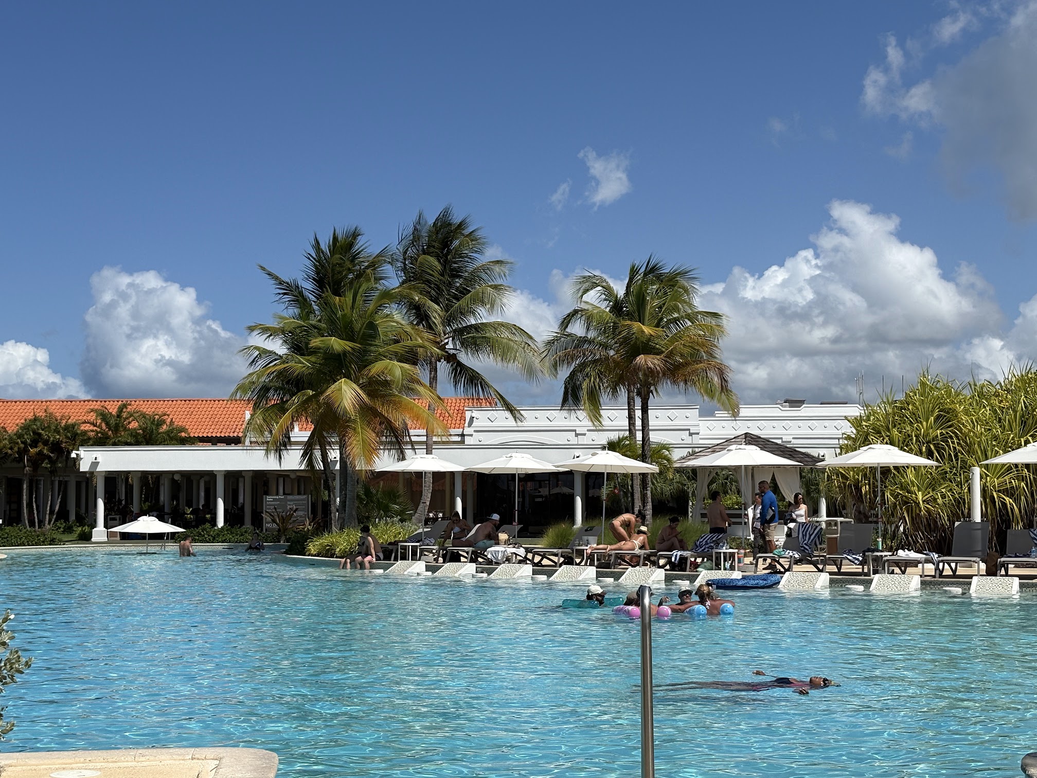 The Main Pool at the Hyatt Regency Grand Reserve Puerto Rico, situated in Río Grande, is a sprawling, lagoon-style outdoor pool. It acts as a central hub for guests, providing ample space for swimming and relaxation, often featuring poolside amenities such as lounging areas and a swim-up bar, all within the resort's tropical setting.