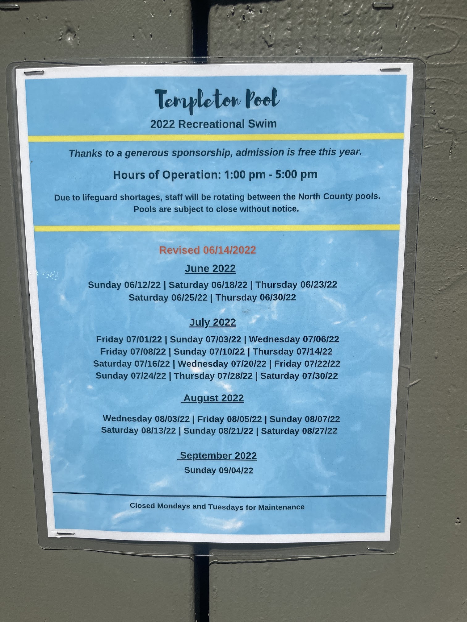 The Templeton Pool is typically heated to provide a comfortable swimming experience for its patrons. While specific daily temperatures may vary, community pools of this type often maintain water temperatures in the range of 80-82°F (approximately 27-28°C) during operational hours.