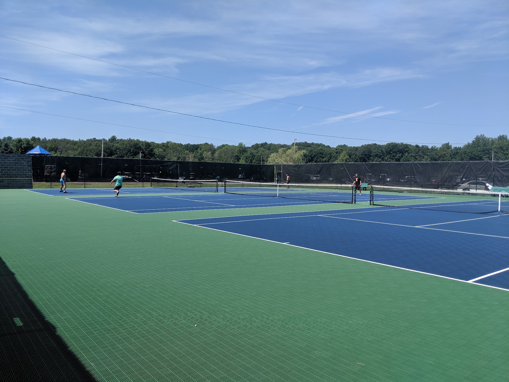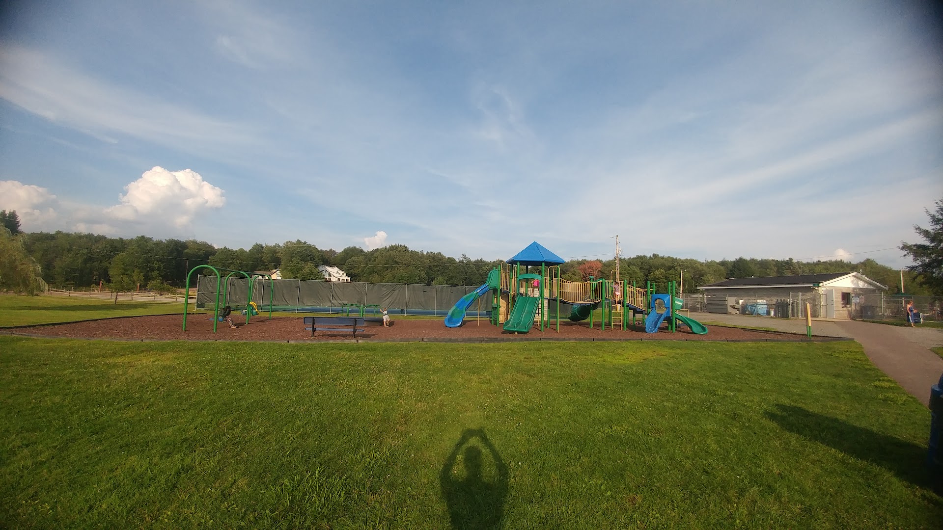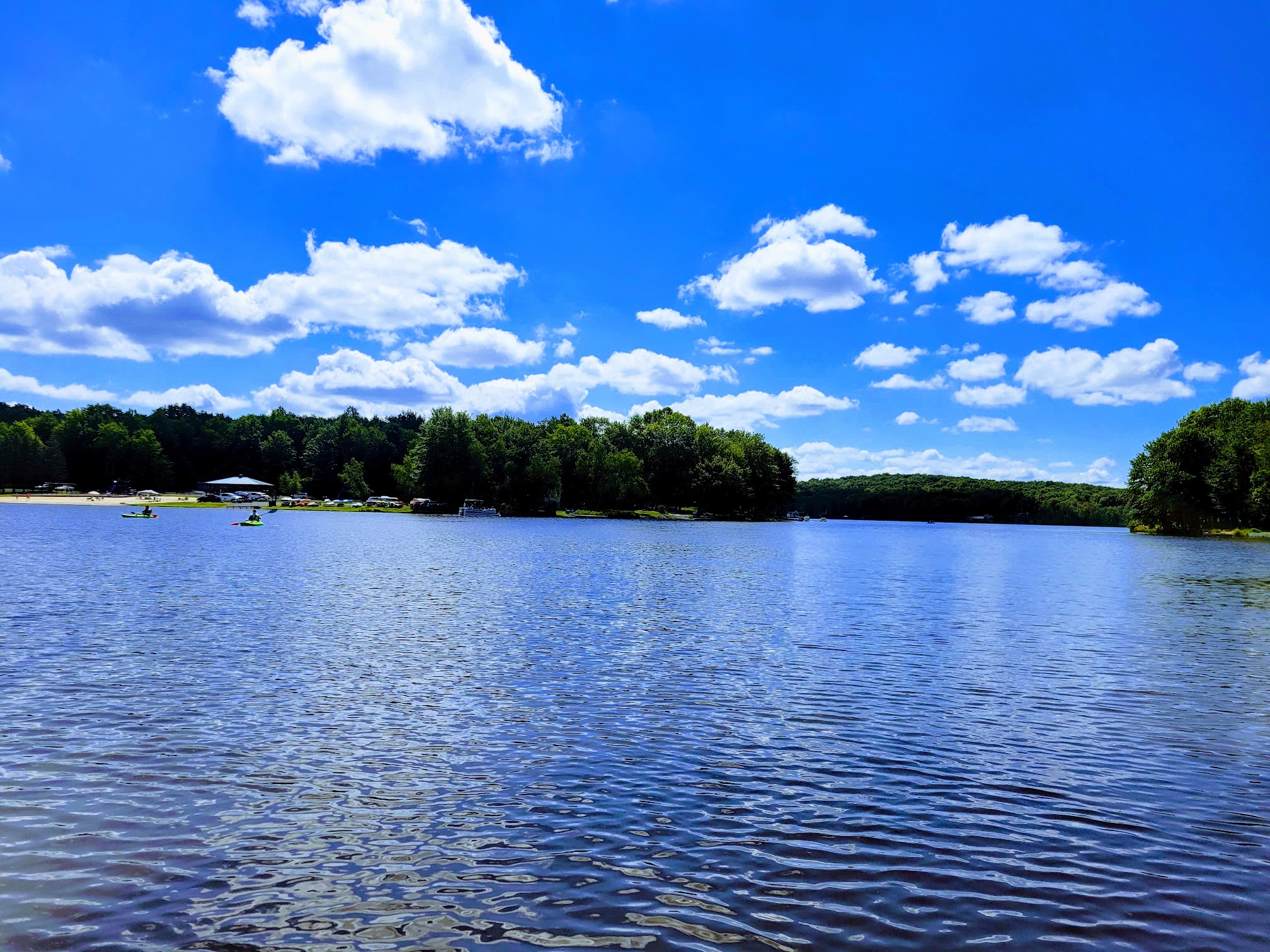 Both ends of the pool are shallow so good area for little ones to wade around in. There's a separate mini pool for infants and toddlers as well. The life guards or rules don't allow for kids to swim b/w railings or sit or hang onto so they were constantly reminding kids of that. Infants in circular donut floaties weren't allowed past the buoy lines even with adults. Of course no running on deck or jumping or diving into pool. There's a small concession stand here for snacks and drinks. A little shower just outside of bathrooms along with water fountain. The playground is just out front next to tennis courts. There's a boat launch just behind which was convenient for our kayaks. There's a kayak and perhaps canoe rental by parking lot. Large covered area with many tables along with grills just along lake. A beach volley ball court in the same area as well. There were seven small tables with umbrellas which were usually the first taken. Plenty of grassy area to set up all around the pool.