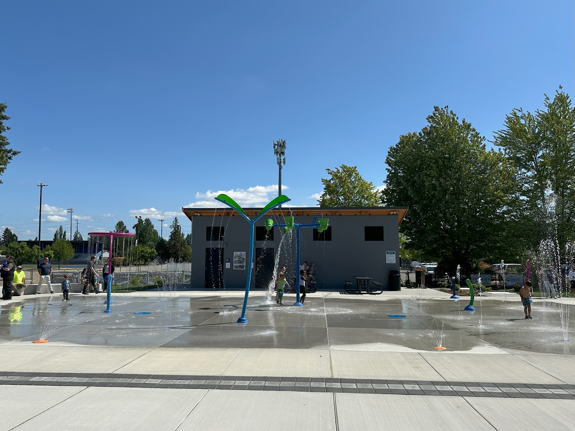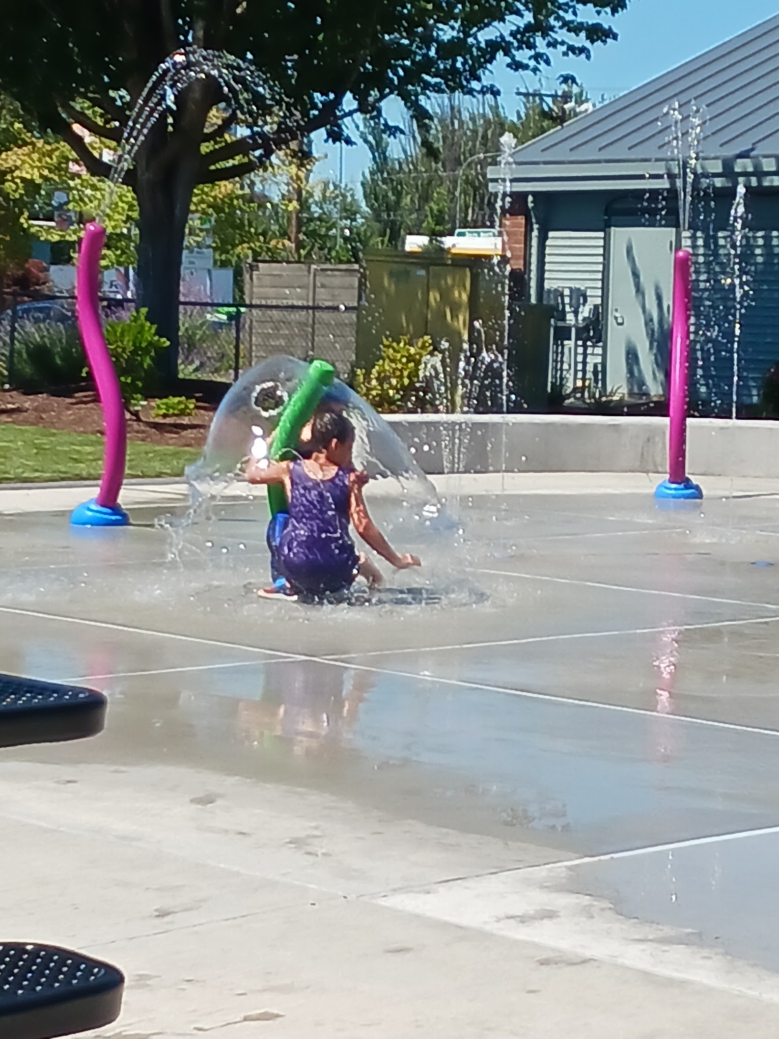 Very nice- not super busy. Picnic tables, clean bathrooms, a few areas with shade. Variety of spraying toys. Must press button to turn water on once it turns off. Fife feels sketchy but being right next to the fire department makes it feel safer.