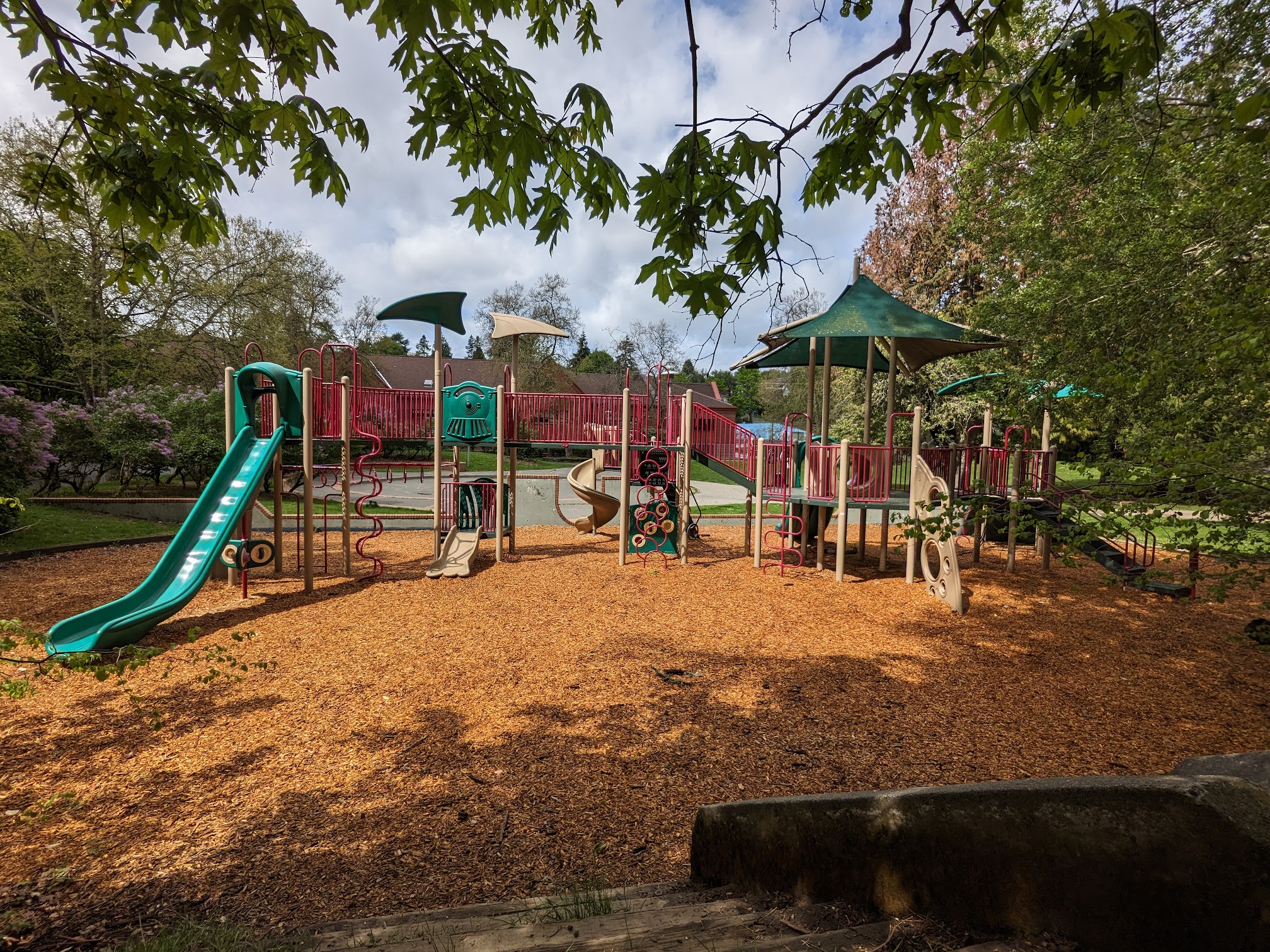 Great park for preschool/early elementary age kids, especially on summer days when the wading pool is open (Mon/Tues this year). The playground is somewhat shaded, there are woods to explore behind the playground, and there is a wading pool. The park has a decent amount of shade. Bathrooms are totally fine by public park standards.