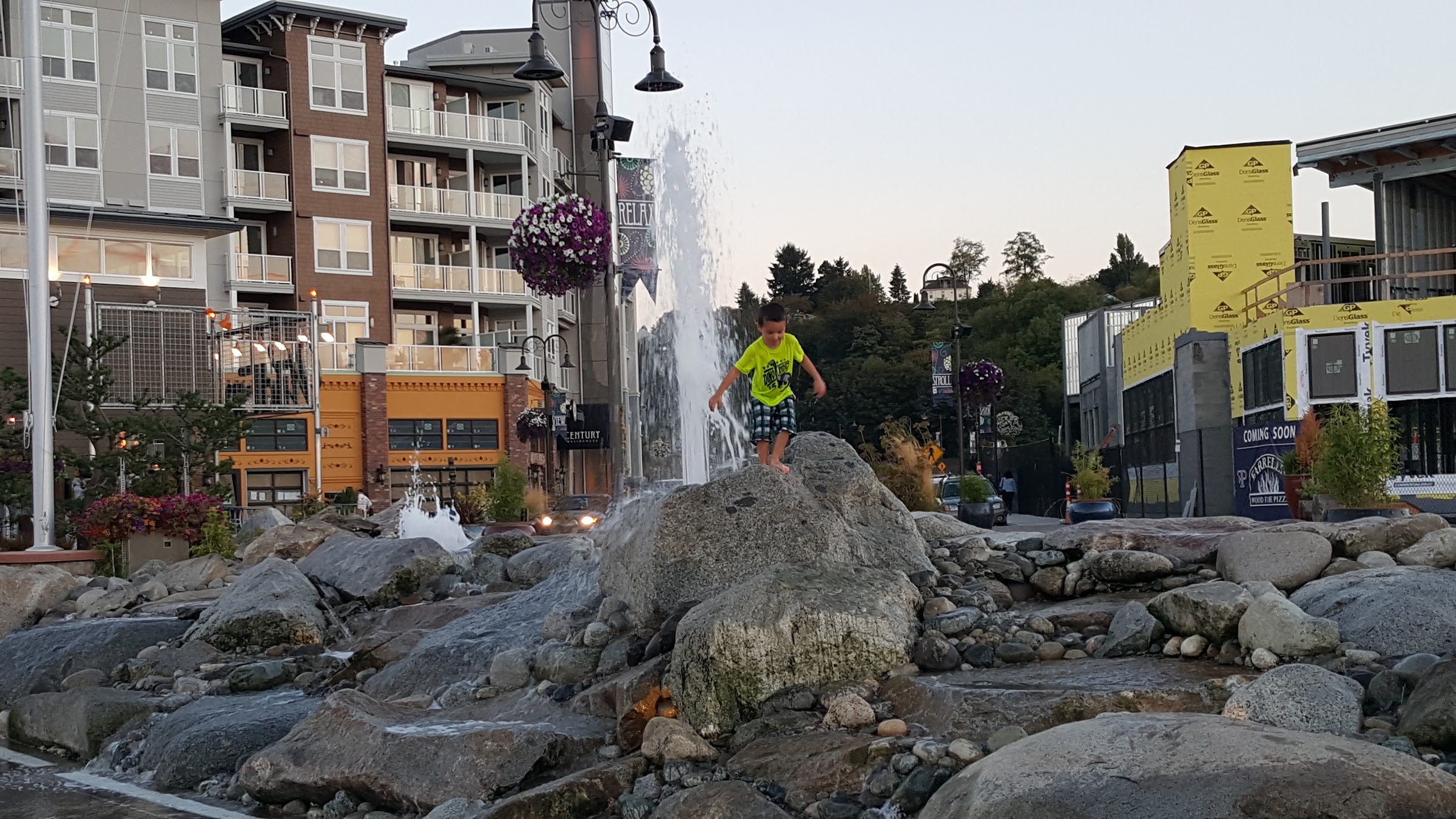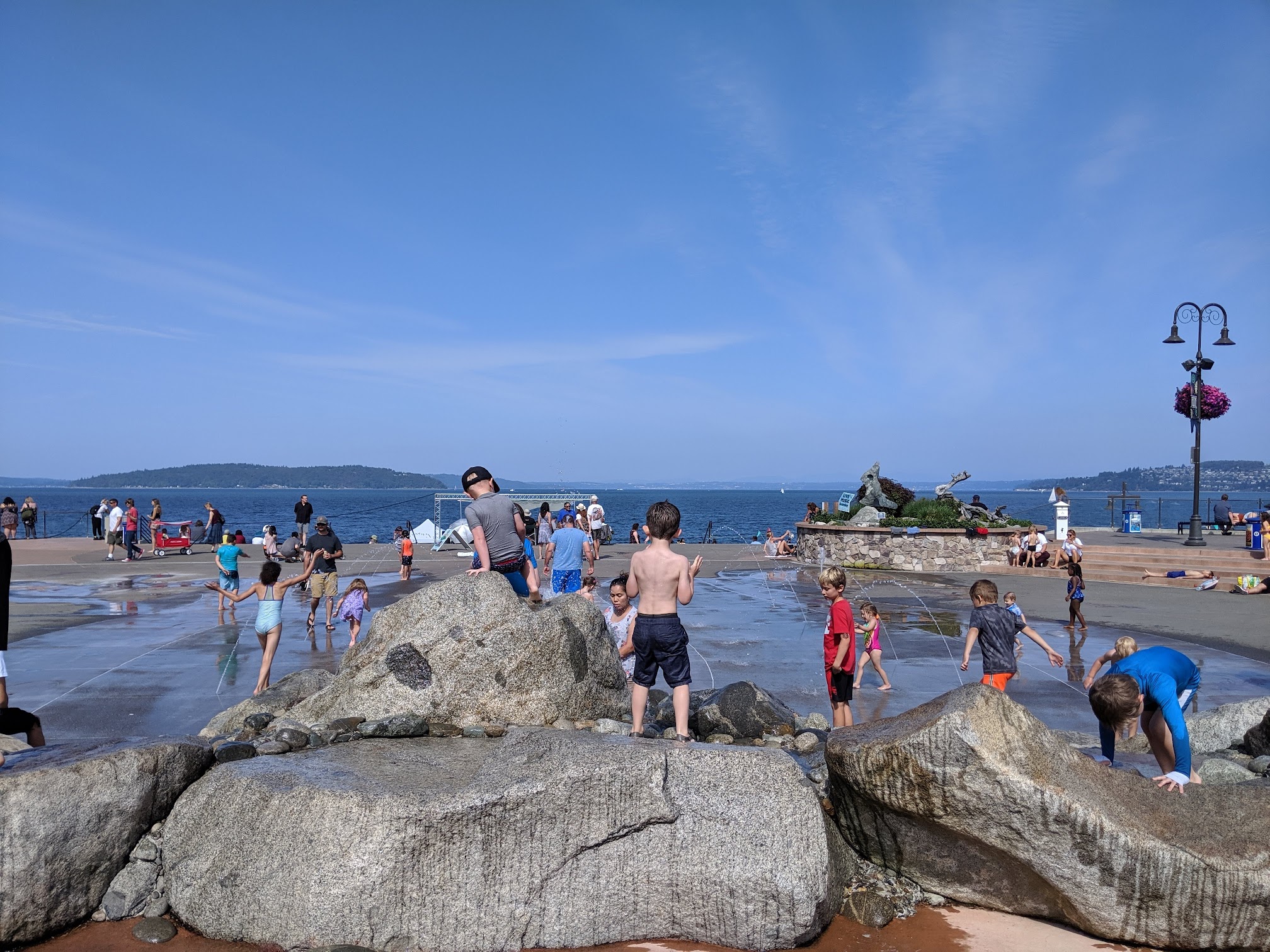 Clean waterfront park with rocks and fountains for the kids to splash in.