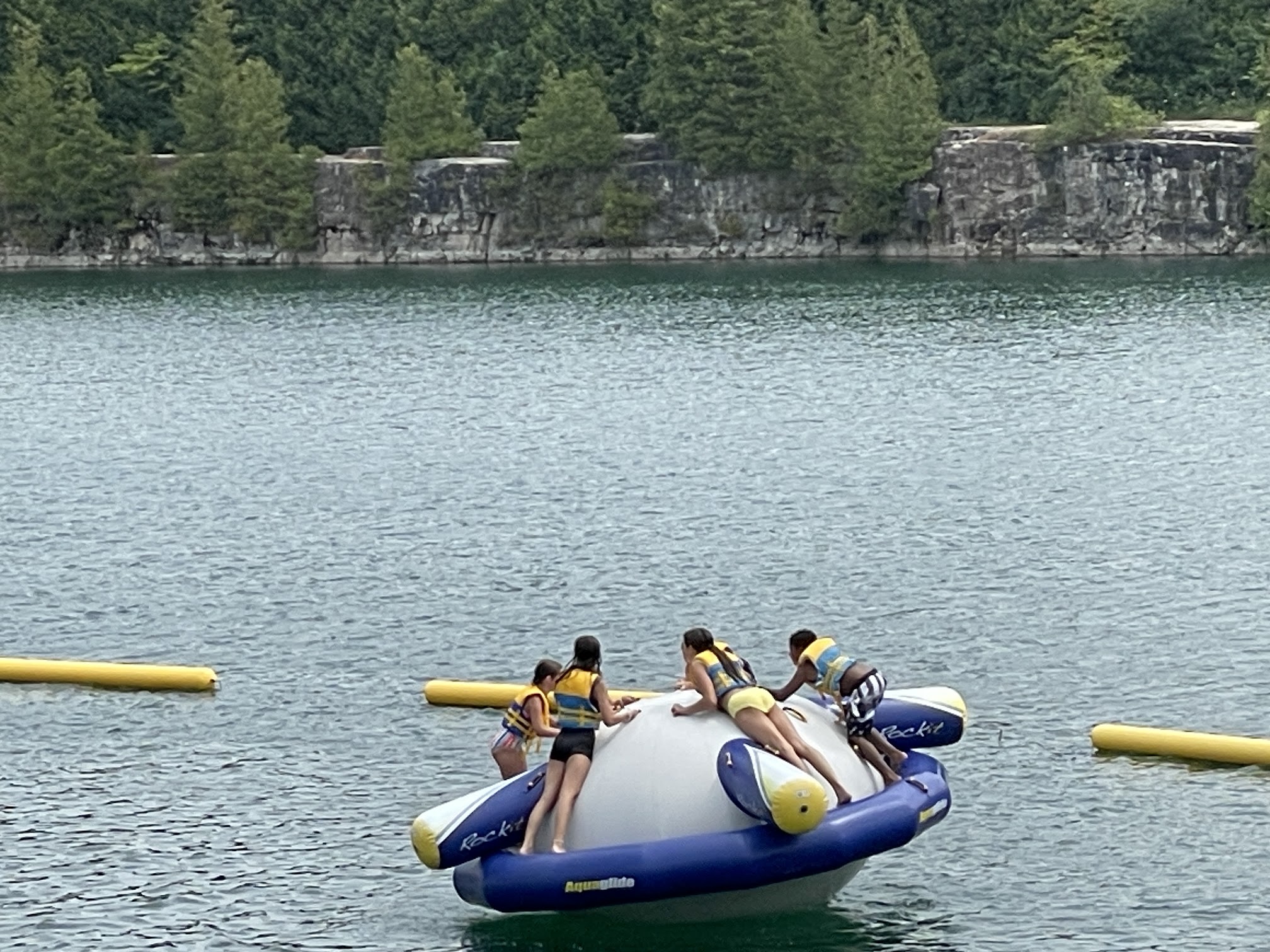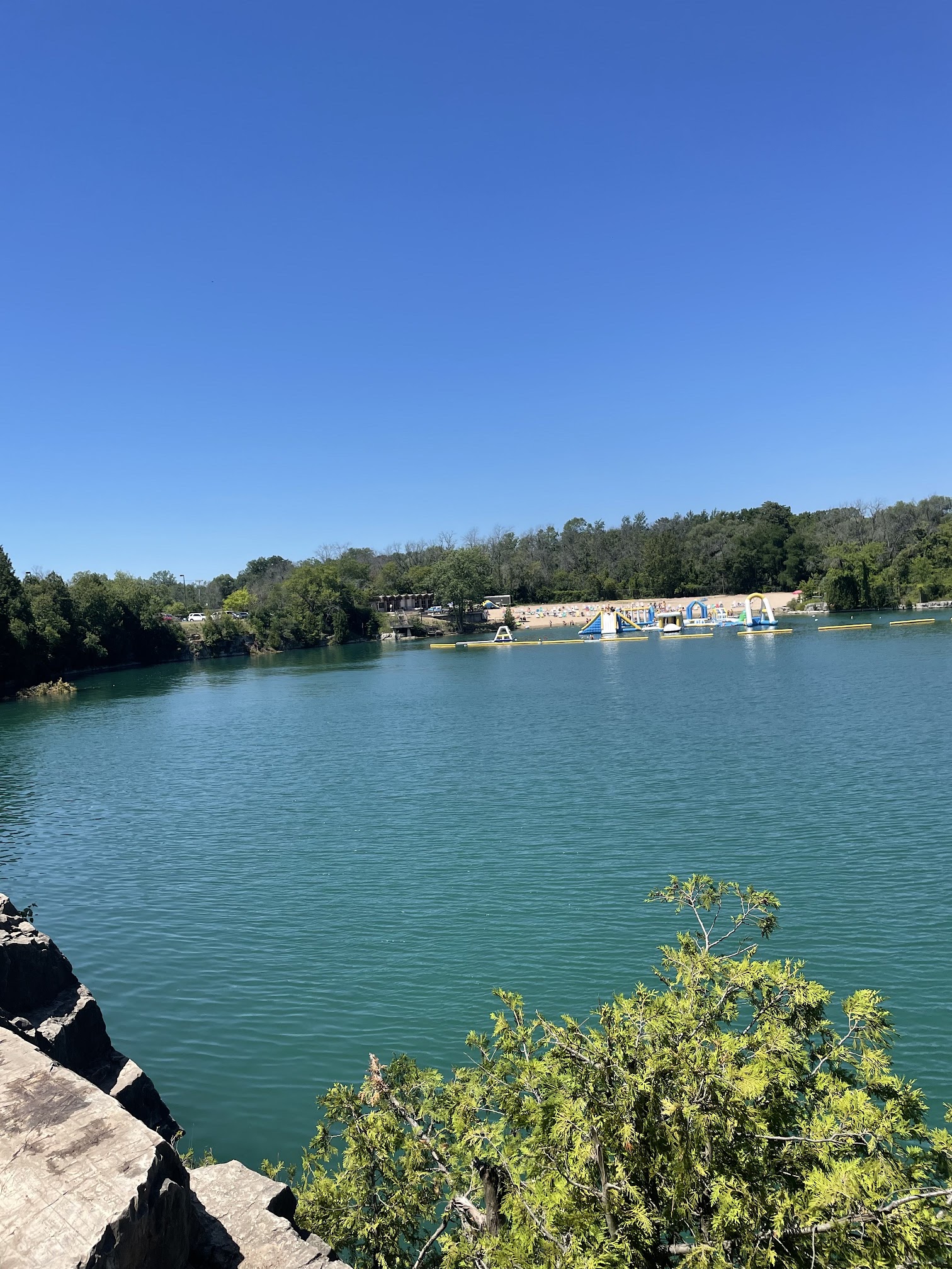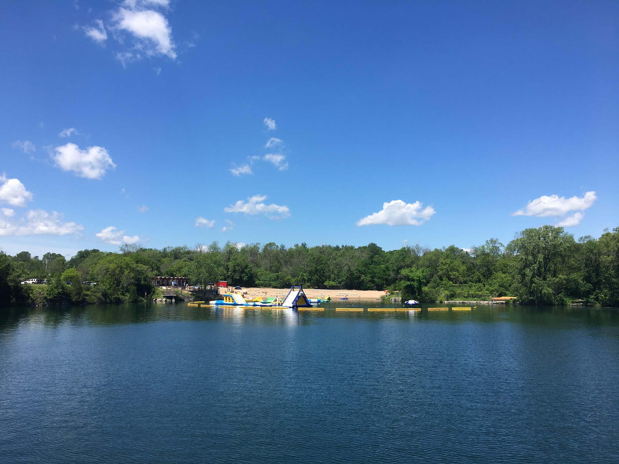 Very cool place. First of all, all the employees we encountered were very nice and helpful. They're only seem to be a few, but they were working hard. I know every place is kind of shorthanded right now, so awesome that they can keep this place open. This park has a large parking lot, and we went early to try to beat the rush. For the first hour and a half or so it was not busy at all. They do require life vests if going on the equipment, which is an awesome extra safety precaution. This is especially good because there are not lifeguards. If just using the beach and staying in the shallow, they're not required. The water was fairly warm, and the equipment was in very good shape. Sturdy. Kids appear to have a good time, although to forewarn you, the equipment is slippery due to the water. Nothing you can really do to fix that, and my kids didn't seem to mind, but they probably fell dozens of times. I probably would have died. True story. The beach does have a variety of different types of lawn chairs available- bonus you don't have to drag your own here, yay! As it got to be later in the day, it did get busier. Warmer too. There are restrooms in the main building, a variety of snacks for sale- candy, chips, ice cream, and a couple of kayaks you can take into the quarry.