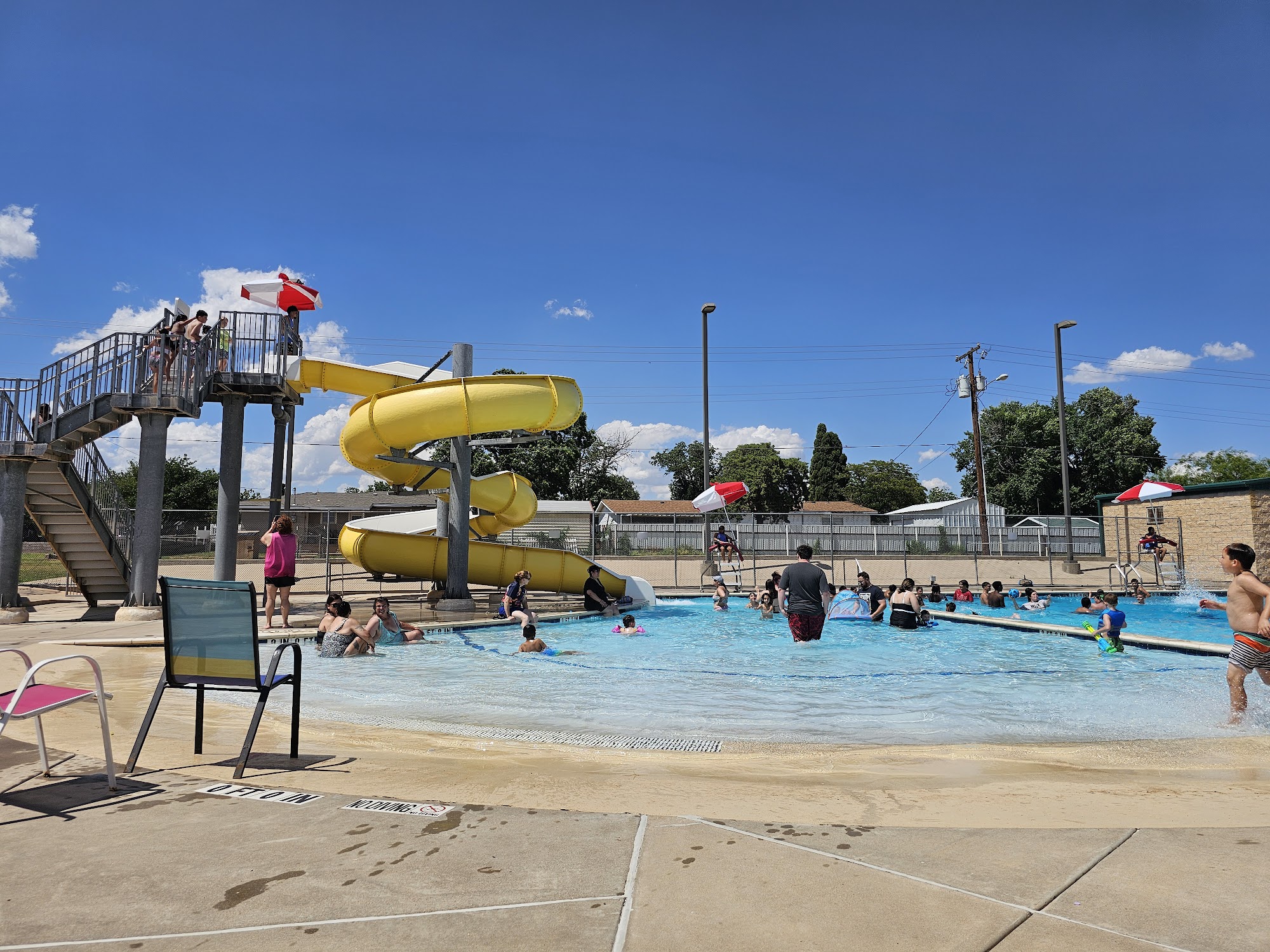 Like most west Texas pools this pool is only open from when the schools are out to when they go back in (memorial weekend- first week of August) - most the lifeguards are teenagers. The parking lot is huge and there were no issues with parking. The cost to get in is $3. The pool is right next to the splash pad- however- the splash pad is free. They have one covered area from the sun that fills rather quickly. I wish they had some lounging chairs but there is enough space to just lie out a towel. They have a very nice slide that has a gentle bend. They also have a diving board. The pool ranges in depth up to 9 feet. It’s a clean and nice pool. Everything at the snack shack is $1- which is very nice. Overall- it’s a solid pool.