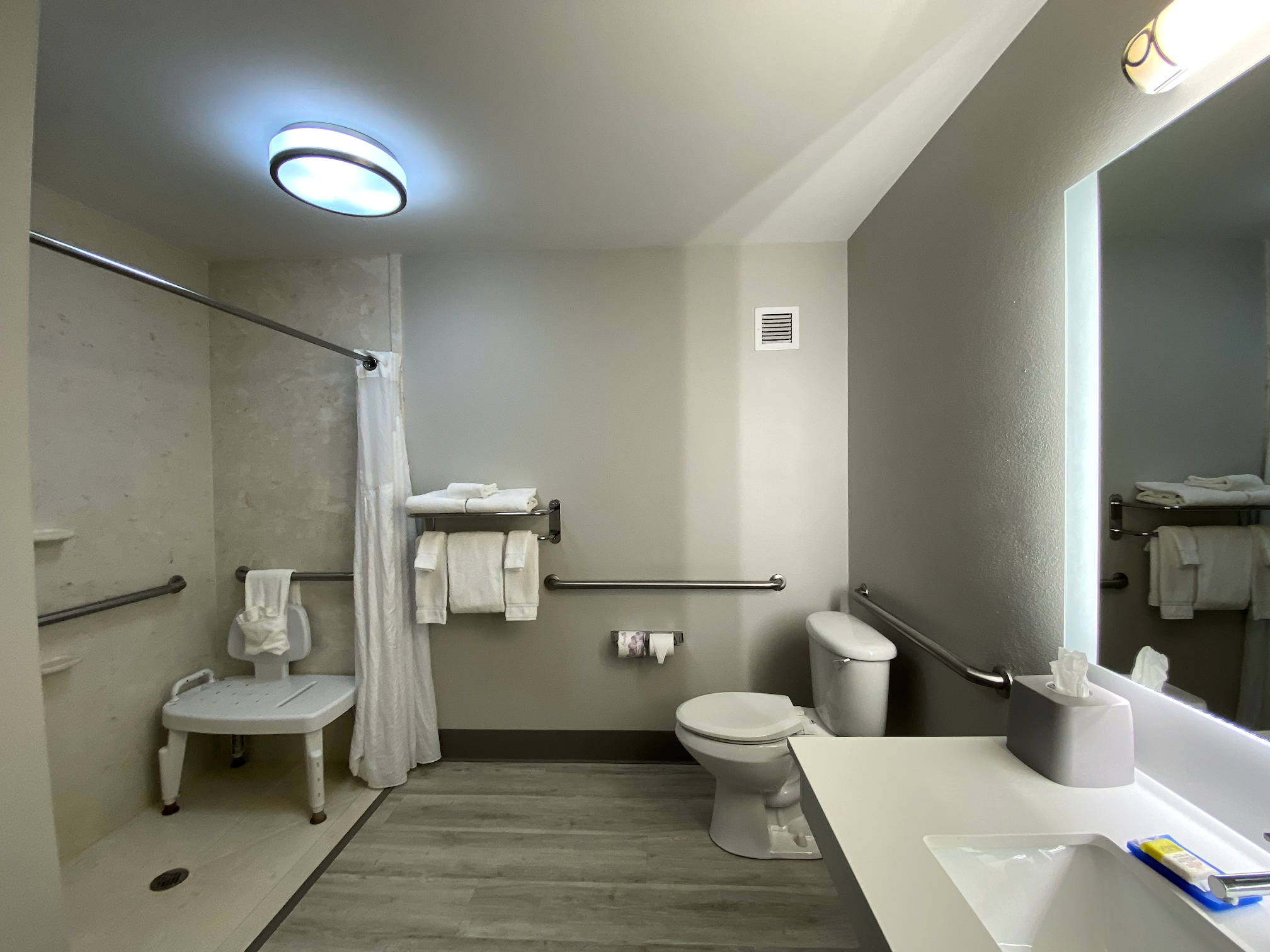 Room seems clean. Air conditioner is either silent or "loud" (not noisy like it's broken). Microwave and fridge. No in room coffee maker, but coffee is available all hours in the lobby. Lobby staff was friendly. Cleaning staff in hallways were friendly (usually a rarity). Wash cloths in our room were dingy yellow (gross), seemed clean, just dingy. No ventilation in the bathroom, mirror wouldn't clear without door open or wiping with a towel. Have stayed at this location several times. (Business trips).