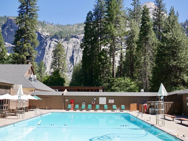 The Curry Village Swimming Pool, now an amenity within Half Dome Village in Yosemite Valley, offers a popular seasonal outdoor swimming experience. Situated amidst the stunning backdrop of Yosemite's iconic cliffs and towering trees, it provides a refreshing escape for park visitors and guests staying in the village, typically operating from late spring through early fall.