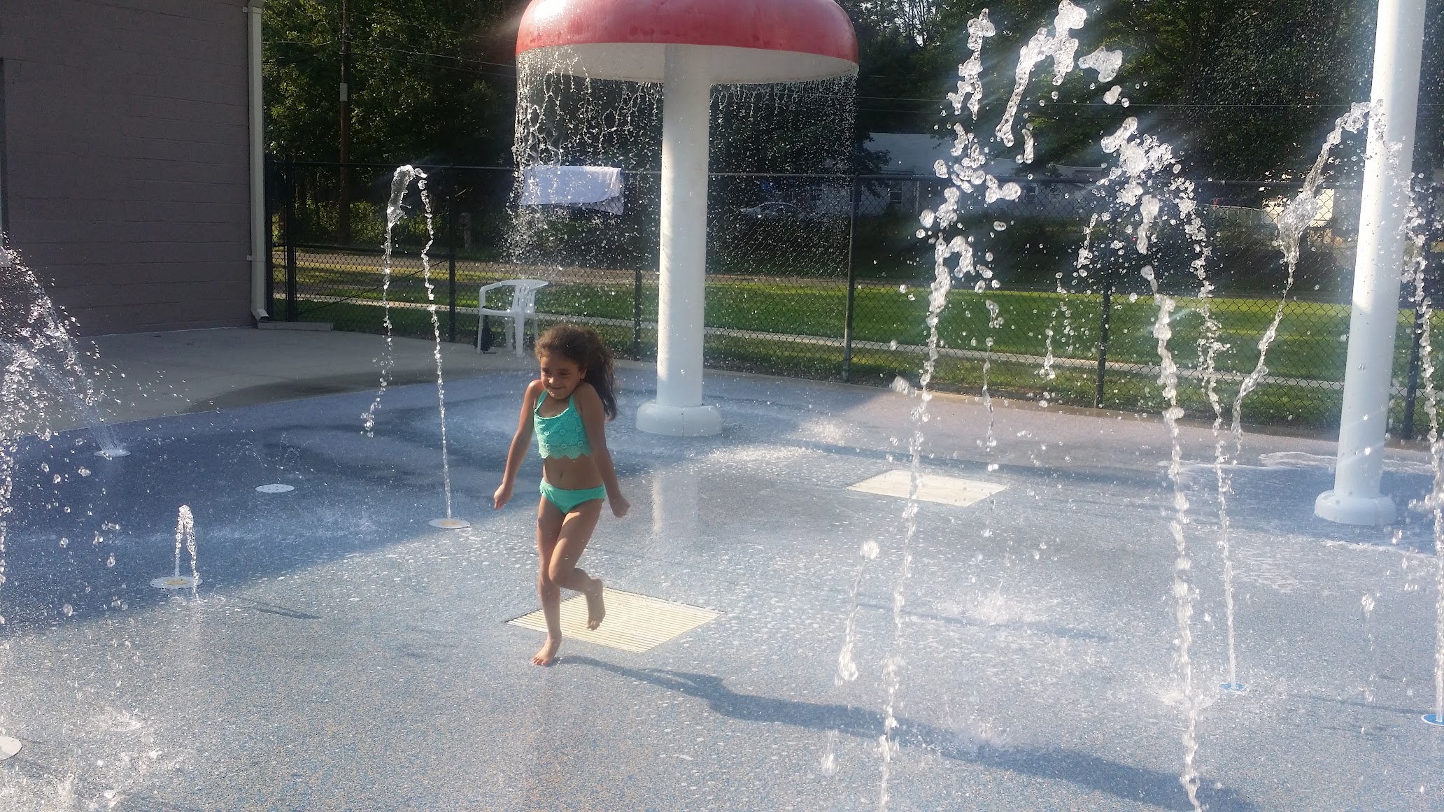 Public pool with a sprinkler, good for children.