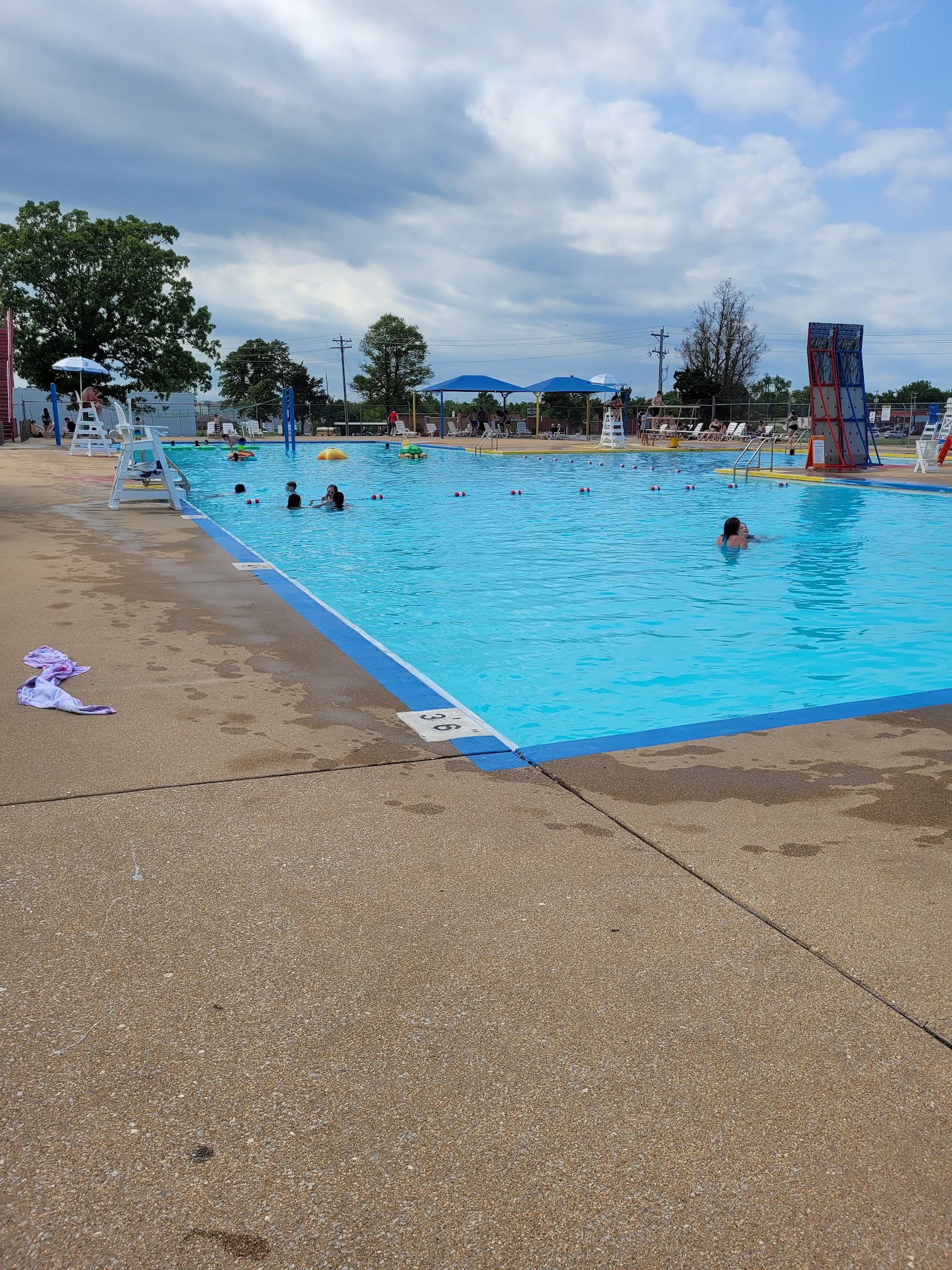 The public pool is nice but the bathrooms are disgusting and never clean and the bottom of the pool is so nasty and none of the slides were working and the Lilly pads did not have the safety nets and there is paint chipping off of everything good pool but needs a big upgrade and better cleaning