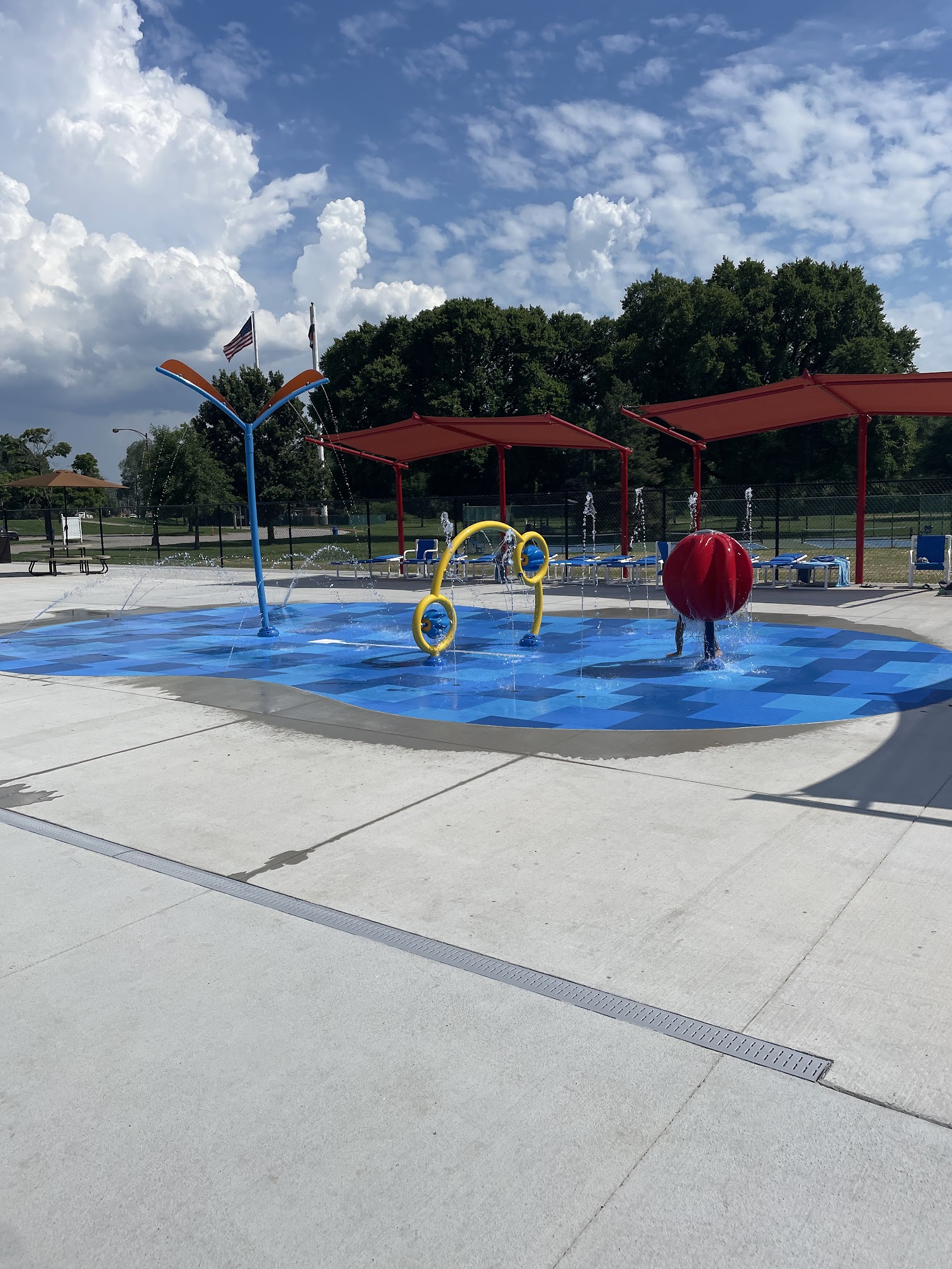 Community park featuring a public pool with a diving board, plus a slide and a splash pad.