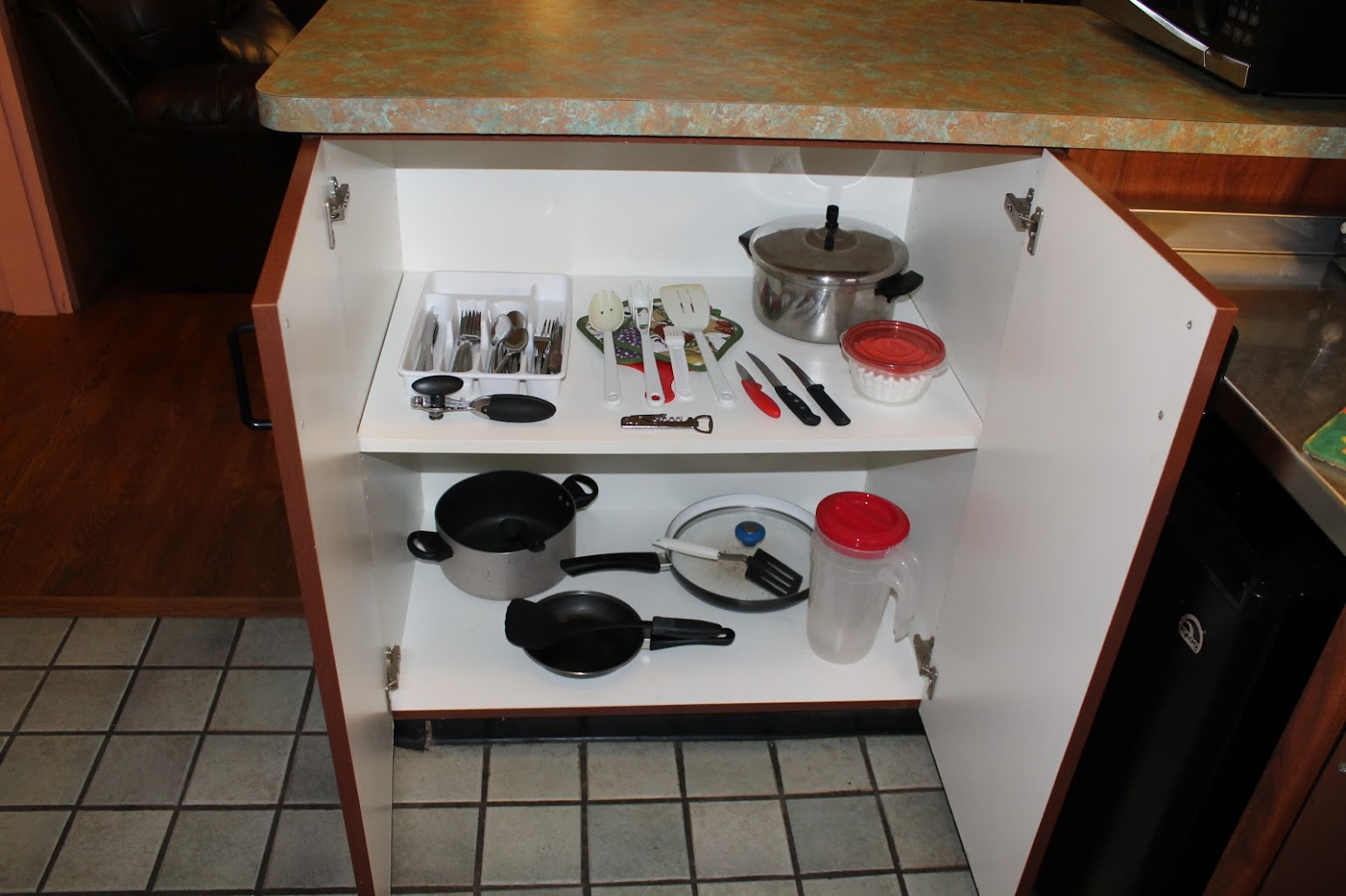Very small kitchen. Only 1 burner worked on the cooktop, dorm size refrigerator. Could use a good cleaning, as we saw lots of cobwebs, and gnats. Beautiful scenery, right on the lake, and pretty grounds. The bed left a lot to be desired. Overall...ok
