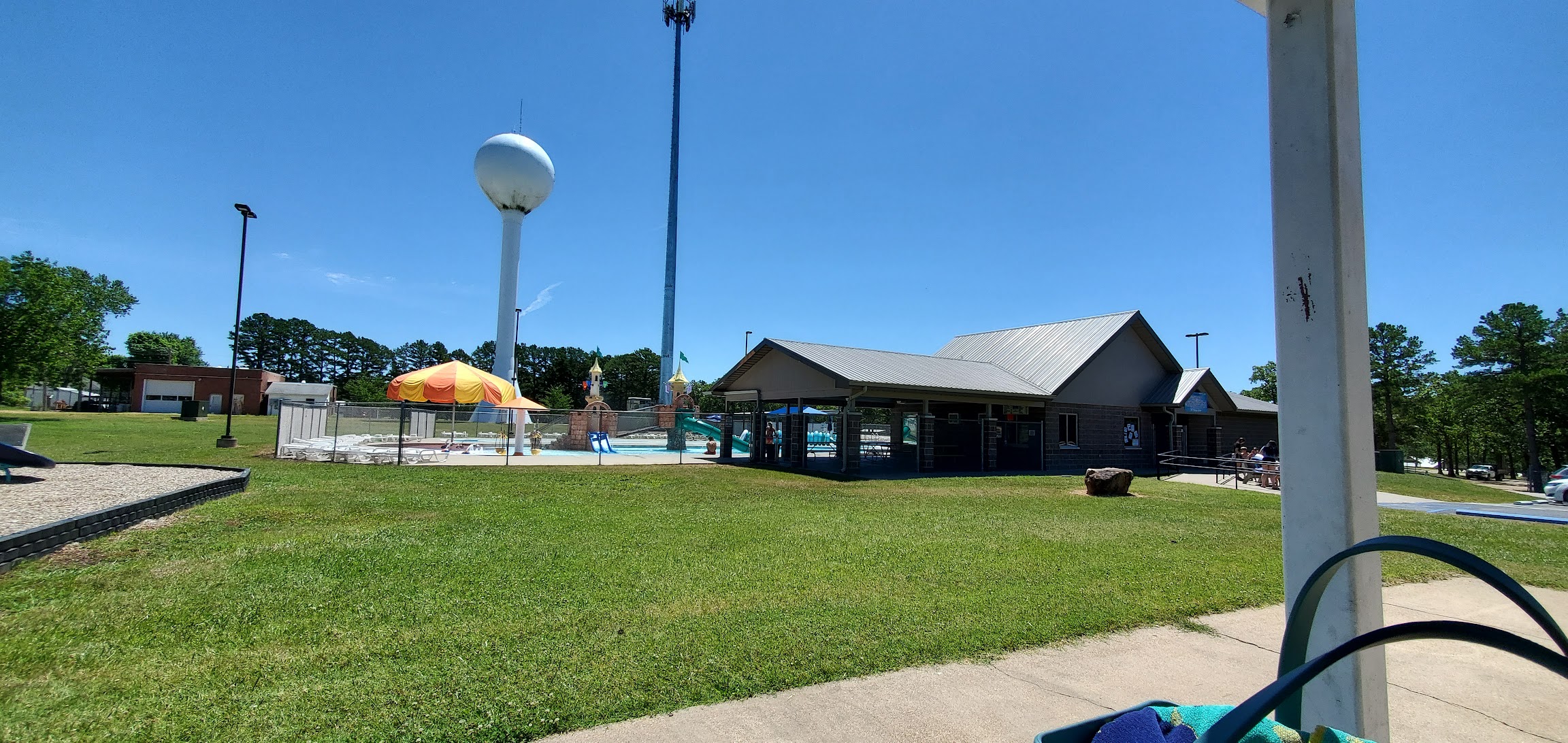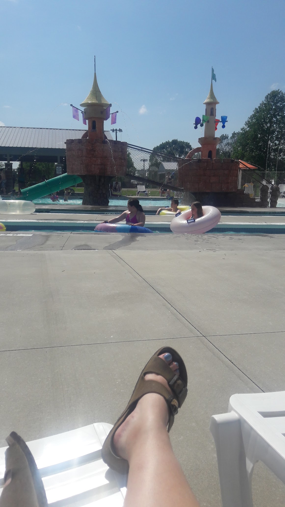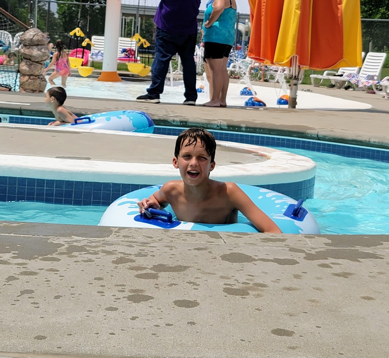 It is a little bit of a drive for us but for younger kids this pool has a lot to offer. In addition to a water playground with slides and bucket dumps there is a merry go round swing for babies and a lazy river. There is one twisty slide for older kids and a diving board. The snack area is set up with picnic tables and is completely covered. On the same grounds but separate is another covered pavilion and playground. The entire facility is clean and the lifeguards are very nice and very vigilant.