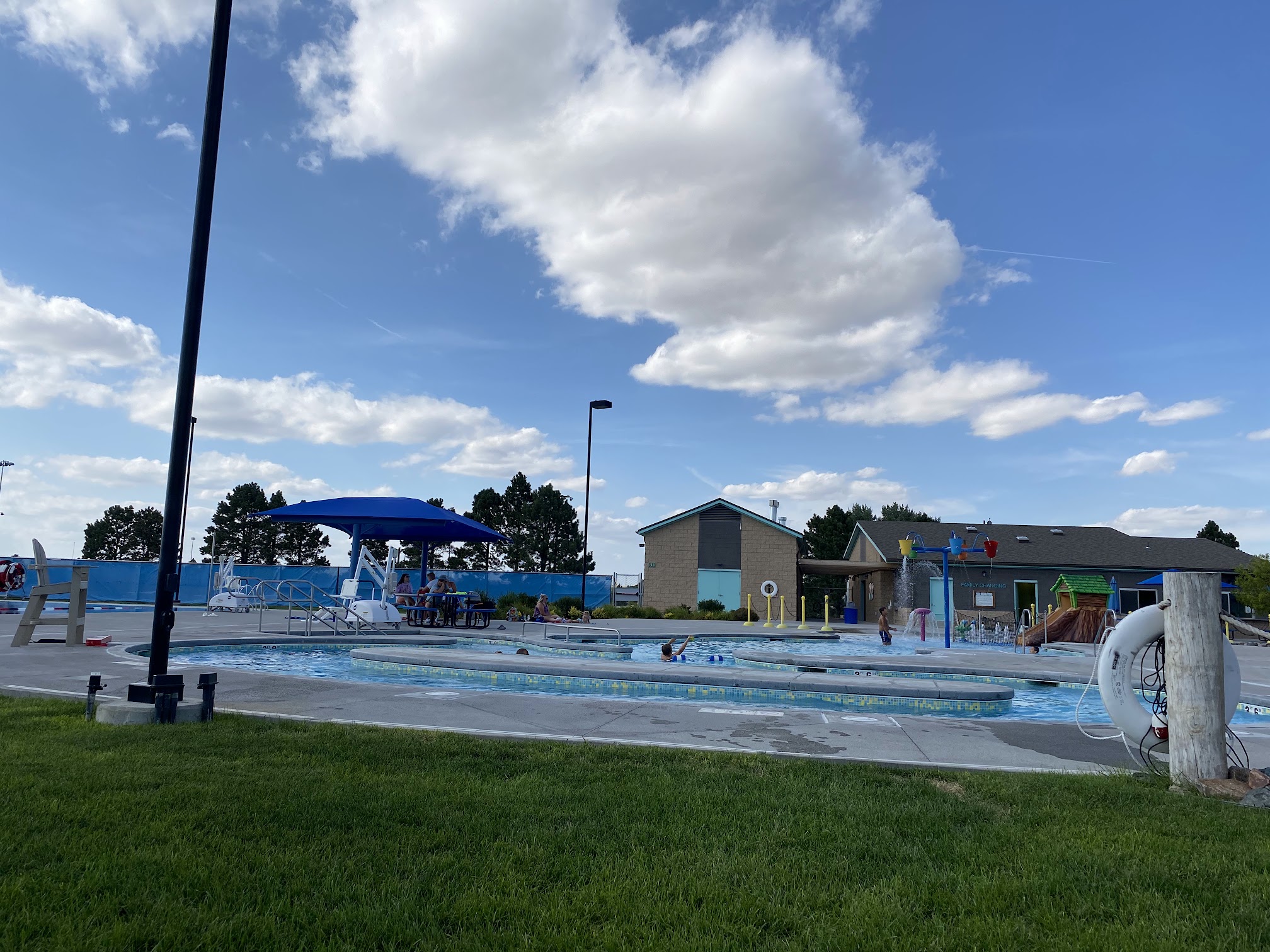 It's more expensive than other water parks. Has a lazy river and a splash area and pool for toddlers. Showers and toilets are the standard for pools. Food is sold here and price for that is similar other water parks. Life guards on hand there is adult swim time