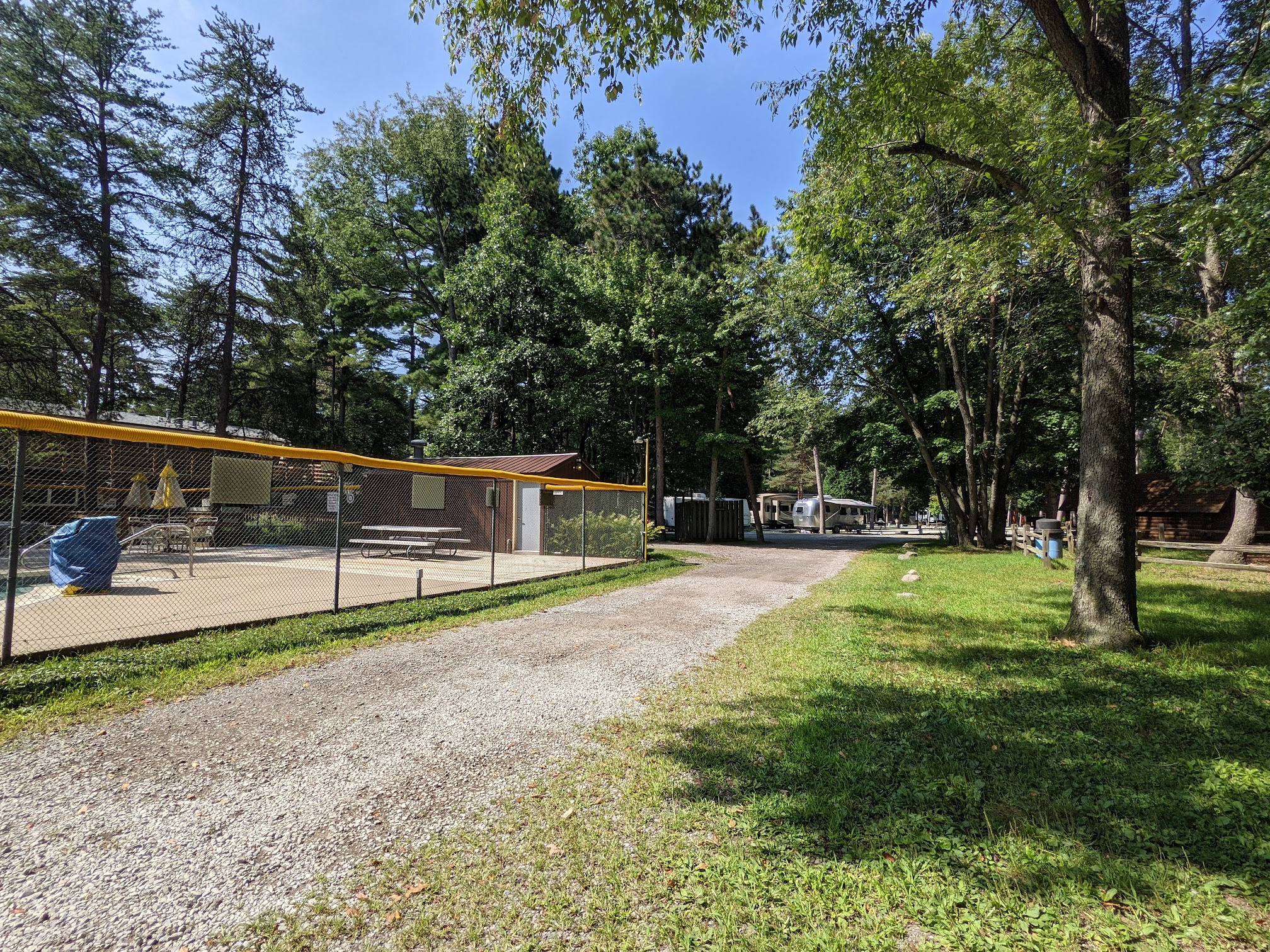 Our friends had stayed here two years back and enjoyed their stay so they asked us to join them on this trip. It’s roughly almost three hours north from us so we got there on Thursday around 4 pm and check in was a breeze. This campground is tight for turning and the sites are small, but there are a lot of trees. We did have a pull through full hook up site. We were so bummed the pool was closed because it was so hot and we were looking forward to using it. I do think a a heads up from the campground would have been nice in regards to this. We made our reservations in January and would not have known this to be the case. The restrooms were clean and they had individual showers that could be used. There were a lot of golf carts that could be rented there, but not sure why they would be needed as the campground is not large. Was really glad the site next to us decided that a fire was not needed as their fire ring was not far from our slide out and that would have been nerve wracking. Their map shows two dog runs, but there is only one and it would really best serve small dogs. It backed up into weeds and we didn’t use it for fear of the poison ivy and such. You could see where the other one was before but it was completely overgrown. It seemed as this is mostly used as a stop over and that makes sense for the one nighters we saw come through. There do seem to be several seasonal sites and quite a few cabins. One cabin had what looked like a tree growing on it and there were spots where trees had been cut down, but the stumps remained. Also-this is very close to train tracks and you will hear the train all the time, including overnight. The staff we interacted with were super nice and helpful.