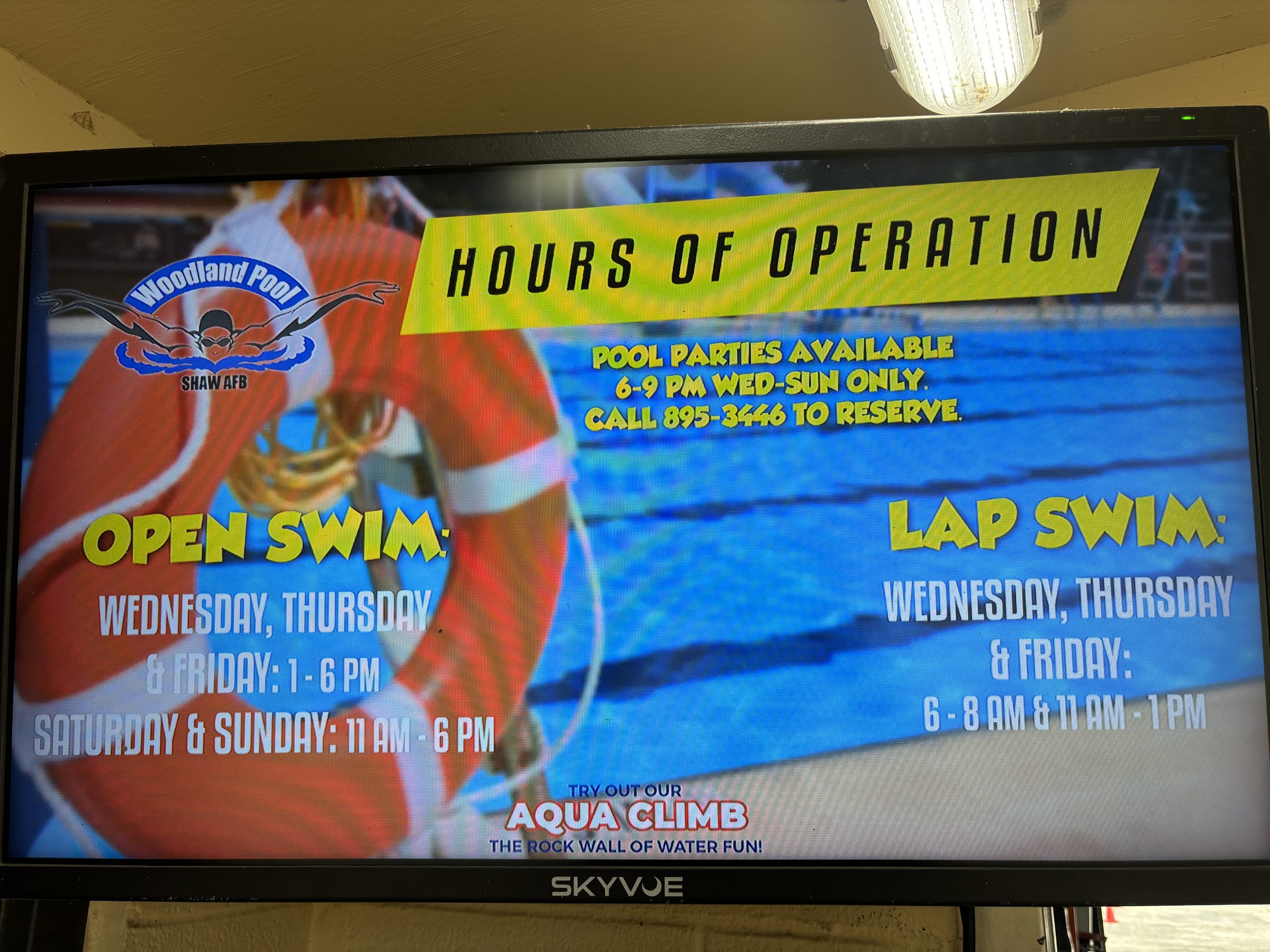 Makes me mad to get the whole family together then get there and find it’s closed and it says it is open. Waist of my time what’s the point of having this on this base, if it is never open! We have a million dollar golf course but we can’t even have a functioning pool!