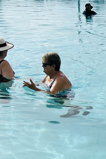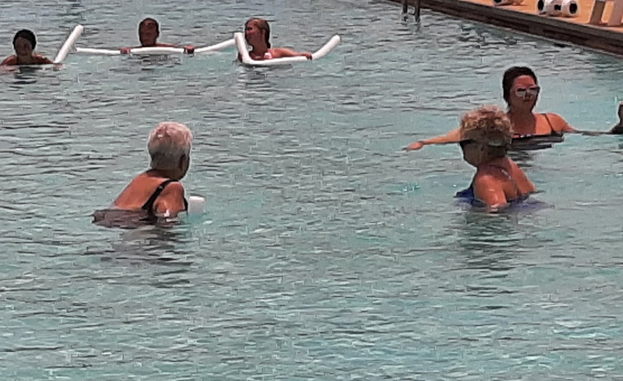 Swimming pool offering water aerobics classes with a public restroom.