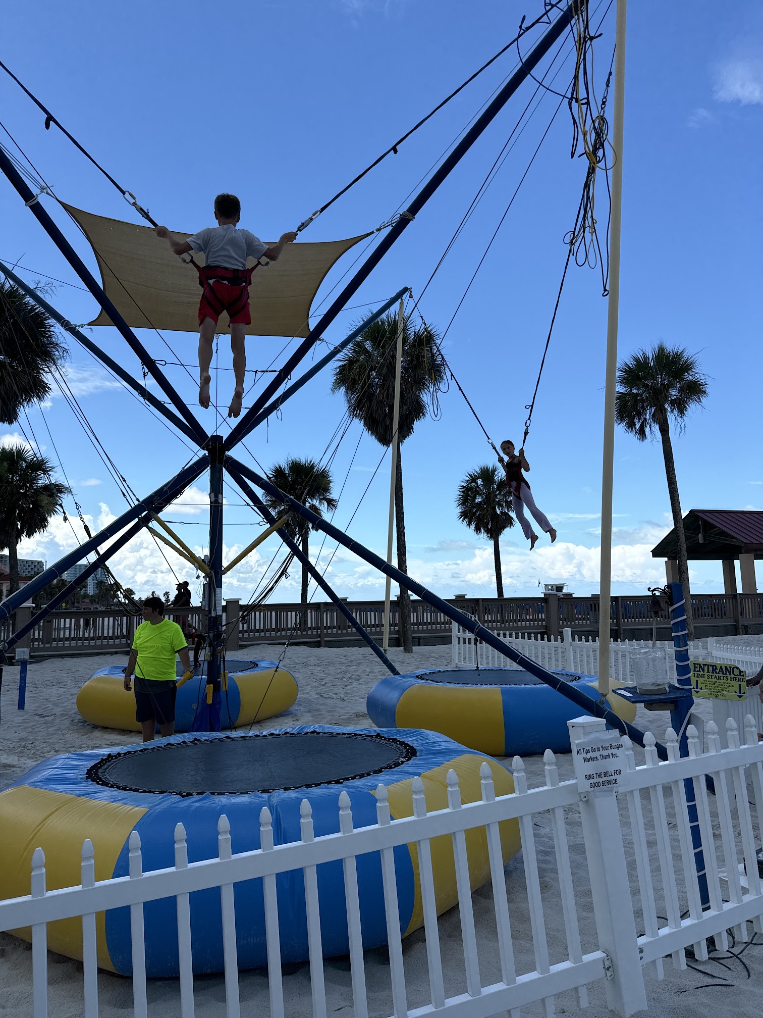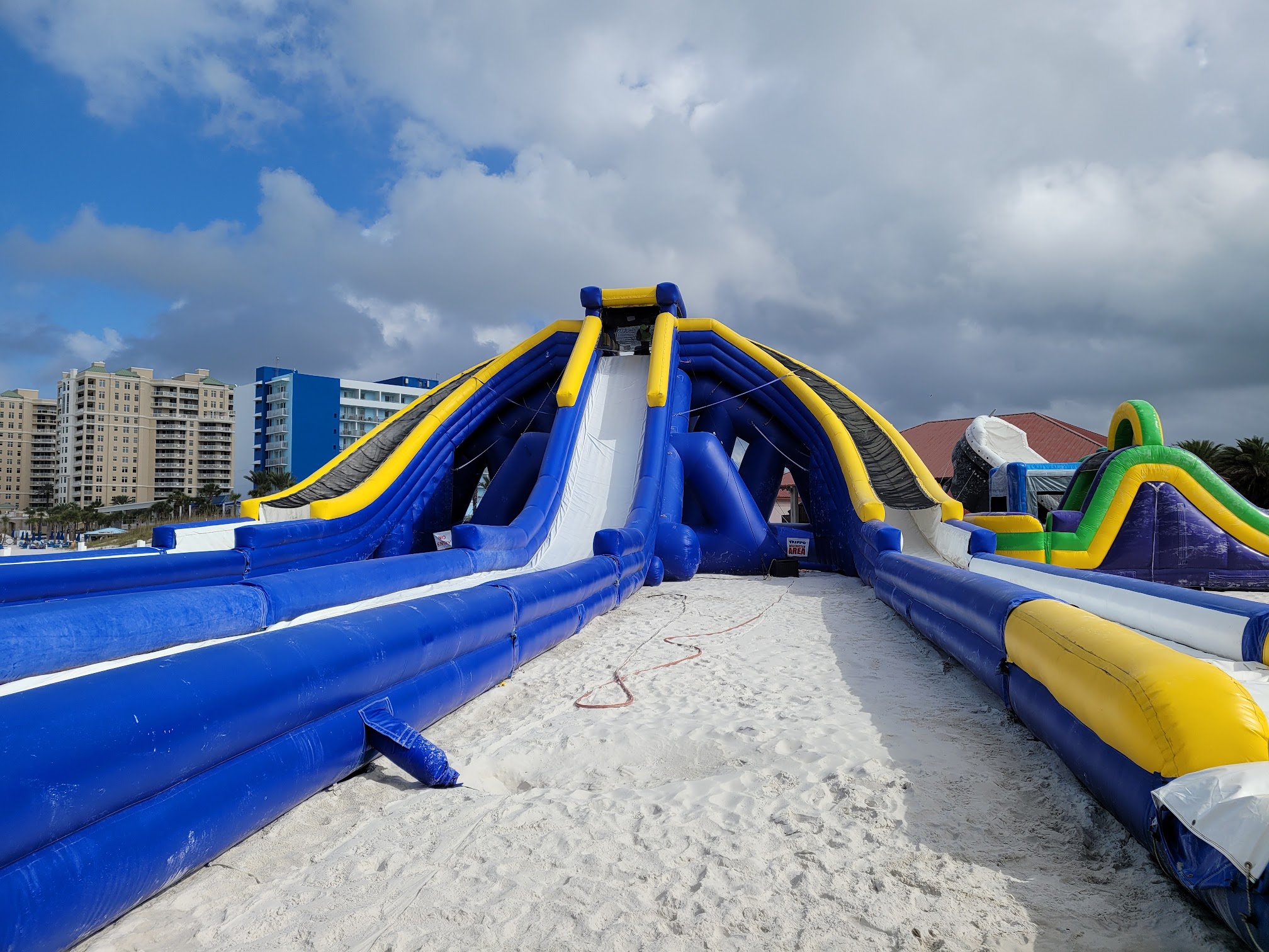 I took my two kids here. It looks like a great idea but most of the inflatables were too hot to use during the afternoon. I would try back in the evening hours to avoid this. The staff were crazy. The one lady explaining the process continued to yell that my kids were not listening to her explain. It was not that complicated but her tone definitely took some of the fun out of it. The large slide advertised as a water slide but really they just spray it down with water before the kids go on it. They also try to make an effort to keep sand off the slide but it’s on a beach so as you go down you will sometimes get sand in your face. We bought 14 individual passes but the kids only used 6 in total. It was not an all day experience.
