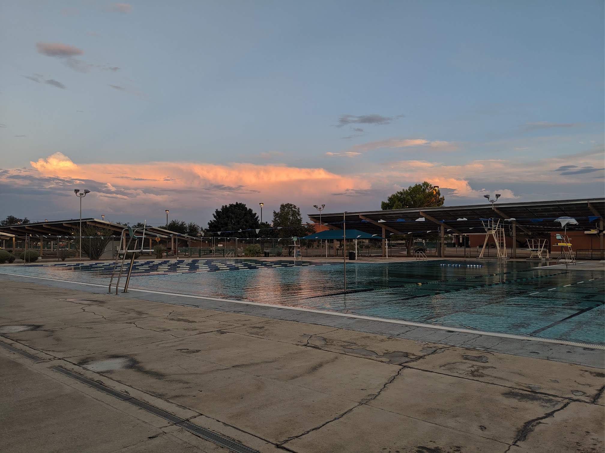 beautiful views from this pool. The pool is huge, and in decent shape, but it's concrete all around, so is very hot. Bathrooms could use a lot of repair, and it would be great if they would put soap by the sinks instead of at the lifeguard station.