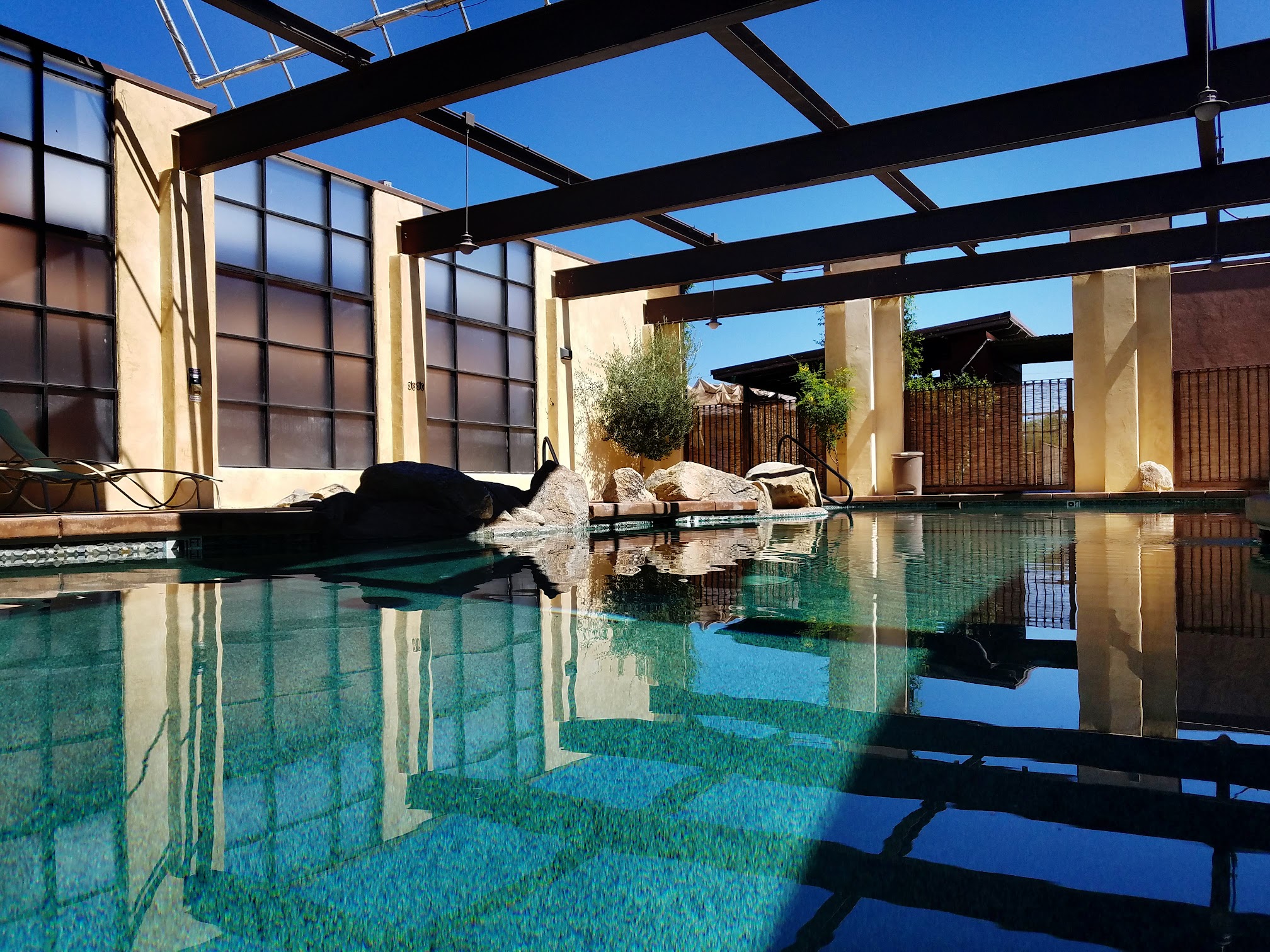 Absolutely perfect place! 2 heated spa pools, 1 larger lap pool and a cool plunge pool. Quiet, serene spot away from the chaos. Time to contemplate more peaceful thoughts.