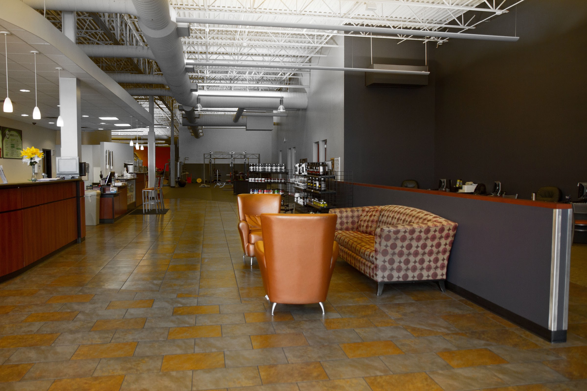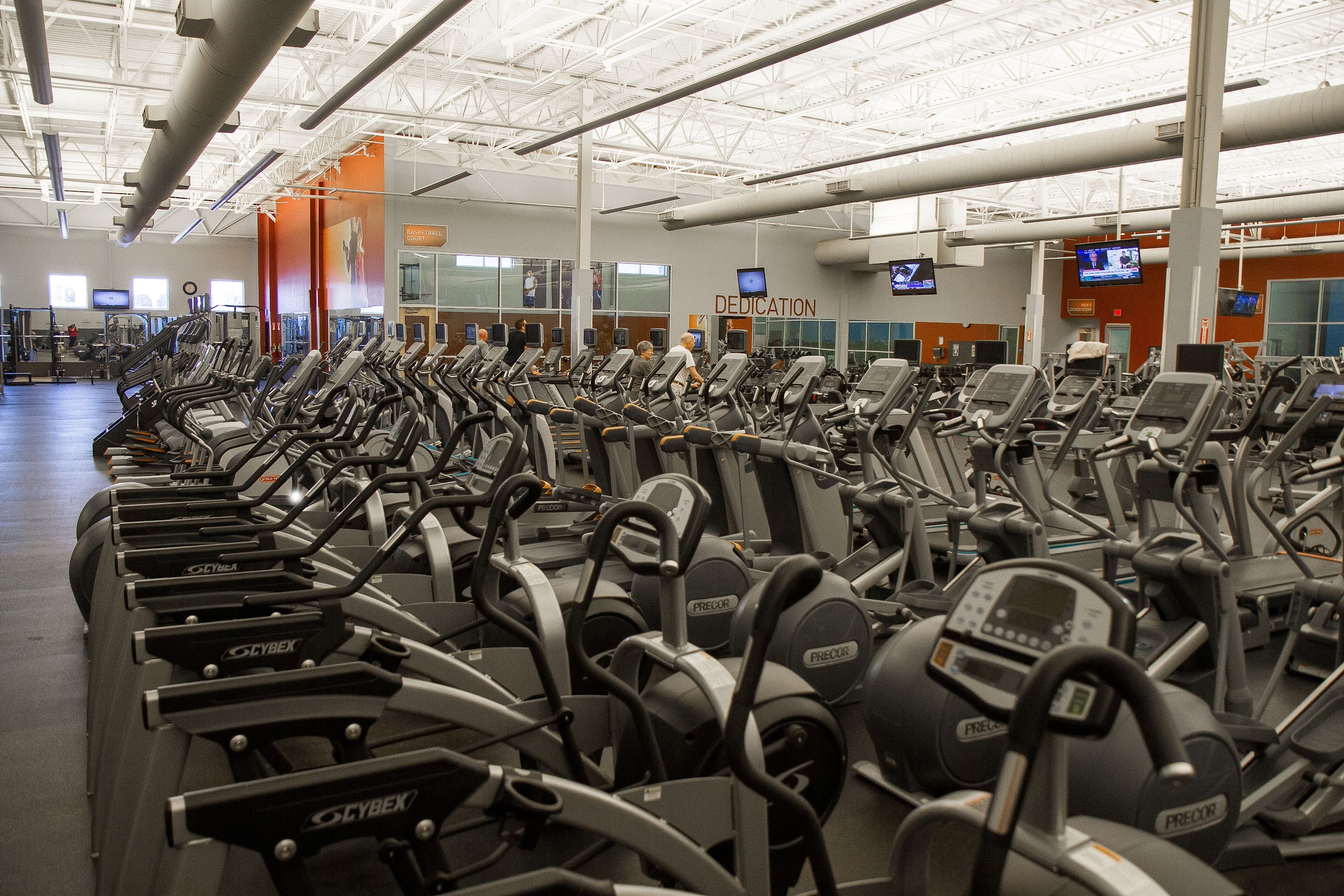 Chain gym inside the Village at Woodland Hills with a pool, hot tub, sauna, and childcare.