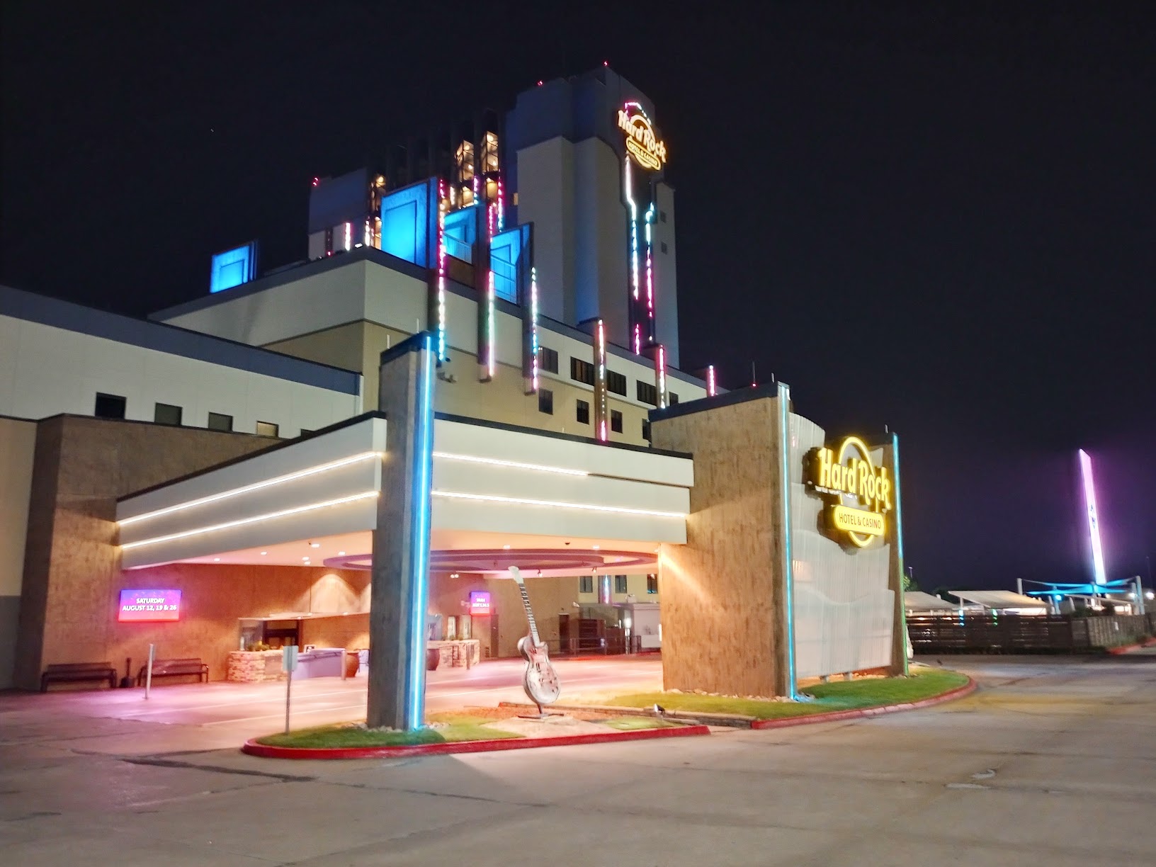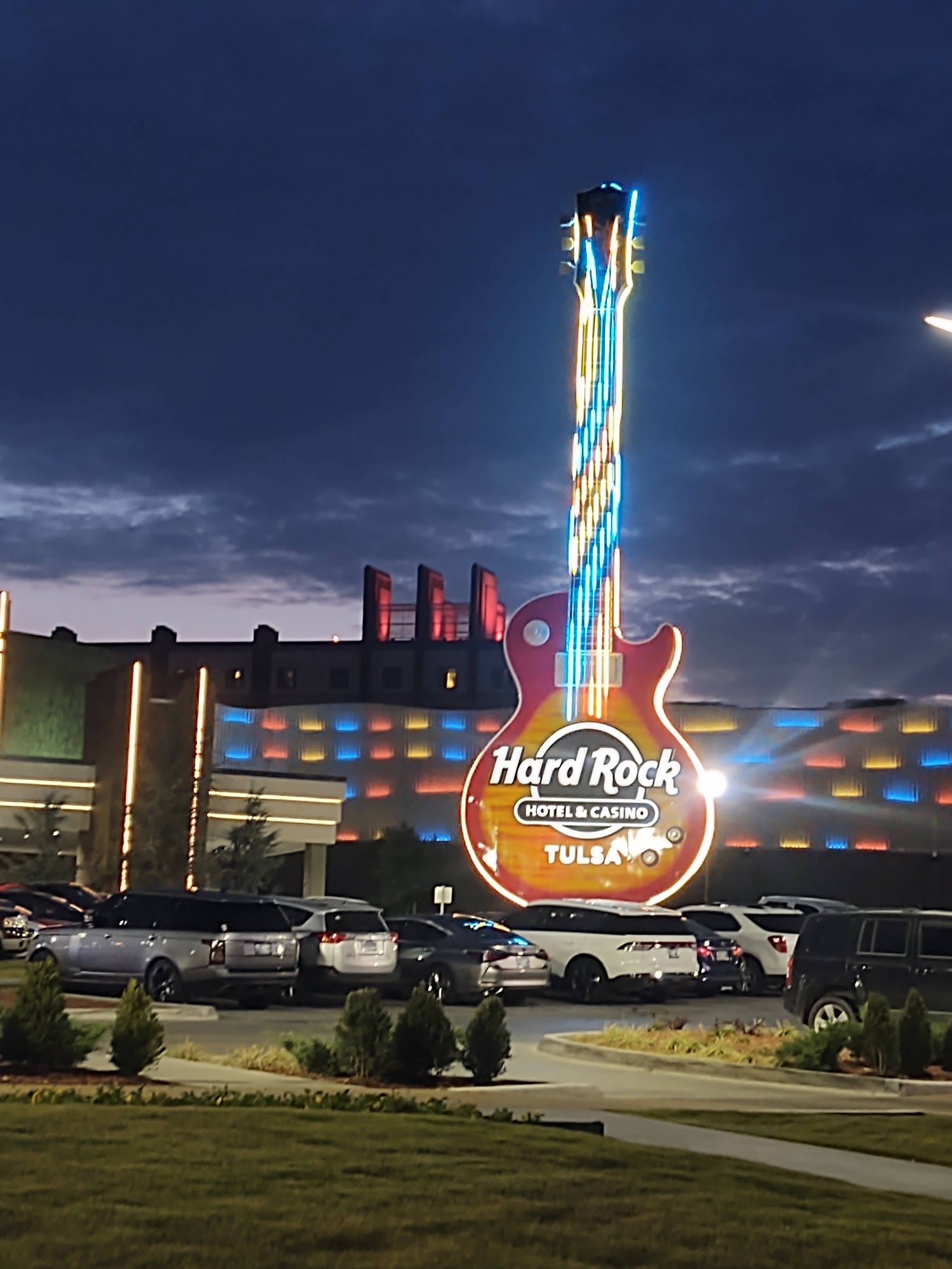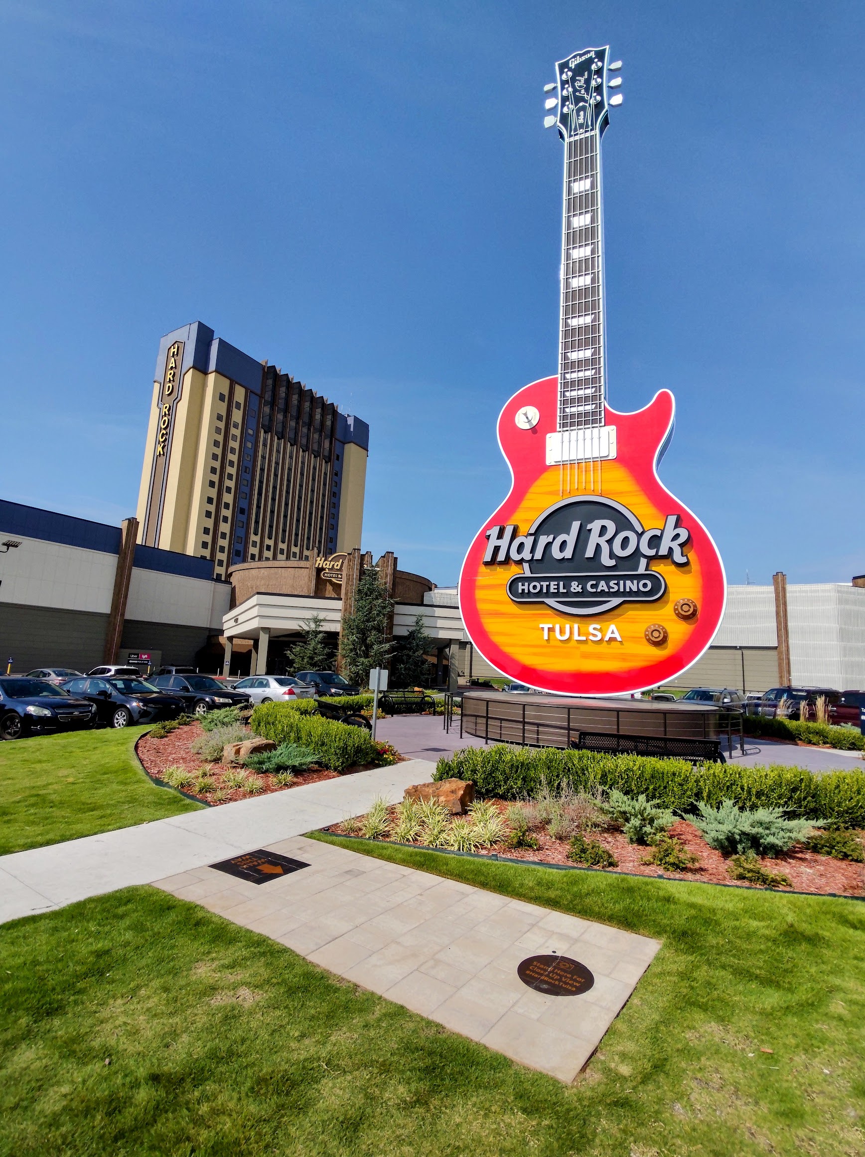 The Hard Rock Hotel & Casino Tulsa is a comprehensive entertainment resort located in Catoosa, Oklahoma. It features a large casino with a wide array of gaming options, a luxury hotel, multiple dining establishments ranging from casual to upscale, a dedicated live music and event venue, an 18-hole golf course (Cherokee Hills Golf Club), a spa, and typically an outdoor resort-style pool. The property is known for its rock-and-roll theme, displaying music memorabilia throughout.