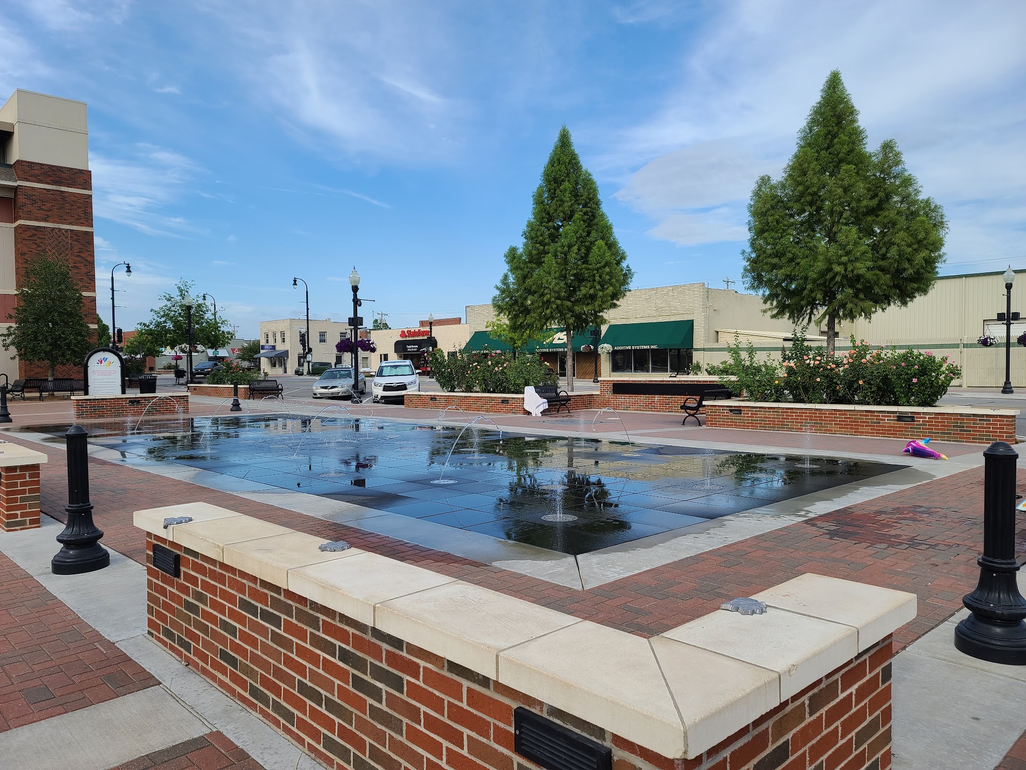 Popular destination featuring a fountain and splash pad where kids can play in the water and adults can relax.