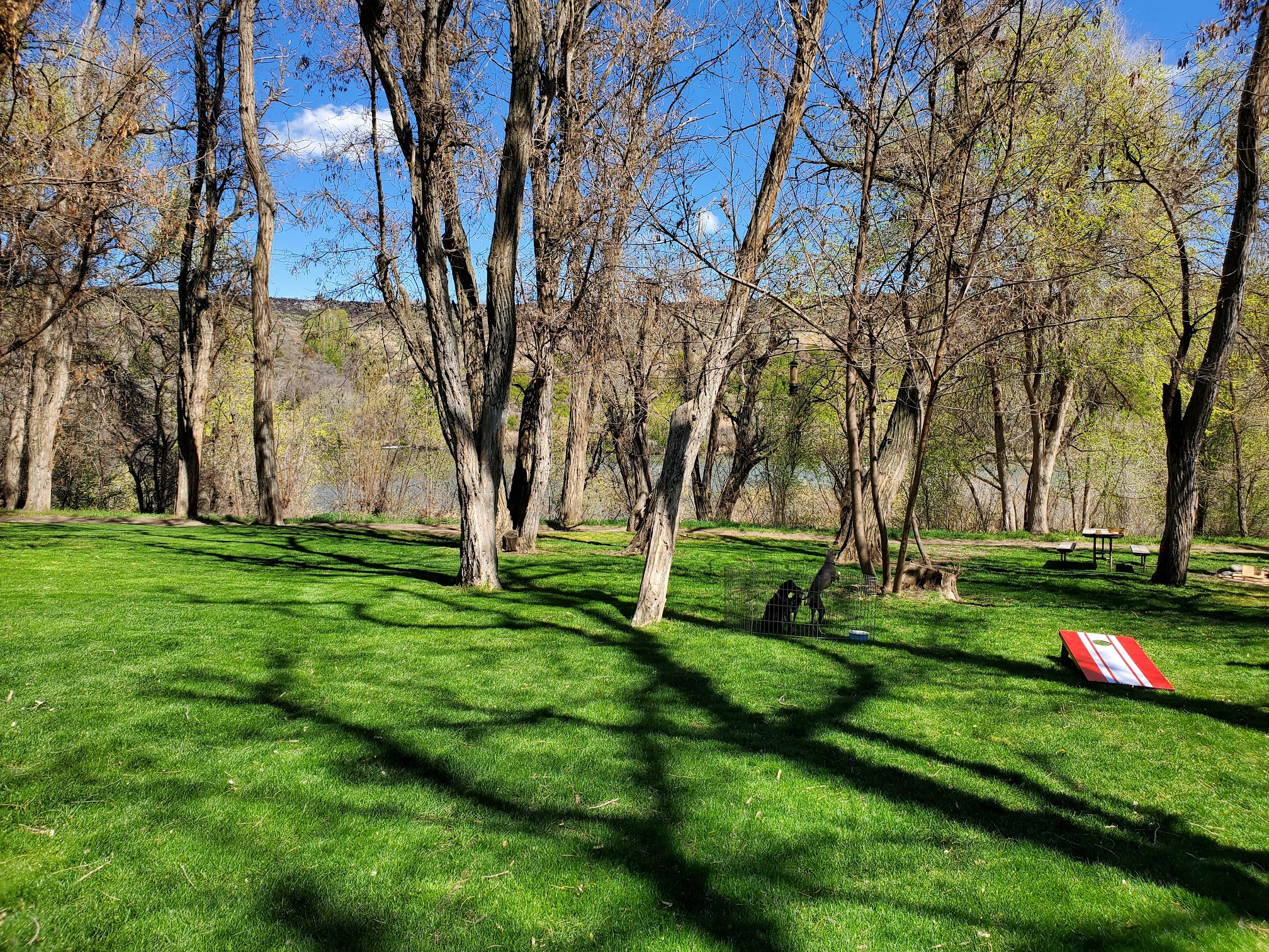 Huge awesome natural pool! Diving board. Floating log! Basketball hoop. ..such a great place. We launched kayaks from there.