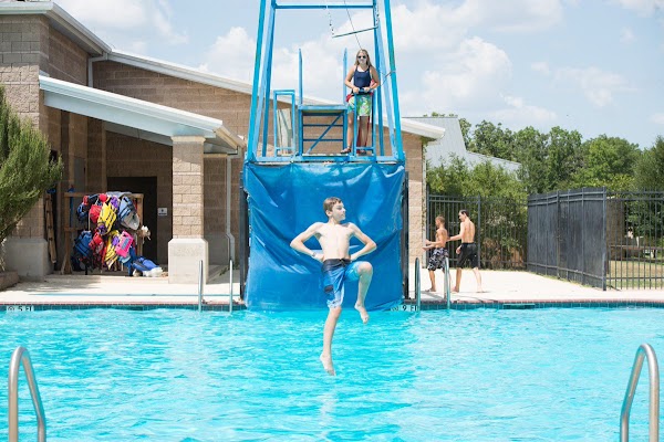 Sky Ranch - Party Pool, located at Sky Ranch in Van, TX, is a multi-level recreational pool featuring three slides and a diving board. It serves as a popular amenity, providing hours of fun for campers and guests at the Christian summer camp and retreat center.