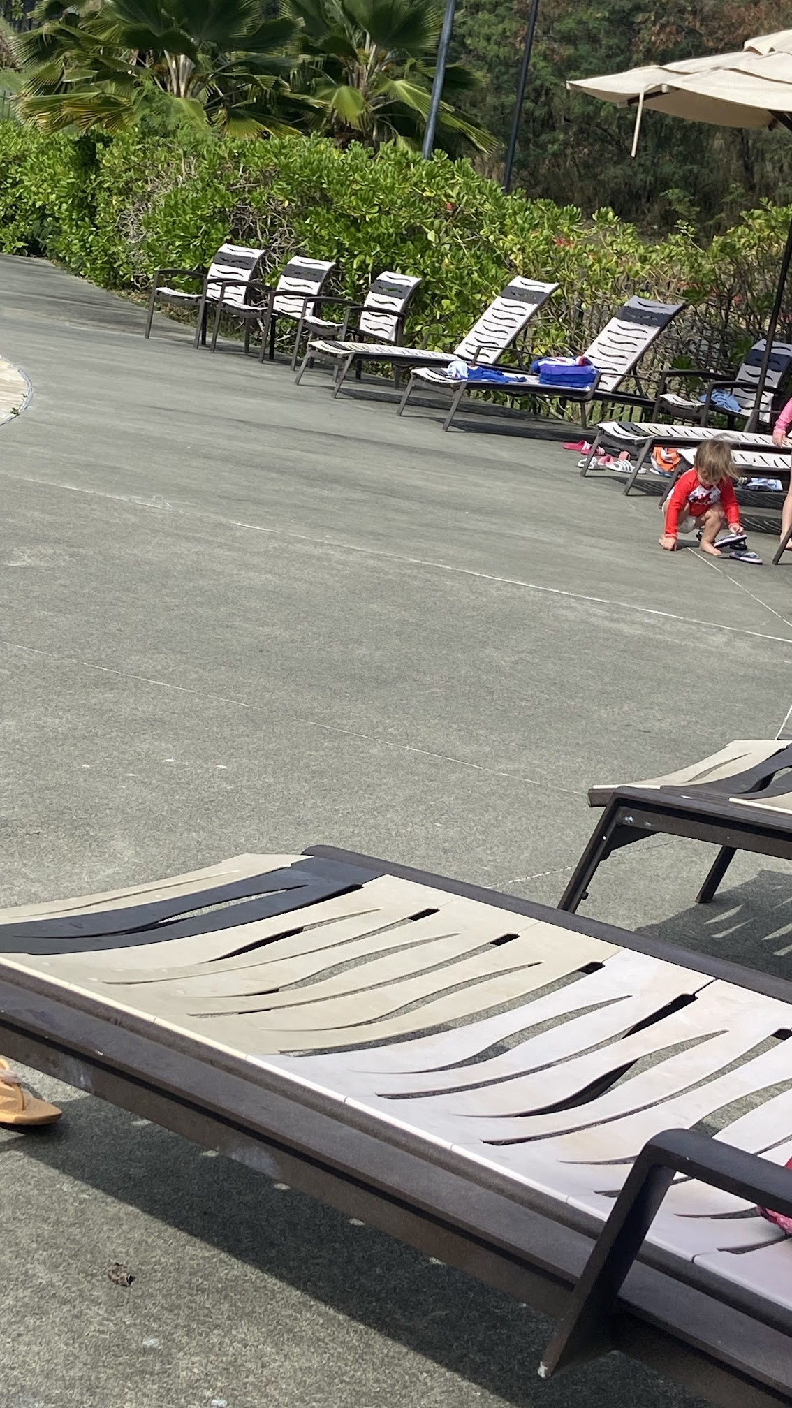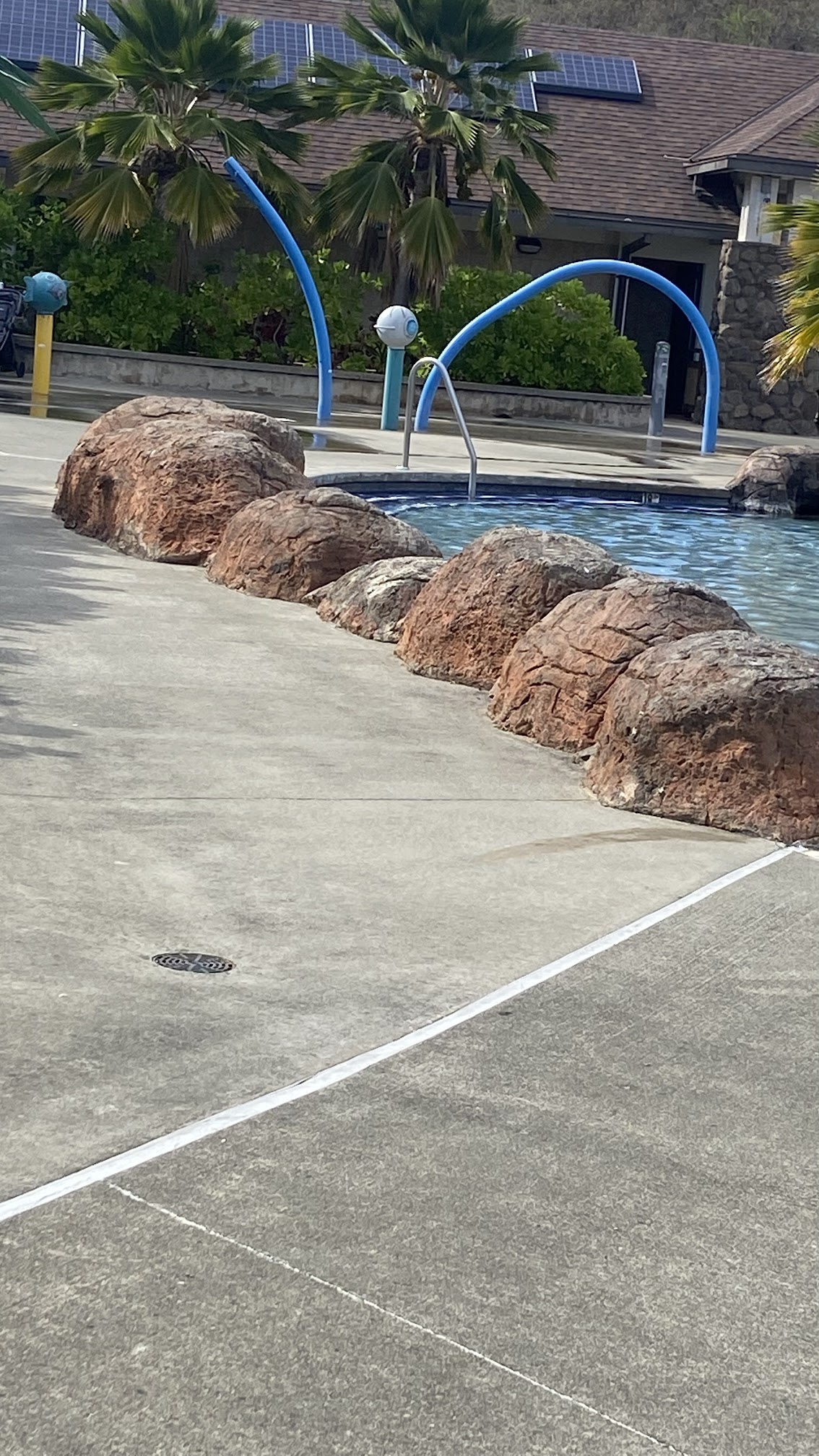 Love this pool (must have Island Palms pool pass to enter.) It has a cute, shallow children's cove and a deeper section for adults and bigger kids. The landscaping is lovely. There is a big playground next door. The pool assistant is not a lifeguard, so parents must watch their kids, but the kids get to have more fun than those pools with extra picky lifeguards. No drink vending and the snack machine is not well stocked, so bring your own.
