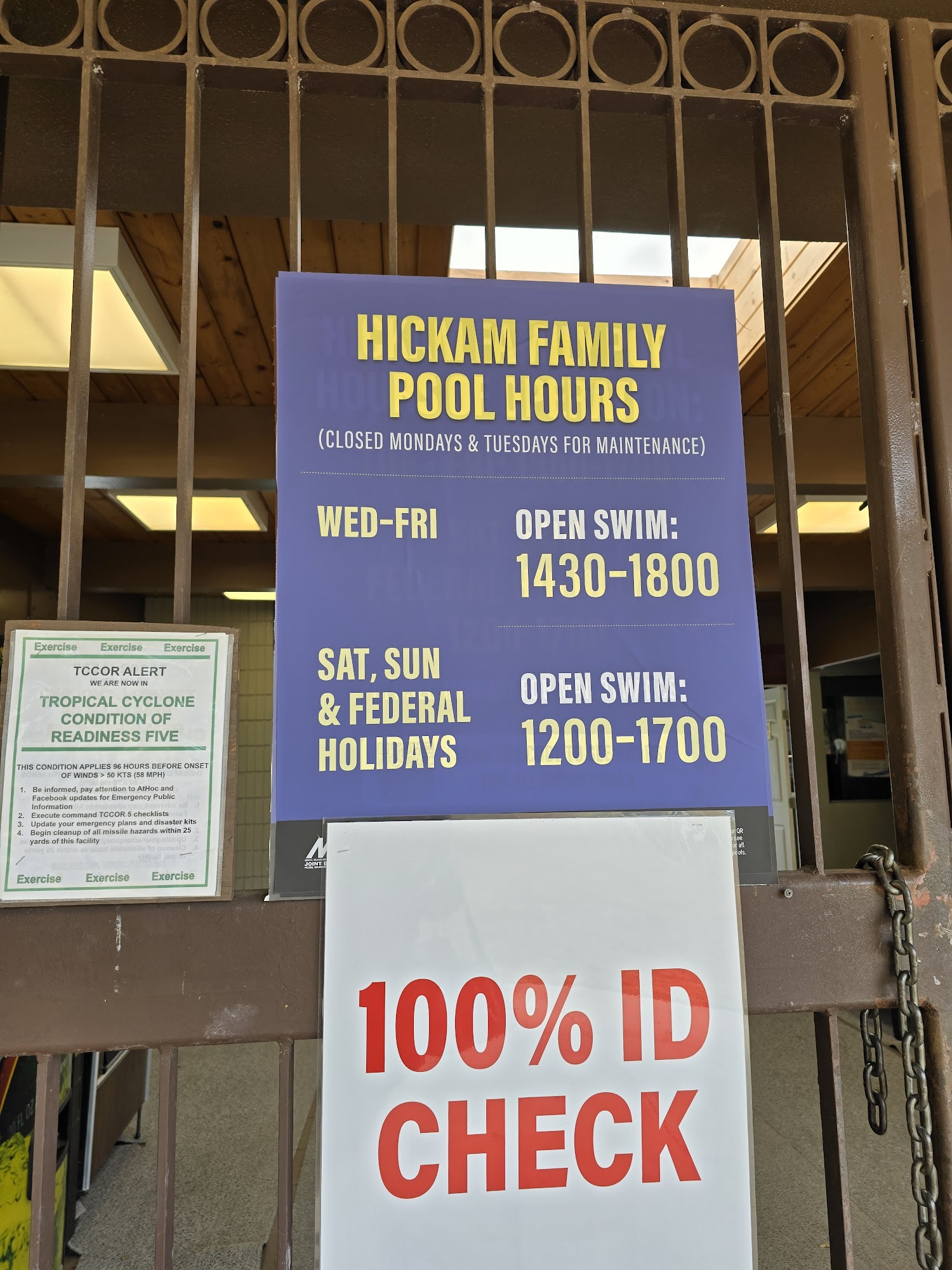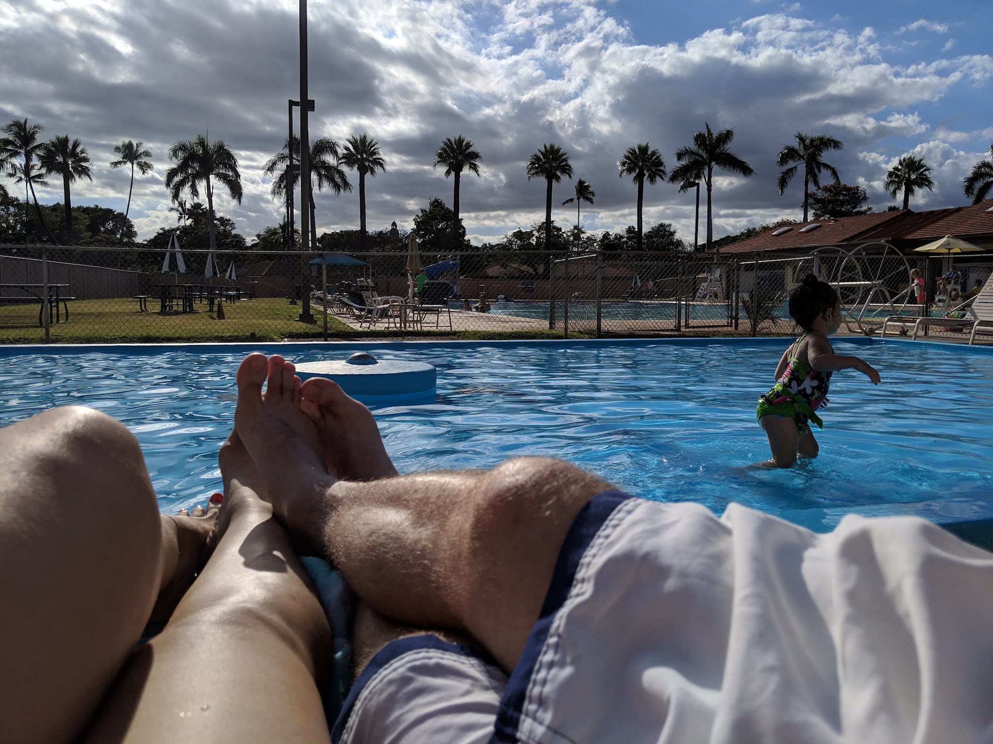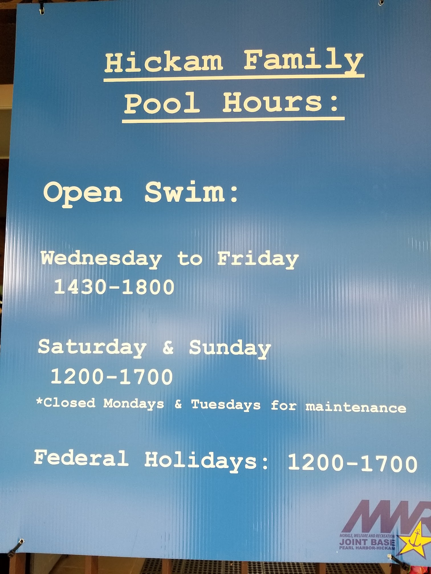 This pool is located just before the Hickam to Pearl Harbor inter-gate, behind the Hale Na Koa community center. The sign in is easy, the staff friendly. It has locker rooms and showers, and bathroom facilities which are clean. The pool is large, with infinity type edges, and is very clean. It is broken up into thirds from shallow to deep end which is about 10 ft. 1st third is waiting and family, middle third has about 4 swimming lanes and the deepest third for a cool tube slide and swim area. It if course has pool chairs and tables as well as a covered area with seating. What I found to be great is they have all the gear for aqua therapy minus bells and weights which is why I was going there but bringing my own. Now I will only need to bring bells and weights. Since the lap swim is crosswise in this pool it may not be a lap swimmers 1st choice, but pool 1, the training pool has that down the street.